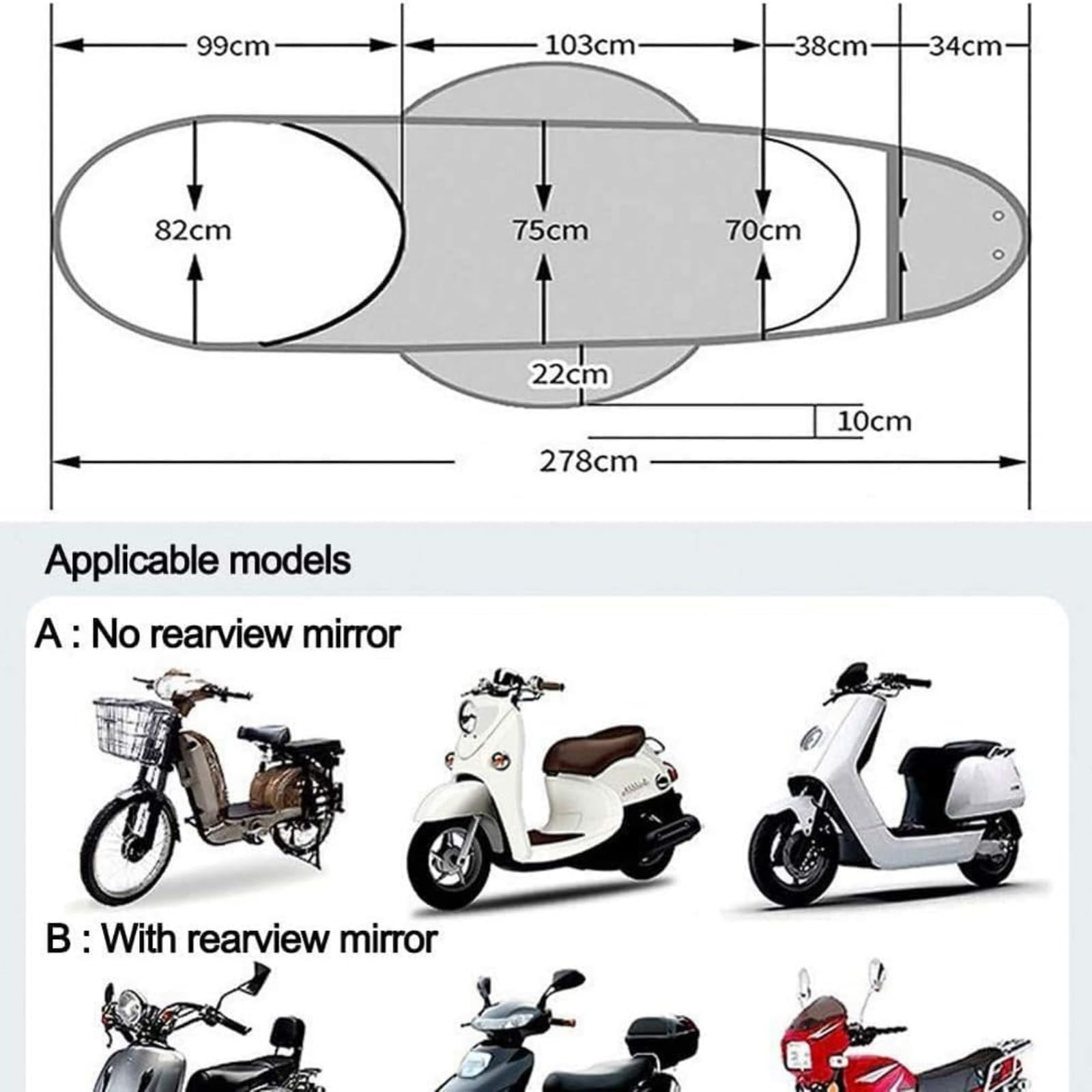 Tablier Scooter Parapluie De Moto, Ombrelle De Protection Contre Le Soleil Et La Pluie, Canopy Pour Voiture électrique, Parapluie Universel Pour Scooter Et Moto, Protection Contre Le Soleil Et La Pluie Robuste et adaptée à la plupart des scooters, elle est également dotée d'un revêtement intérieur en PVC transparent. À l'extérieur, une couche imperméable assure une protection efficace contre la pluie. · Conçu avec un panneau avant plus long, ce pare-soleil protège du soleil... Fabriquée à partir de tissu polyester léger avec revêtement thermique à l'intérieur, cette housse offre un ajustement simple et universel pour la plupart des scooters mobiles Son revêtement en plastique noir épais protège votre véhicule de la chaleur et du soleil. Conception à bande réfléchissante : L'auvent de pluie pour scooter électrique est doté d'une bande réfléchissante de sécurité unique, conçue pour la conduite de nuit. Voiture Moteur Scooter Universel Protection Solaire Housse de Pluie Moto Parapluie pour Protection Solaire Protection Contre la Pluie étanche,H Elle est dotée de bouchons avant et arrière en PVC transparent. Facile à retirer lorsqu'il n'est pas utilisé, se replie à plat pour un rangement facile. L'élasticité est très grande. Haute qualité : La barre courbée en fer pour auvent de scooter est plus épaisse et reste stable par vent fort. Veuillez tenir vos mains et l'ouvrir lentement dans un espace ouvert ! Conception transparente : La conception transparente de la housse pour scooter électrique permet de voir facilement ce qui se passe à l'extérieur et de la protéger de la pluie. De plus, son étanchéité est durable et efficace. Fonction : Pare-soleil/vent/pluie pour moto et voiture électriquePersonnes concernées : Convient à tous les types de motos électriquesTaille :C (sans rétroviseurs) style moto/vélo électriqueB (avec rétroviseurs) modèles moto/vélo électriqueEmballage : Housse pour scooter de mobilité * 1Attention :1., En raison des différents écrans et effets de lumière, la couleur réelle de l'article peut être légèrement différente de celle présentée sur la photo., 2., Ouvrez le sac avec précaution, ouvrez le haut et ouvrez la barre en fibre pliée.