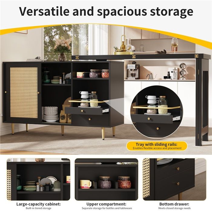 Se transforme facilement en table à manger pour différentes occasions. Ce buffet-bar offre des solutions de rangement intelligentes. Cette table bar extensible et multifonction combine bar, table à manger et espace de rangement. Avec éclairage LED contrôlé par application, modes musique et ambiance, elle crée une atmosphère conviviale pour vos repas et soirées. Longueur réglable de 120 à 180 cm, adaptée à différentes situations Dimensions télescopiques 135–203×39×92,8 cm avec plateau rotatif 360° pour partager facilement Éclairage led multicolore pilotable par application, fonction musique/micro et port usb intégré 4 tiroirs et étagère latérale pour un grand rangement, plateau mdf et inserts verre, poignée métal Descriptif produit Caractéristiques Avis... 【Buffet-table de bar multimodal】 : polyvalent, il peut être utilisé comme buffet de rangement, table de bar, table à manger ou table de travail. Table bar extensible noire avec rangement, rotation 360°, façade en Idéal pour les besoins de la vie moderne. Cette table de bar est à la fois une solution pratique pour les repas et un élément décoratif. Meuble Bar Cuisine Meuble De Bar Rotatif - Table De Bar Extensible Avec éclairage LED Et Porte Coulissante En Verre 4 Rangements Ouverts Blanc Ilot Central Cuisine Avec Table 6 Personnes 【Système de table à rallonge (120-180 cm)】 : système innovant de rallonge de 120 à 180 cm. 【Design élégant et multifonctionnel】 : panneaux MDF/PB de haute qualité avec plateau décoratif et poignées métalliques stylées. Son design élégant combine parfaitement les fonctions d'un buffet et d'un bar.