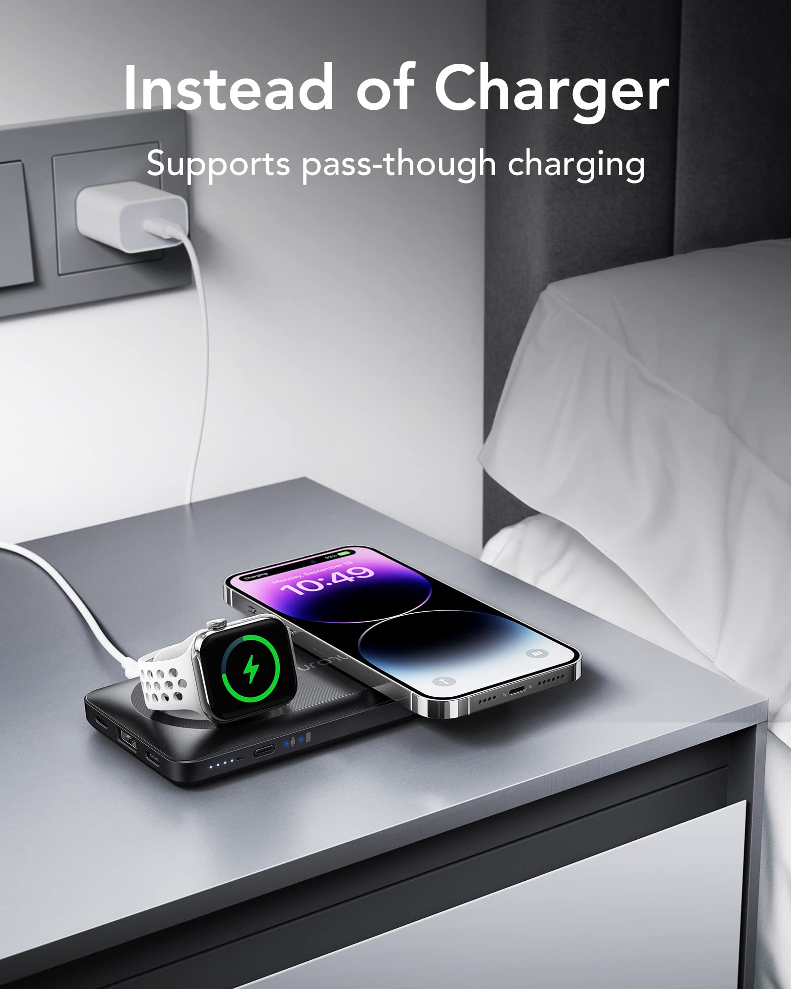 La sortie sans fil de l'iPhone et de l'iwatch prend en charge respectivement jusqu'à 15 W et 2,5 W. -Tous les autres objets étrangers, y compris, mais sans s'y limiter, les objets métalliques, ne doivent pas être placés sur la surface de chargement sans fil. Attention : la fonction magnétique ne fonctionne qu'avec les séries iPhone 12/13-14-15 et les coques de téléphone magnétiques. 🔋【Charge rapide de 22,5 W】Le batterie externe usb c prend non seulement en charge le chargement sans fil. Batterie Externe Sans Fil Samsung 10000mAh | Boutique KT -Lors du chargement sans fil, assurez-vous que votre étui de protection est retiré ou que son épaisseur ne dépasse pas 2 mm. Le chargeur de la montre est pliable à 90°. Chargement sans fil Qi 1) Placez la batterie externe au milieu de votre téléphone compatible Qi. 🔋【Chargement en toute sécurité】La batterie externe legere est dotée d'une puce intelligente intégrée (mise à jour en 2023). Réalisez une recharge sans fil multi-appareils. 🔋[Chargement sans fil 3 en 1]La batterie externe 10000mah VRURC prend en charge le chargement sans fil de l'iPhone, de l'Apple Watch et des Airpods, ainsi que le chargement sans fil de plusieurs appareils Apple en même temps (iPhone iwatch et Airpods iwatch Apple Watch 8/7/6/5/4/3/ 2/SE, Airpods 3/2/1/pro/pro 2., 🔋【Pas de prise de charge】Contrairement au chargeur magnétique sans fil, le chargeur portable sans fil n'a pas besoin d'être connecté à une prise de charge. La fonction de protection contre la surchauffe a été considérablement améliorée. VRURC Power Bank Sans Fil | Découvrez Power la Magnétique 3) Appuyez une fois sur le bouton d'alimentation pour passer en mode de chargement sans fil. Chargeur portable compatible avec iPhone 15/14/13/12/11 pro, plus, pro Max, SE/XR/XS/X/8 ou Samsung/Android etc. Et la charge Qi des séries iPhone 12/13/14-15 est limitée à 7,5 W. La powerbank magnétique est équipée d'un port de sortie USB C et de 3 ports d'entrée (éclairage IN et deux entrées de type C). Batterie Externe Iphone Magsafe VRURC Magnu00e9tique 10000mAh Power Bank USB C 22.5W Charge Rapide 3 In 1 Chargeur Portable Compatible Avec IPhone 15/14/13, IWatch 8/7/6, AirPods Pro/2 Batterie Externe Sans Fil 4) Si votre appareil ne démarre pas le chargement, voici quelques suggestions., -Ajustez la position. Le chargeur portable magnétique peut protéger votre appareil contre les surintensités, les surtensions, les courts-circuits, les surchauffes et autres effets de charge. 1 Chargeur 2 en 1 2 Magnétique plus fort 3 Port de charge rapide 4 Facile à porter 🔋【Ce que vous recevez】Le forfait comprend une batterie externe VRURC 10 000 mAh*1, un manuel*1, un câble de chargement*1.