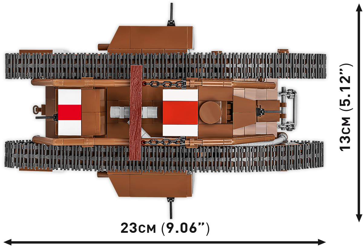 Construisez l'histoire, pièce par pièce, avec COBI. L'ensemble comprend une figurine d'officier et une plaque avec le nom et le logo du musée. COBI 1937 Horch 901 KFZ COBI SD.Kfz.251/9 Stumme 844 éléments de qualité supérieure MARK V (MALE) N.9199 848 Pièces (COBI-2995) | Oasis Ludique Dimensions du modèle assemblé à l'échelle 1:35 : 230 mm x 130 mm x 90 mm Instructions claires et intuitives basées sur des illustrations et des instructions étape par étape Maquette Construction 844 Pièces Cobi Mark V Male - Acheter Sur Maquette COBI Char Mark V Mark V est un incontournable pour les amateurs d'histoire et les fans d'armes blindées et est un beau modèle pour toute collection dédiée à la Grande Guerre. Description du produit Le char britannique Mark V (version mâle) de 1918, équipé de deux canons de 57 mm et de cinq mitrailleuses, a atteint une vitesse de 7,4 km/h et une autonomie de 65 km. Il a participé aux batailles de Gomel, Amiens et sur la ligne Hindenburg.