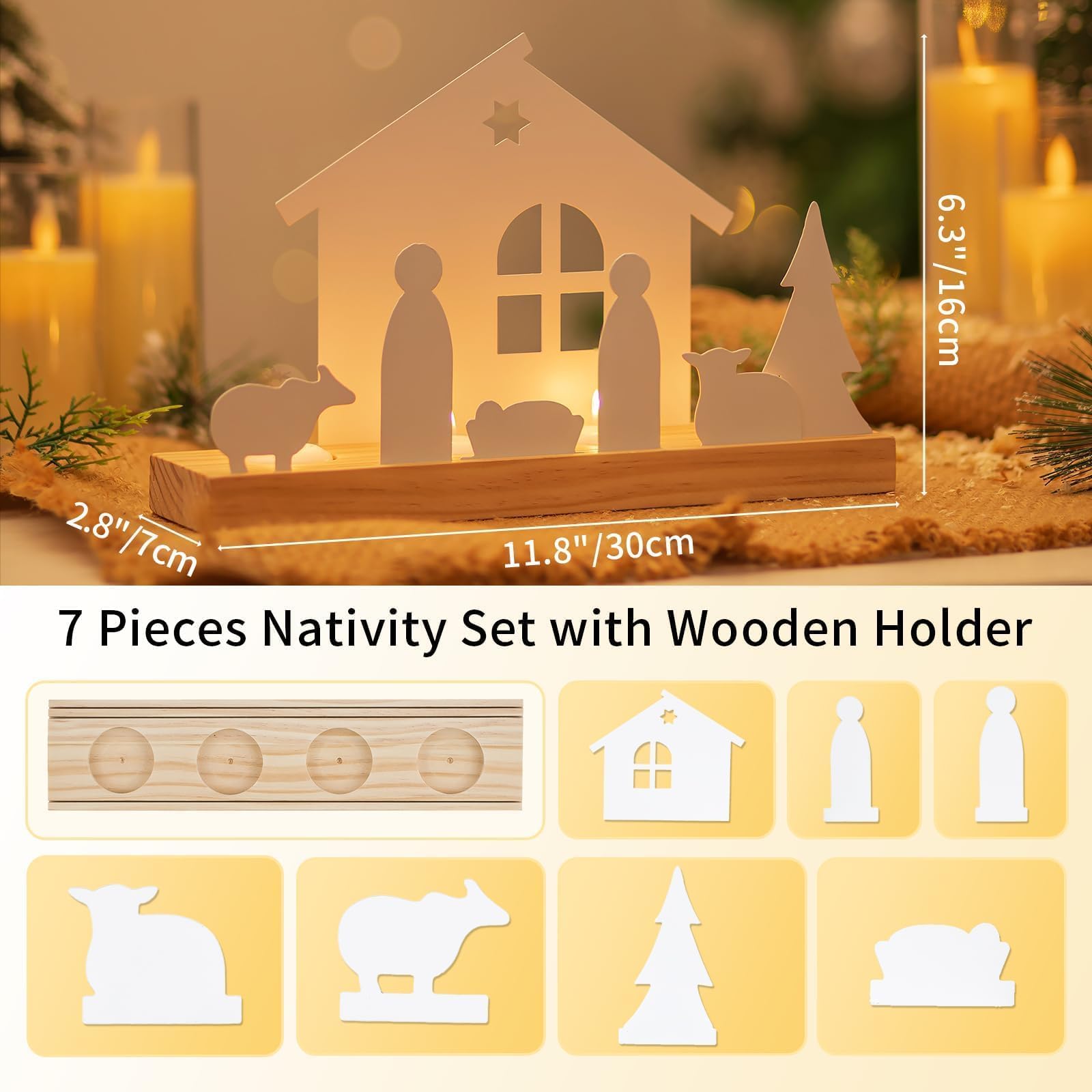 Matériaux de qualité supérieure : fabriqué à partir d'une base en bois robuste et de pièces en fer durables, il garantit une utilisation durable et une belle représentation d'année en année. C'est un bel ajout aux décorations de Noël et à la décoration intérieure. Dimensions Décoration unique de maison : notre scène de Noël nativity scene est un merveilleux centre pour votre décoration, qui apporte le charme de « décoration de maison » et « décoration de Noël » dans votre maison. Décorez votre maison avec cette scène traditionnelle et moderne et donnez vie à l'histoire de Noël dans votre maison. C'est une scène de nativité intérieure parfaite pour transmettre l'importance de la fête. Éducatif et inspirant : parfait pour l'éducation des enfants et les célébrations religieuses, ce kit nativité apporte l'histoire de Noël à la vie. Que vous soyez un collectionneur de scènes natives ou que vous recherchiez simplement un magnifique point focal pour votre décoration de fête, cet ensemble de scènes nativity est le choix parfait. Romadedi Lanterne Noel Decoration de Table - Lot de 4 Décoration Ensemble de bougeoirs de scène nativité classique : ce lot comprend sept pièces métalliques en filigrane représentant la scène de la nativité, y compris Jésus, Marie, Joseph, animaux et plus encore. La crèche de Noël en bois offre une atmosphère classique et chaleureuse qui est idéale pour tout look de fête. Décoration de crèche de Noël parfaite : cette scène noire Nativity Scene est conçue pour une exposition intérieure et ajoute une touche d'ambiance festive à votre maison. Bougeoirs pour Noël par niclasse sur L'Air du Bois Scène Nativité Métal Bois Romadedi Ensemble De Bougeoirs De Noël - Bougeoirs En Bois De Pin Crèche De Noël Bougeoirs Romadedi C'est également une idée de cadeau réfléchie et significative pour les amis et la famille pendant la fête Matériaux du produit : bois et métal Dimensions du produit : base en bois Dimensions : 30 x 7 x 2,5 cm (L x l x H) Hauteur totale après assemblage : 20 cm