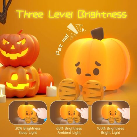Idéal comme lampe LED citrouille d'Halloween pour chambre d'enfant, table de chevet ou décoration saisonnière. EN STOCK : Petite veilleuse LED citrouille, lampe de chevet en Silicone à intensité variable, veilleuse tactile Rechargeable pour la décoration d'halloween, 8380024196975 pas cher. Livraison rapide partout en France Cette veilleuse flexible à intensité variable s'éteint automatiquement après 30 minutes et protège ainsi contre la surchauffe., 2., Avec alimentation USB, la veilleuse citrouille d'Halloween fonctionne via une batterie externe. Cette LED citrouille d'Halloween est durable, réduit les déchets de batterie. Respectueux de l'environnement et rechargeable : la veilleuse citrouille créative Halloween a un port USB-C et peut être chargée plusieurs fois. Lumière douce et douce pour les yeux : la veilleuse timer à intensité variable citrouille émet une lumière chaude qui n'éblouit pas. Cette lampe LED citrouille d'Halloween crée une atmosphère agréable pour des nuits paisibles à la maison. Design amusant : adoptez le charme délicieux de notre jolie lampe de table en forme de citrouille qui émet une lumière chaude et réconfortante. Programmée pour s'éteindre automatiquement dans 30 minutes, elle aide les enfants à s'endormir sans effort tout en jouant. Réglez la luminosité d'un simple appui sur le bas, offrant trois niveaux d'éclairage : faible, moyen et fort... Caractéristiques de la lanterne citrouille : Matériau : ABS, HIPS Couleur : orange. Lumière de nuit de citrouille, lampe LED mignonne, Guadeloupe Veilleuse LED Citrouille Minuterie Jolie Lampe De Nuit En Forme De Citrouille à Intensité Variable Pour Décoration Halloween Lumineuse Fonction minuterie pratique : la veilleuse à intensité variable Pumpkin s'éteint automatiquement après 30 minutes. Tension nominale : 5 V, 1 A. Température de couleur : 3000 K., Puissance nominale : 0,5 W. Contenu de l'emballage : 1 lanterne citrouille. Design d'Halloween mignon : la veilleuse citrouille créative d'Halloween combine des éléments de citrouille et de fantôme et crée une ambiance festive.