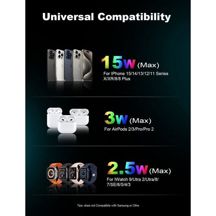 Chargeur sans fil magnétique 15W pour iphone 12 ch... – Grandado Détection de corps étrangers: clignote bleu - Vert rapide pour une notification claire. Chargeur Rapide Magnetique Airpods Chargeur Magnétique Sans Fil - 15 W - Compatible Avec MagSafe IPhone 16 / 15 / 14 / 13 Chargeur Portable Mince Un adaptateur de 18 W / 20 W ou plus est nécessaire pour prendre en charge l'effet de charge de 15 Watts. Pour une meilleure expérience de charge rapide, nous vous recommandons fortement d'utiliser un adaptateur secteur de 18 W / 20 W ou plus (sans adaptateur). Si vous avez des questions sur les produits, s'il vous plaît contactez - nous et nous fournirons un service à la clientèle amical pour vous aider à résoudre le problème. Chargeur magnétique sans fil 3 en 1 Zens Chargeur sans Fil, Zestiq Chargeur Induction 15W Wireless Charger Stand Les gaines de protection ordinaires affaiblissent l'adsorption magnétique et un boîtier compatible magsafe est recommandé. Conception portable et compacte: notre carte de charge magnétique adopte une conception simple et mince, une taille compacte, une épaisseur de seulement 0,7 cm et un poids de 70 G, ce qui la rend facile à transporter, que ce soit à la maison, au Bureau, en voyage, à la bibliothèque, pour résoudre les problèmes de charge à tout moment, n'importe où. Adsorption magnétique de précision forte: matrice magnétique forte à 4 segments intégrée, alignement automatique de la position de charge lors de la charge, solide et pas facile à décaler, chargement et déchargement.