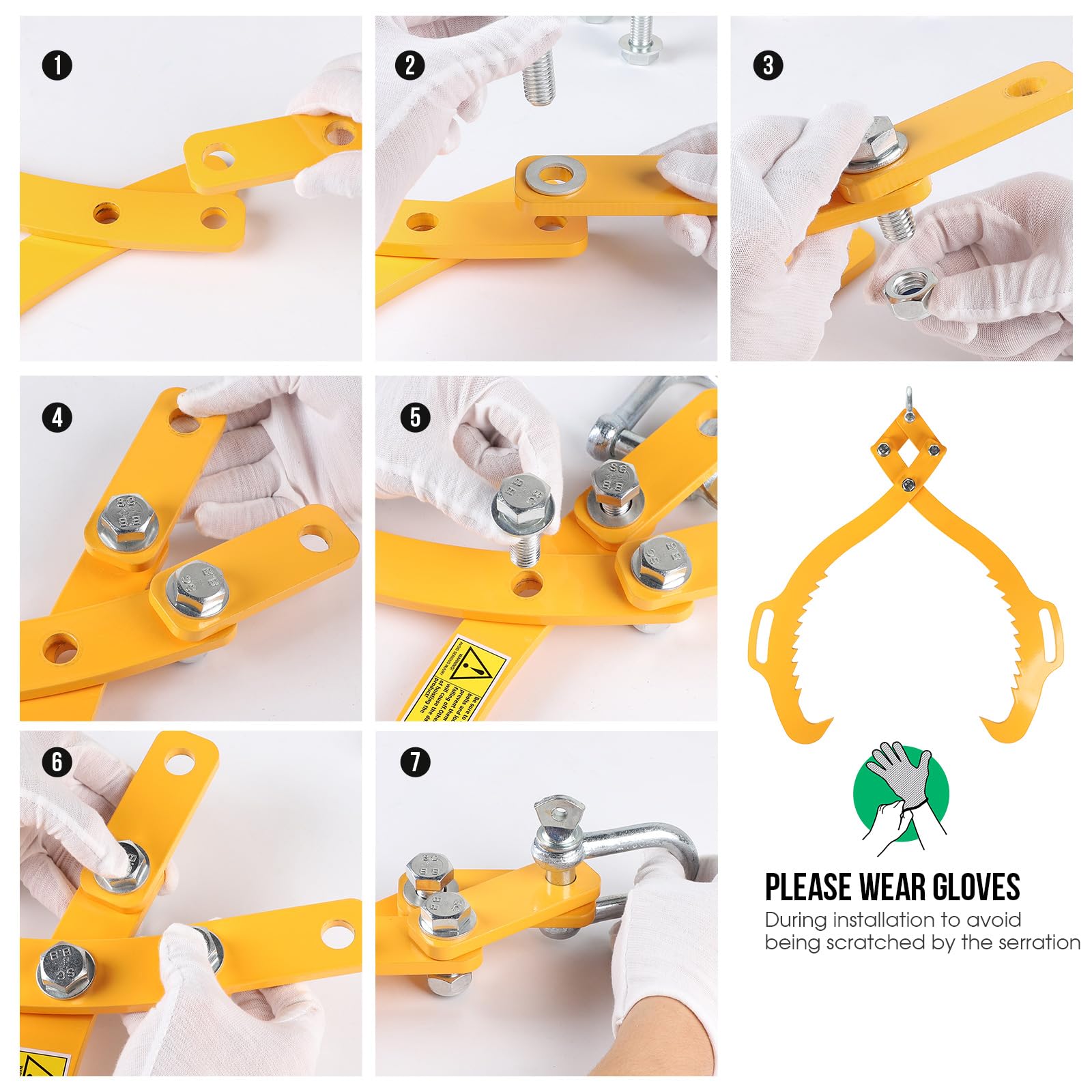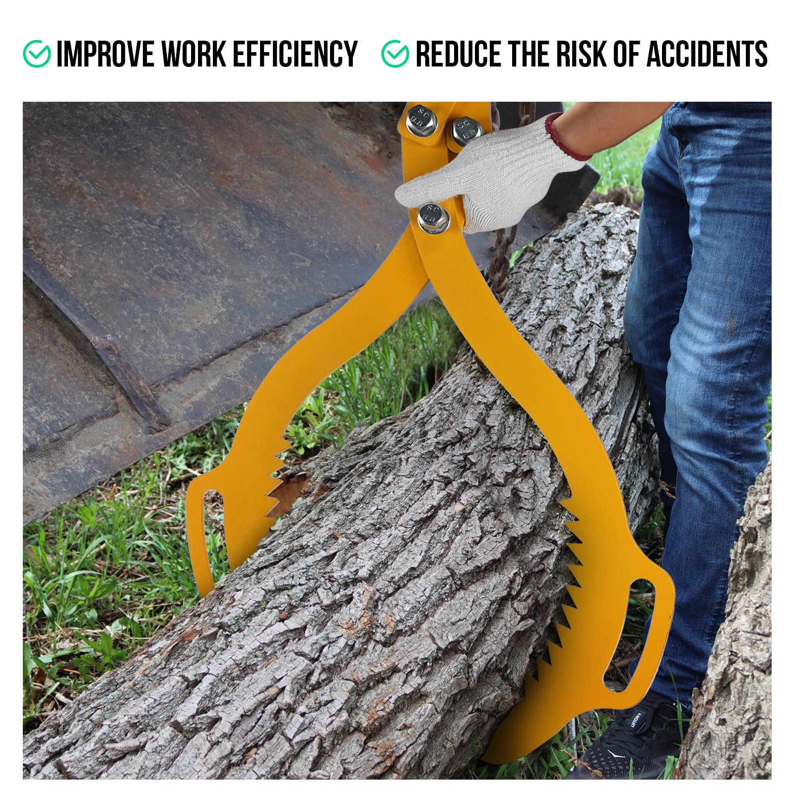 La surface est traitée par pulvérisation, ce qui la rend plus résistante à la corrosion. En acier allié, elle supporte 1000 kg et saisit des troncs jusqu'à 620 mm de diamètre. Ses dents antidérapantes et sa couleur jaune vive assurent sécurité et visibilité Elle peut être utilisée efficacement dans des environnements à basse température. Connectez-les avec des chaînes et utilisez-les pour transporter les grumes, etc. Elle peut être utilisée dans divers scénarios tels que le transport du bois, les opérations forestières, les sites de coupe de bois et les sites de transformation du bois. 🪚【Amélioration de l'Efficacité】 Utiliser cette pince de levage pour grumes permet de transporter rapidement et efficacement les grumes, économisant ainsi de la main-d'œuvre et du temps, et en utilisant des opérations mécaniques pour améliorer l'efficacité du travail. 🪵【Polyvalence】 Cette grappin lourd griffe à bois robuste est adaptée aux troncs d'arbres d'un diamètre maximum de 460mm, et la capacité de charge maximale peut atteindre 800 kg. Pince Bois Griffe Grume Levage Matériel Forestier Bille Fendeuse Treuil... Cette pince à bûches ergonomique est conçue avec des dents de scie au milieu, ce qui augmente la friction entre elle et la bûche, permettant une manipulation sûre et efficace des bûches. Pince à grumes pour mini-pelles - Tous les fabricants de l'agriculture VEVOR Pince Forestiere Pour Troncs 710 Mm, Pince De Levage Pour Bois Buches Grumes Pivotante 4 Griffes Capacite De Levage 453 Kg Pinces En Acier Robuste Pour Camions Tracteurs Chariots Elevateurs 88727156 De plus, la couleur jaune vif de la pince à grumes assure une haute visibilité, facilitant sa localisation dans la forêt et réduisant les risques d'accidents. Le mandrin de serrage est flexible et peut saisir fermement la bûche, convenant pour saisir des troncs d'arbres d'un diamètre maximum de 460mm. La pince à grumes robuste peut être connectée à des outils tels que des camions de traction, des véhicules tout-terrain, des tracteurs et des débusqueurs avec une chaîne. Elle peut ensuite être utilisée dans divers scénarios comme le transport de bois, les opérations forestières et la transformation du bois, permettant d'économiser de la main-d'œuvre et des coûts de temps tout en améliorant efficacement l'efficacité du travail., 𝐌é𝐭𝐡𝐨𝐝𝐞 𝐝'𝐢𝐧𝐬𝐭𝐚𝐥𝐥𝐚𝐭𝐢𝐨𝐧 : 1., Connectez les deux mandrins de serrage avec des boulons en U ; 2., Placez la pince à bûches relativement à plat, alignez les trous sur le mandrin avec les trous sur la pince à bûches, puis serrez avec des vis. (Veuillez vous référer aux images pour des instructions spécifiques) 𝐑𝐞𝐦𝐚𝐫𝐪𝐮𝐞 : 1., Veuillez installer ce produit à deux personnes pour éviter les blessures ; 2., Utilisez deux clés pour serrer les vis ; 3., Veuillez porter des gants lors de l'installation pour éviter d'être éraflé par les dents de scie.