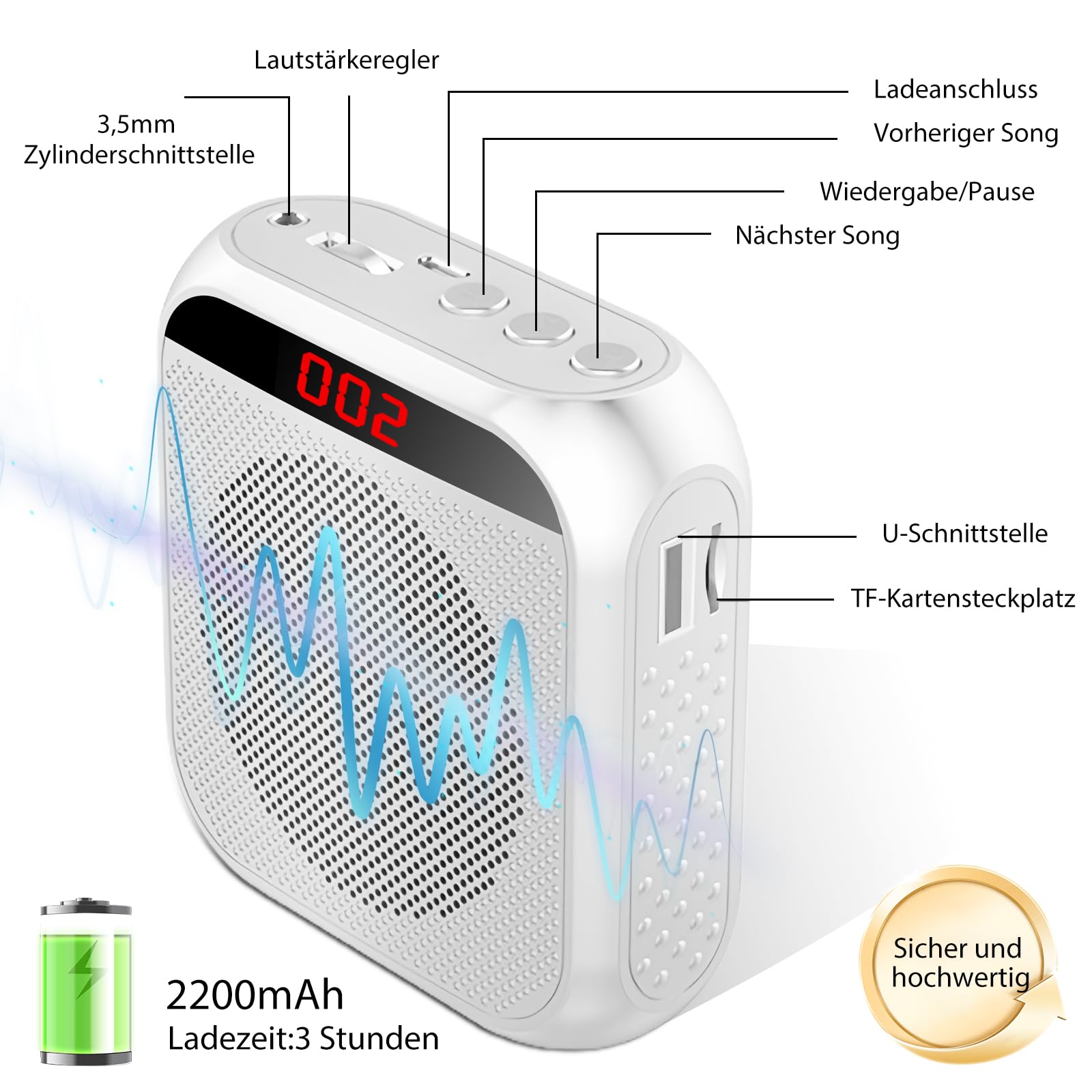 Description du produit Vvikizy Mini-amplificateur de Voix, Haut-Parleur Portable avec Un Microphone de Casque pour Les Réunions D'enseignement en Extérieur en Haut-Parleur de 3 Pouces 2200mAh Batterie U Amplificateur vocal polyvalent - En plus de prendre en charge le disque U / carte TF, cet amplificateur vocal peut également servir de mégafon, d'amplificateur de voix sans fil et enceinte portable avec microphone. Parfait pour les présentations, les activités de plein air et les discours publics [Plage d'utilisation multifonctionnelle et large] Cet amplificateur vocal portable est livré avec un microphone de casque offrant une large gamme d'applications. Il s'adapte à différents besoins en entrée sonore, ce qui en fait un outil polyvalent pour diverses exigences de lecture audio. Que vous enseigniez dans une grande salle de classe ou que vous vous présentez dans un environnement bruyant, cet amplificateur garantit une qualité sonore exceptionnelle. Micro Cravate Portable Mini Amplificateur De Voix Portable 2200 MAh Compatible Audio Au Format MP3, Disque U Et Carte TF Peuvent être Utilisés, Pour Les Enseignants, Les Chauffeurs De Taxi, Les Entraîneurs, Les Entraîneurs Mini Amplificateur Batterie 2200mAh C'est pour les promotions de centre commercial de classe et d'autres scénarios de parole en public. Profitez de la commodité de jouer des leçons ou des présentations pré-enregistrées directement à partir de votre lecteur USB ou de votre carte mémoire. La sortie audio est stable et pas facilement déformée en veillant à ce que votre voix soit entendue haut et fort. [Conception compacte et portable] L'amplificateur vocal dispose conception légère et portable, ce qui le rend idéal pour l'enseignement des réunions et diverses activités de plein air. Amplificateur de voix multifonctionnel portable, haut-parleur vocal [Options de saisie du son polyvalente] Ce mini amplificateur vocal prend en charge plusieurs modes d'entrée sonore, y compris les emplacements USB et carte mémoire. Light-1 PC portable sans fil amplificateur de voix multifonctionnel son...