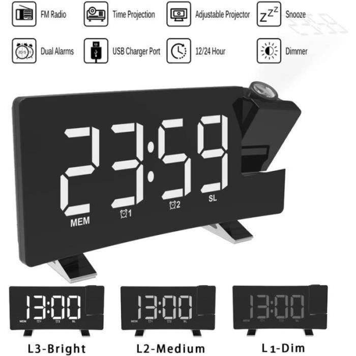 L'horloge de bureau pour chambre à coucher affiche l'heure, la température et l'humidité sur un écran LED, ce qui en fait un ajout polyvalent à tout espace Spécification: Matériel produit: ABS Poids du produit: 216g Taille du produit: environ 19,3x4x8,7 cm / 7,6x1,57x3,43 pouces Besoin d'être branché FONCTIONS: Projection de temps / température commutation d'unité / luminosité Réglage / Affichage d'humidité / Rappel d'alarme / Affichage de la température Liste des produits: 1 * horloge de projection Notes: En raison de différents paramètres d'éclairage et d'écran, la couleur du produit peut être légèrement différente de l'image. Design ABS Compact 19.3x8.7cm Rudiaoa Réveil LED À En Bois À Avec Projection L'heure Affichage Température L'humidité Réglage Luminosité Réveil Projection LED Réglable Réveil Projecteur L'horloge numérique de chambre à coucher est dotée d'un écran LED offrant une visibilité claire de l'heure, ainsi que des informations sur la température et l'humidité, ce qui en fait un choix polyvalent pour différents utilisateurs, y compris les adolescents, adultes, seniors, étudiants, passionnés de technologie et voyageurs. Module de Projection Rotatif : Doté d'un système de projection rotatif à 270 degrés réglable, ce réveil projette l'heure avec netteté sur les , permettant aux utilisateurs d'ajuster l'angle d'affichage pour une visibilité optimale et un confort d'utilisation dans divers environnements, de jour comme de nuit. Précision des Mesures Climatiques : Équipé de capteurs avancés, ce projecteur d'heure pour plafond offre des lectures précises de la température et de l'humidité, s'ajustant rapidement aux fluctuations pour une tranquillité d'en toute saison et par les temps. Qiilu horloge de bureau Réveil numérique surface miroir grand écran LED... Réveil à projection de chambre à coucher, réveil numérique à affichage L'horloge améliore votre quotidien en offrant des fonctions fiables et des lectures précises, commodité et praticité pour une utilisation quotidienne. En raison de la différence de mesure manuelle, veuillez permettre une différence de taille de 1 à 3 cm. Son design élégant s'intègre harmonieusement dans n'importe quel décor, qu'il soit placé dans le salon, le bureau, l'appartement, la chambre d'étudiant, le bureau à domicile, de chevet, la coiffeuse, dans la chambre d'amis, ou même lors de déplacements ou en atelier.