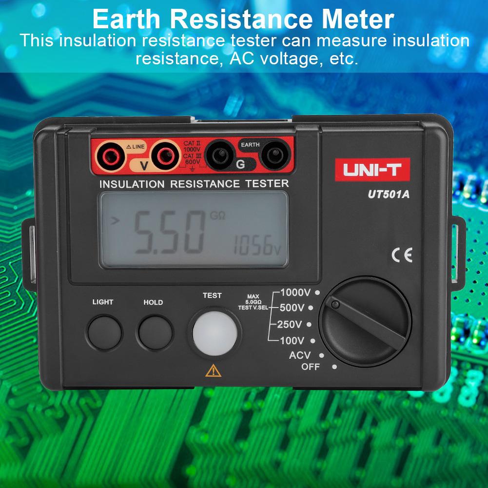 Key features* 2000 count LCD display, overload indication, backlight * AC voltage measurement, auto power off * Auto discharge * PI and DAR measurement, auto resistivity calculation * Low resistance returning to zero function to improve accuracy Multimètre Isolation Terre UT502A Isolationsmessgerät Isolationsmessgerät UNI-T UT502A Insulation Resistance Tester Megger Tester Méger Résistance De Terre UNI-T * Continuous low resistance measurement * Continuous measurements mode, red warning light and buzzer function