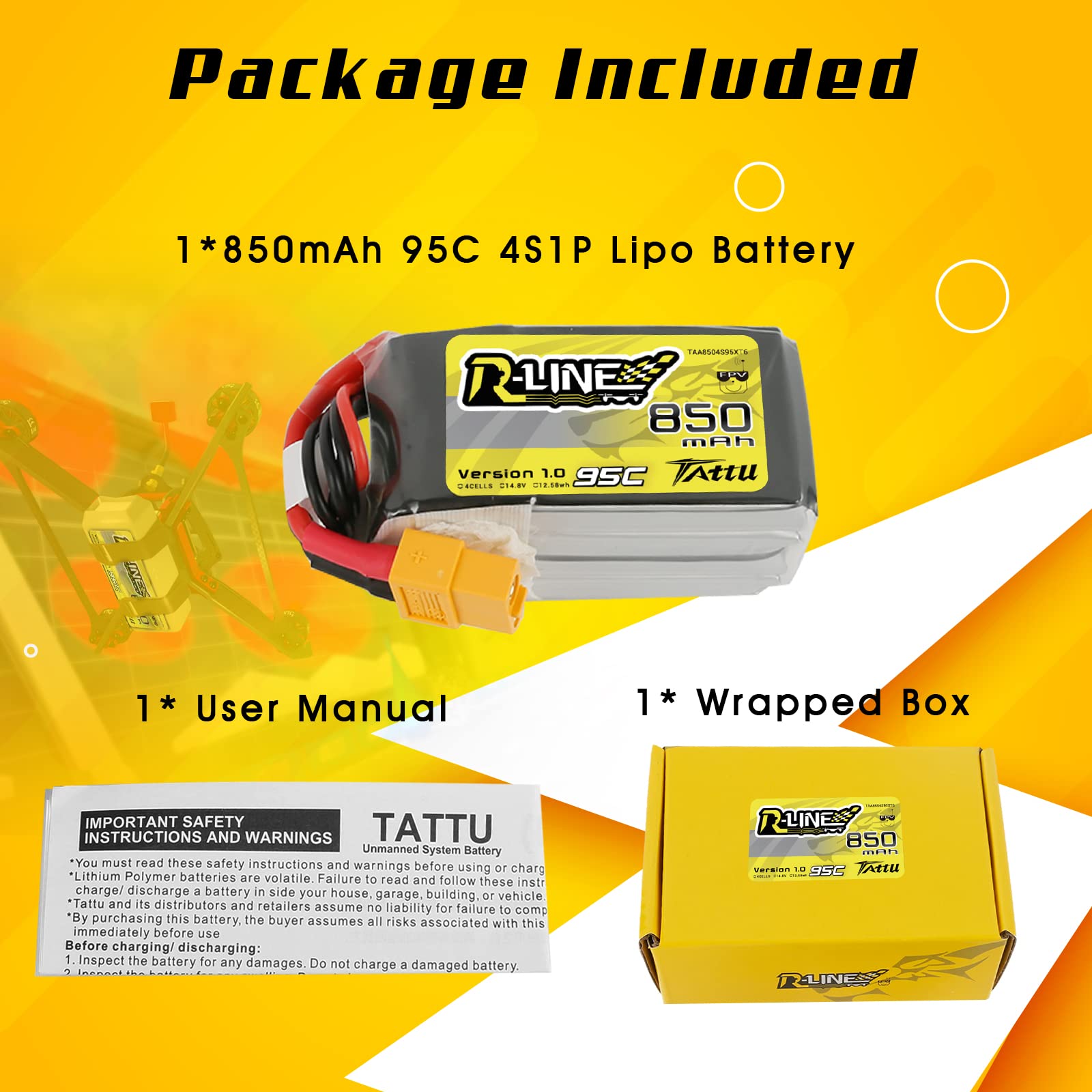 🚀【Avantage】Charge rapide, longue durée de vie (au moins 150 fois), jusqu'à 200Wh/kg de densité d'énergie, fournit une tension stable jusqu'à la fin de votre mission Tattu R-Line 4s 750mAh 95C Lipo pour la course FPV Paramètres]TATTU 4S lipo Batterie 850mAh , Cellules : 4S, Tension : 14,8 V, Capacité : 850 mAh, Poids : 112 g/0,25 lb, Dimension (L x l x H Nous sommes spécialistes des batteries lipo hautes performances, nos batteries peuvent être déchargées de manière stable en même temps. 🚀【Application】Tattu 4S Lipo Batterie 850mAh 14,8V 95C Rline version Batterie avec connecteur XT60 pour FPV multirotor de la taille 100 à 180 Batteries de propulsion avions RC - Batterie Tattu lipo 4S 14.8V 850mAh... C'est notre technologie unique 🚀【Paramètres】TATTU 850mAh 4S 95C lipo Akku, Zellen: 4S, Spannung: 14,8 V, Kapazität: 850 mAh, Gewicht: 97 g/0,21 lb, Abmessungen (L x B x H): 61 x 30 x 30 mm/2,4 x 1,18 x 1,18 Zoll, Entladestecker:connecteur XT60, Ausgleichsstecker: JST-XHR-5P, Lieferumfang: Softcase LiPo Haute Performance Tattu Tattu 4S Lipo Batterie 650mAh 14,8V 75C 4S Batterie RC Avec Connecteur Batterie Tattu 4s 850mah