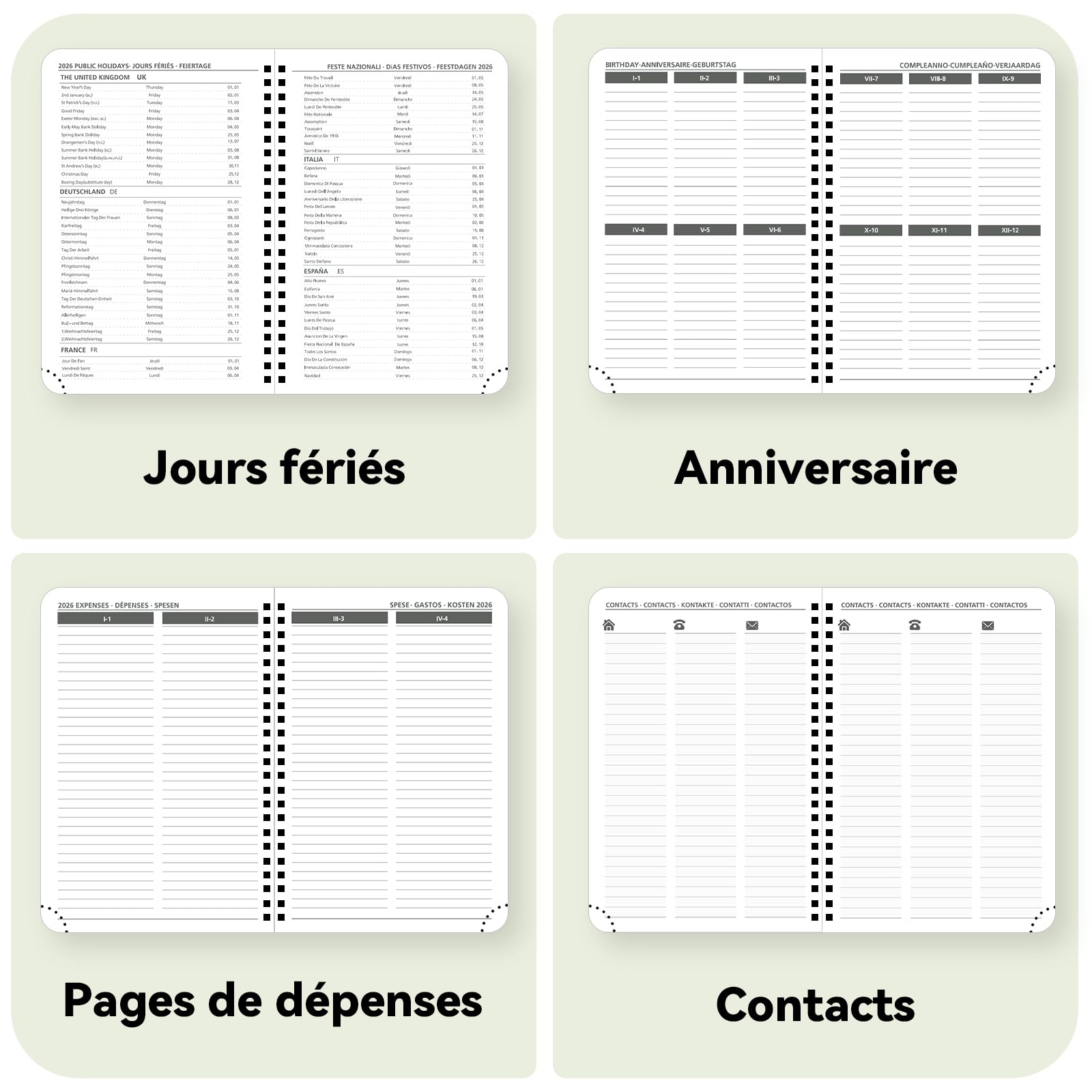 Format A5 pratique (21,3 x 14,6 cm) - 82 feuilles (164 pages) offrent beaucoup d'espace pour planifier efficacement tous vos rendez-vous de janvier 2026 à décembre 2026., L'agenda a également un format pratique de 21,3 x 14,6 cm, ce qui le rend facile à transporter dans votre sac ou votre sac à main. L'agenda multifonctionnel peut être utilisé pour planifier votre travail ou votre vie privée. Multifonctionnel - Planification annuelle | Pages de planification A5 | Compte à rebours des dates | Porte-stylo robuste | 6 pages de notes supplémentaires | Liste de contacts | Poche intérieure | Coins détachables Agenda portefeuille mince 2026 semainier - Planificateur compact à couverture souple noire - Organiseur portable léger - Agenda sac à main école voyage Pages supplémentaires - Pages de notes, pages de contacts, pages de jours fériés, pages de dates importantes, calendrier 2025 2026 avec semaines, informations personnelles, page d'anniversaires FEKSINO Agenda Semainier 2026-12 mois (janvier 2026-décembre 2026),1 semaine sur 2 pages,Couverture Souple en PU Cuir, Papier 100 g/m² (Noir, A4-28,6 x 21 cm Format 21.3x14.6cm Portable FEKSINO Agenda De Poche 2026 Semainier A6-18 X 9,8 Cm, D'Jan 2026 à Déc 2026 -12 Mois Scolaire Professionnel 2026 Semainier Avec, Couverture Rigide En Cuir PU,Noir Agenda Avec Poches Et Porte-stylo Le calendrier 2026 avec planification mensuelle a été conçu pour maximiser la productivité. L'agenda multifonctionnel peut être utilisé pour planifier votre travail ou votre vie privée