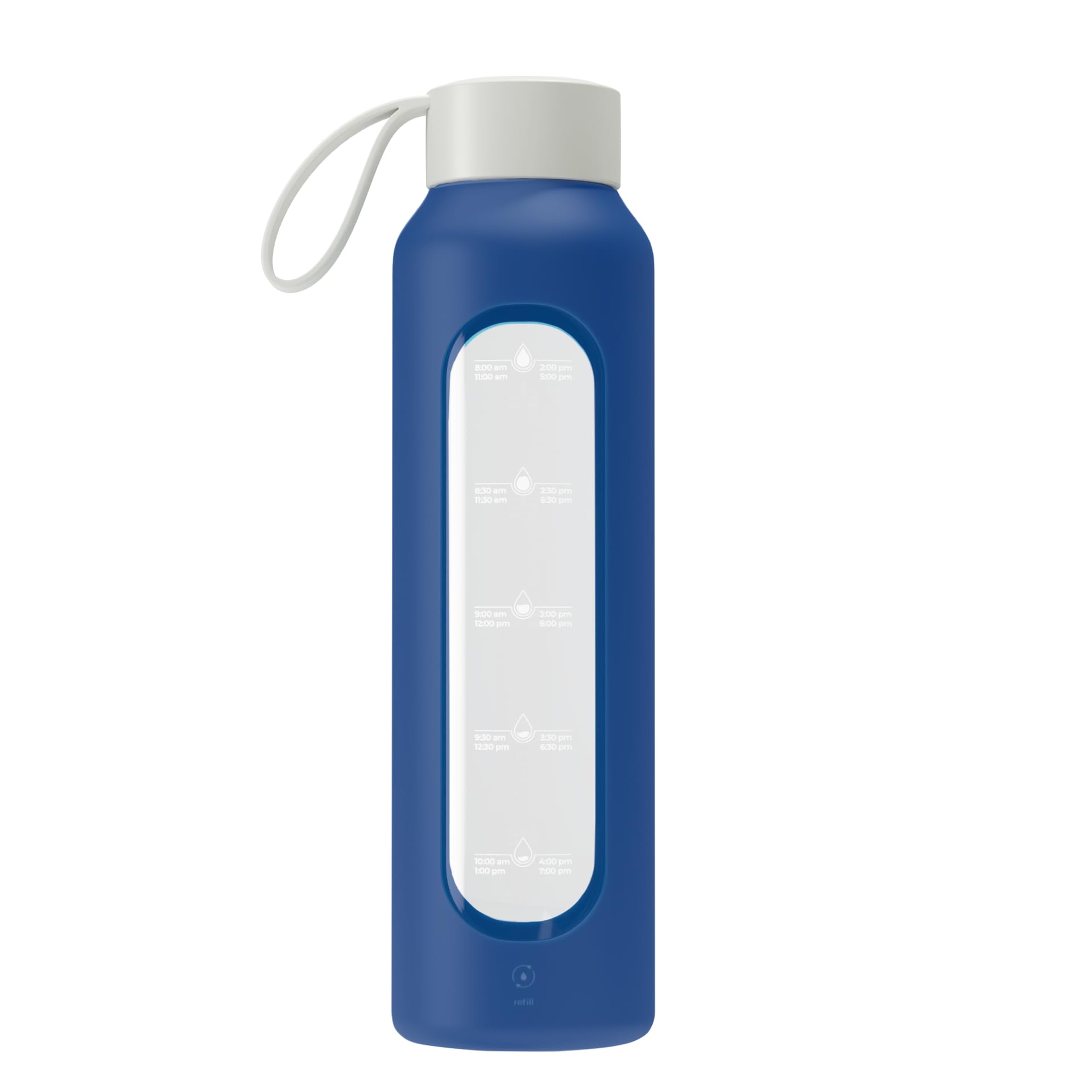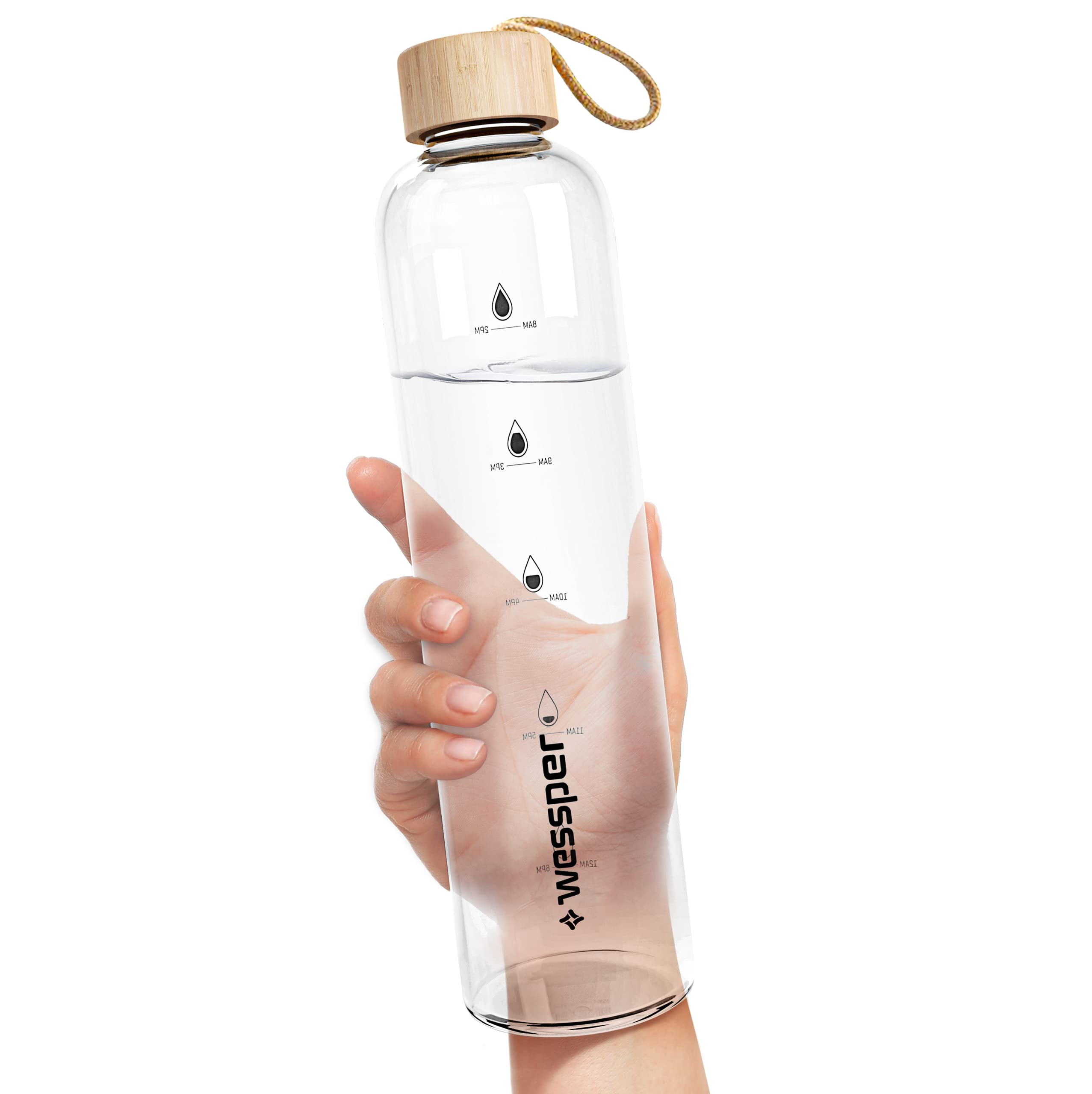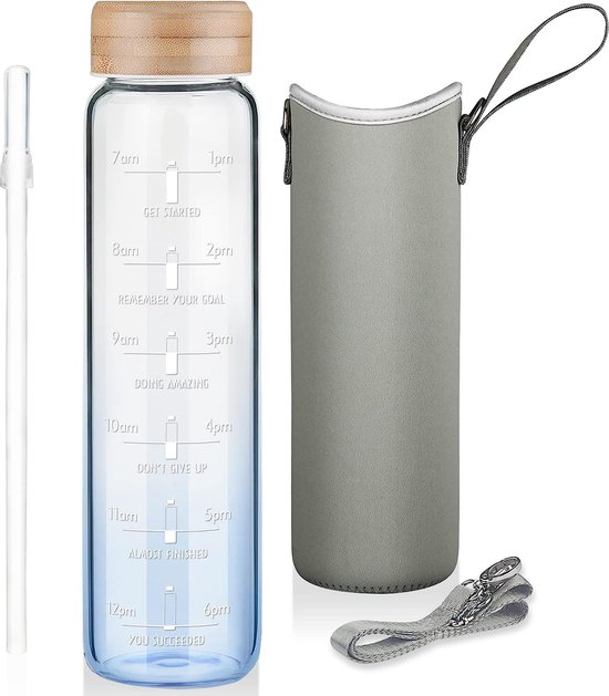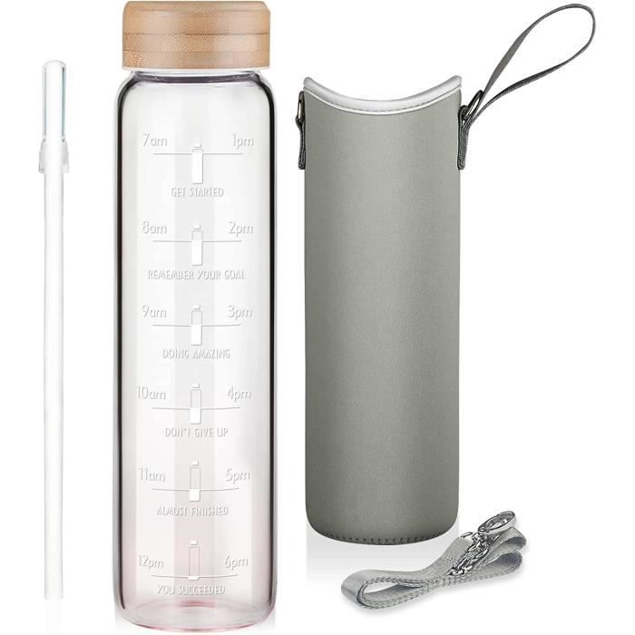 Bouchon en bambou avec joint silicone – 100 % étanche ; dragonne intégrée pour transporter la gourde partout : salle de sport, bureau ou voyage. Graduation horaire motivante – Repères discrets toutes les heures pour vous rappeler de boire régulièrement et atteindre votre objectif d’hydratation quotidien. Large ouverture Ø 5 cm – Ajoutez facilement glaçons, fruits ou herbes ; nettoyage simple à la main ou au lave-vaisselle (sans bouchon). Gourde écologique Sans BPA Wessper Gourde En Verre 1 L Avec Marqueurs De Temps, Sans BPA Gourde Sport Bureau Sans BPA 𝐌𝐀𝐓𝐈𝐄̀𝐑𝐄 𝐑𝐄́𝐒𝐈𝐒𝐓𝐀𝐍𝐓𝐄 : Est une bouteille d’eau fabriquée en verre borosilicate de haute qualité. Grâce à ses propriétés, elle est exceptionnellement résistante aux éclats et aux rayures. L’enveloppe en silicone assure une prise en main ferme La bouteille peut contenir jusqu'à 1000 ml,qui vous permet d'avoir accès à votre eau préférée pendant des heures sans avoir à la remplir ! Dimensions : Comment cela fonctionne-t-il ? Grâce à une échelle d'incitation, la bouteille indique si l'on a bu suffisamment d'eau en une journée Bouteille d'eau en verre Wessper 1L Bleu