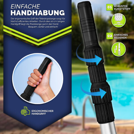 Manche Balai Piscine Perche De Piscine 300 Cm En Aluminium Pour Filets Skimmer Tige Telescopique Tetes Daspiration Pour Tuyaux Rateaux Brosses Longueur Reglable 13 Mm Perche Epaisse Finition Bleue 87557016 Manche Télescopique Piscine Polyvalent : connectez divers outils tels que les écumoirs, les brosses et les têtes d'aspirateur pour s'attaquer efficacement à n'importe quelle tâche de piscine. Blue Dream Filet de Natation, Skimmer de Piscine avec Perche... Matériaux de qualité supérieure : fabriqué en alliage d'aluminium résistant et léger, ce manche télescopique offre durabilité et manipulation facile. Facile à utiliser Et rend la piscine plus facile., 4., Paroi de tige épaisse : robuste. Gardez votre espace de piscine propre et organisé avec cette solution peu encombrante. tillvex Pool Teleskopstange 1,20 - 3,60m | Aluminium Utilisation : convient pour épuisette, râteau, brosse, aspirateur. Facile à utiliser : le design ondulé antidérapant assure une prise en main confortable et améliore le contrôle pendant votre piscine. Rangement compact : rangez cette perche télescopique facilement, grâce à sa taille compacte. Poignées confortables et faciles à utiliser. Gardez votre espace de piscine propre et organisé avec cette solution peu encombrante., 1., Design à 4 sections : convient à la plupart des piscines au sol et hors sol, tout en le rendant idéal pour le rangement., 2., Alliage d'aluminium : ce poteau de piscine est fabriqué en alliage d'aluminium, ne rouille pas et léger, pas facile à casser et à déformer., 3., Facile à utiliser : le tuyau de piscine est antidérapant et ondulé. Ouverture intérieure de montage : 29 mm. Après assemblage d'une seule tige : 1,6 m. Enlevez sans effort les débris avec ce poteau convivial.