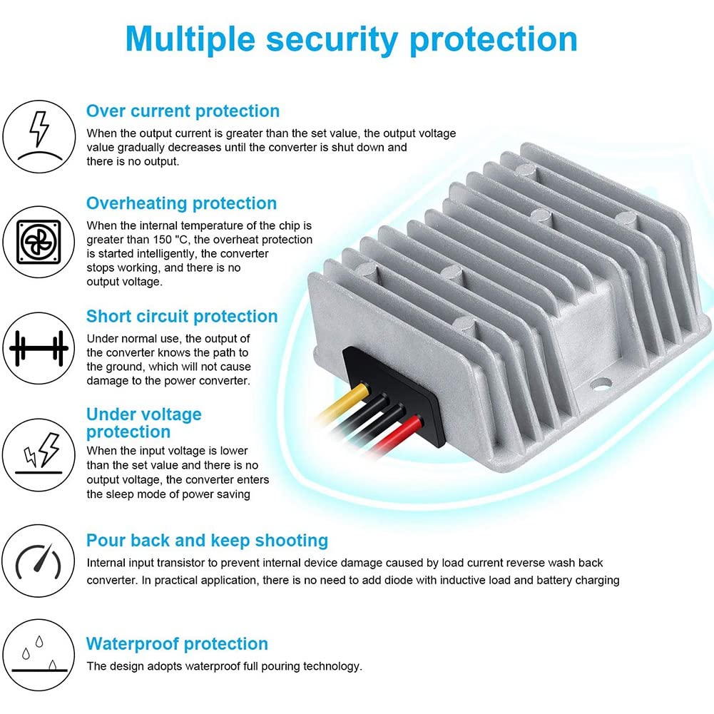 Convertisseur 36V à 12V Pour Panneau Solaire XIJ Convertisseur DC-DC Convertisseur DCDC,Convertisseur D'alimentation Convertisseur Dcdc Isolé ▶ Fonctionnement économe en énergie : notre réducteur de tension DCDC offre une efficacité énergétique optimale. Bloc d'alimentation DC/DC Buck 8-32 V à 5 V, convertisseur de tension... Petits prix et livraison gratuite dès 25 euros d'achat sur les produits SEAFRONT. Commandez Transformateur Convertisseur DC à DC 24V 36V 48V à 12V 2A 24W, Module Régulateur de Tension Abaisseur, Réducteur de Tension étanche du convertisseur, le courant du dispositif de ne doit pas être supérieur à la valeur de courant maximale que le convertisseur peut supporter. Il peut convertir efficacement 36 V 48 V en 12 V 10 A 120 W et servir d'outil utile pour une variété d'équipements électriques industriels, garantissant un transfert de puissance en douceur. Qiilu Régulateur De Tension CC Régulateur De Tension DC Boost Converter Module De Transformateur ▶ Performance sécurisée : doté d'un protecteur intégré de premier ordre, ce transformateur convertisseur réducteur de tension DCDC garantit une protection contre les surintensités, les surtensions, la surchauffe et les courts-circuits. Spécification: Type d'article : réducteur de tension Matériau : silicone + aluminium. Tension de sortie : 12 V Courant de sortie nominal : 10 A Puissance de sortie : 120 W Classe de protection : IP67 Efficacité de conversion : jusqu'à 96 % Température de fonctionnement : -20 ℃ ~ + 80 ℃ Longueur du câble d'installation : env., 13 cm / 5,1 pouces Note: 1., Afin d'assurer le fonctionnement normal du convertisseur, la tension d'entrée ne doit pas être inférieure à la valeur d'entrée minimale ou maximale limitée par le produit. S'il n'y a pas de différence de tension de 2 V, la valeur de sortie sera inférieure sans endommager (affecter) l'utilisation du convertisseur., 2., Le courant d'entrée doit être supérieur ou égal à la puissance requise par le dispositif de de sortie (par exemple, la puissance requise par le dispositif de est de 100 W, la puissance d'entrée doit donc être supérieure ou égale à 100 W). La tension d'entrée doit être supérieure de plus de 2 V à la valeur de la tension de sortie. Mode d'emploi Liste des paquets 1 x réducteur de tension Note Dans la mesure du possible, le convertisseur doit disposer d'une marge pour assurer le fonctionnement normal du convertisseur afin d'obtenir l'efficacité de conversion la plus élevée., 3., Lors de l'utilisation, les bornes positives et négatives du convertisseur ne doivent pas être reconnectées, ce qui pourrait endommager le convertisseur. Modèle : GYVRM-K481210 Tension d'entrée : 36 V 48 V (DC20-60 V).