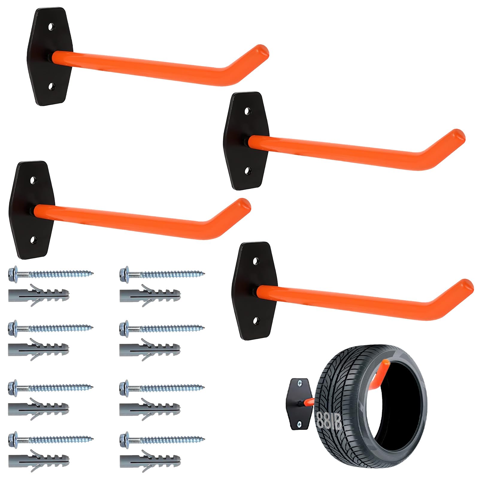 Veuillez noter que l'épaisseur et l'état du mur doivent être vérifiés avant l'installation., 🚗5., 【Largement utilisé】Le grands crochets de garage est capable de stocker des jantes pour différents types de véhicules et peut fixer des pneus, des jantes de voiture ou d'autres objets lourds aux murs des garages, entrepôts, sous-sols ou ateliers. Accessoire Garage Métal 4 Crochets Muraux Pour Pneus - Support Rangement Garage, 25.5x9x5cm, Charge 88lb/hook Accessoire Rangement Outils Par rapport aux crochets simples, nos crochets de rangement de garage ont deux trous pour gérer facilement les charges lourdes, de sorte que la plupart des articles peuvent être suspendus Taille 25 x 1,4 cm, solution de stockage peu encombrante et sûre pour les pneus de voiture., 🚗3., 【Support antidérapant】Le crochet garage charge lourde est doté d'un revêtement en caoutchouc orange de haute qualité qui est clairement visible, protège les jantes des pneus contre les dommages et assure un maintien particulièrement sûr pendant le stockage., 🚗4., 【Facile à installer】Les broches et vis fournies sont faciles à utiliser et peuvent être installées en quelques étapes seulement. Nous répondrons et résoudrons le problème dans les 24 heures., 🚗1., 【Matériau robuste】 Le ssupport crochet de pneu est fabriqué en acier solide avec un revêtement en caoutchouc antidérapant et comprend des accessoires tels que des vis et des broches pour l'installation, qui garantissent une connexion sécurisée et une installation facile., 🚗2., 【Pack de 4】Le crochets muraux de garage est livré en 4 pièces et peut supporter une charge maximale allant jusqu'à 40 kg. Lot de 4 porte-pneus créant un espace de rangement efficace dans votre garage, magasin, sous-sol, hangar, cuisine, salle de bain, buanderie. Le cintre de roue de 40 cm de long est fabriqué en acier tubulaire qui est résistant à la rouille et assez robuste Ceux-ci peuvent être montés avec tous les forets cruciformes courants. 🛞 La construction robuste en acier solide assure la durabilité, le revêtement orange protège vos outils, durable et beau, résistant à la rouille et à la corrosion 🛞 Le support mural pour pneus solide et stable peut supporter en toute sécurité jusqu'à 40 kg (88 lb) et convient à la plupart des pneus de voiture, des tuyaux robustes et des outils de jardin. Crochets de Garage Robustes, Système de Rangement de Garage, Crochet en Acier Lourd, Crochet Utilitaire de Garage, Crochets de Rangement Muraux, Crochets de Rangement de Garage, Crochets de Rangement de Garage pour