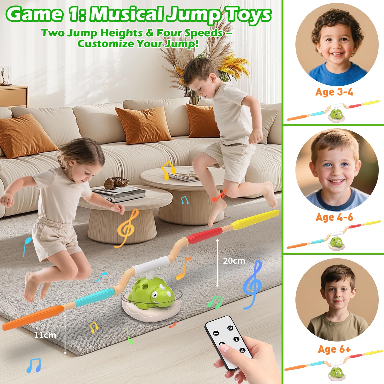 JOYIN 13 Pcs Chamboule Tout, Jeux Exterieur Enfant, Jeu de Lancer avec Jouet 3 En 1 Plein Air Pour Enfants 3 à 9 Ans Feelhap Jeux Exterieur Enfant 3 En 1,Jeu De Saut Musical,Lancer D Jeux Extérieur Enfant 3 En 1 【Prêt à l'emploi】Tous les composants sont pré-assemblés, y compris la télécommande, le cadre principal et le kit d'accessoires complet. Description du produit Jeux Exterieur Enfant 3 en 1 pour 3 4 5 6 7 8 9 Ans,Sport Outdoor-Spielzeug,Jeu de Saut Musical,Jeu de Lancer d’Anneaux,Jouets de Plein Air de Jardin Cadeaux avec Télécommande,Développe la Motricité Avertissement De Sûreté Ne pas approcher d'une source de chaleur., Ne pas ingérer. 【Réglage de la difficulté sur 4 niveaux】Équipé d'un système de réglage à 4 niveaux, il permet de passer facilement du mode débutant au mode avancé et convient ainsi aux enfants âgés de 3 à 12 ans. Jouets d'extérieur pour enfants] Ce jouet d'extérieur combine un lanceur de fusées, un jeu de lancer d'anneaux et une corde à sauter. Il peut aider les enfants à développer et à renforcer un large éventail de compétences, ainsi qu'à entraîner la motricité, l'équilibre main-œil et la coordination 【Amélioration du lien parent-enfant】Le mécanisme de lancement de fusée innovant et la fonction de corde à sauter multijoueur permettent à toute la famille de participer, ce qui en fait un choix idéal pour renforcer la relation parent-enfant et promouvoir l'esprit d'équipe. Le kit parfait pour faire bouger tes kids ! Ce jeu 3 en 1 comprend : 1) Un tapis de saut musical avec 4 vitesses et 2 hauteurs, 2) Un jeu de lancer... 【Conception sûre et durable】Fabriqué à partir d'un matériau ABS hautement résistant et respectueux de l'environnement, associé à des composants en caoutchouc antidérapants, il a passé avec succès des tests de sécurité rigoureux et convient à une utilisation à l'intérieur comme à l'extérieur, permettant aux enfants de jouer en toute sécurité et de s'amuser. 【Équipement de jeu d'extérieur 3 en 1】 Ce jouet multifonctionnel pour enfants combine entraînement physique, jeux amusants et compétitions interactives.