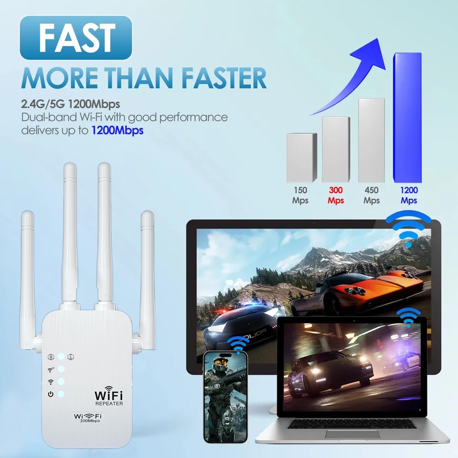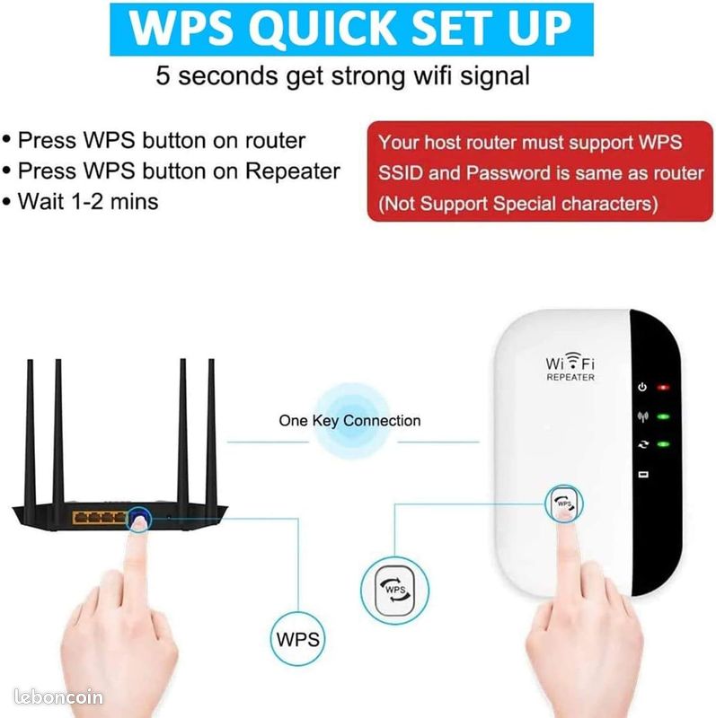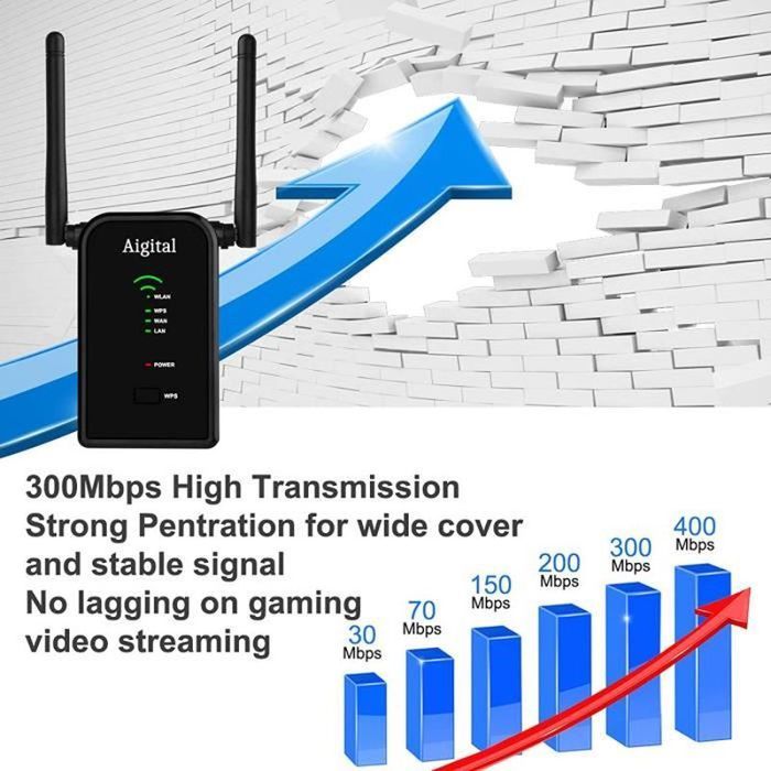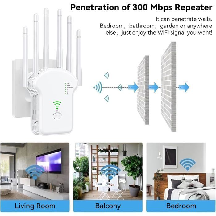 Conception de prise murale, facilitant l'installation et le déplacement., Brancher et utiliser. 【Stable Signal & Universal Compatibility】Augmente rapidement et facilement la portée du réseau WiFi avec Wifi extender, compatible avec tous les routeurs WiFi courants. Le puissant repeteur WiFi est équipé de 4 antennes à gain élevé pour étendre le signal WiFi sans fil du routeur afin d'obtenir une couverture complète à 360° et une transmission de données stable, sans se soucier des problèmes de signal dans les coins Vous êtes en quête de déployer votre réseau Wifi sur une zone plus grande de la maison ou dans vos locaux ? Le répéteur Wifi est une alternative plus pratique et plus simple. Mais face à la grande diversité de modèles sur le marché, faire le meilleur choix est un vrai défi Extension WiFi facile en appuyant sur le bouton WPS. Generic Répéteur WiFi 300Mbps 2.4G, Amplificateur De Signal WiFi - Port Ethernet/LAN 4 Couverture D'antenne - Prix pas cher | SN Avec connexion Ethernet LAN pour téléviseurs intelligents, PC, consoles de jeux, boîtiers de streaming, etc. Equipé d'un câble réseau. Amplificateur Wifi Exterieur NEWFAST Répéteur WiFi Puissant 300Mbps Amplificateur WiFi Puissant 2.4GHz WiFi Extender, WiFi Booster Avec Un Port Ethernet, Compatible Avec Toutes Les Box Internet, 4 Antennes Répéteur Wifi Pour Particulier 【installation facile -Plug and play】Pratique pour la conception de la prise murale. 【Vitesse de transmission WiFi de 300 Mbit/s】Augmente rapidement et facilement la portée du réseau Wi-Fi jusqu'à 300 Mbit/s pour des transferts de données fluides et rapides. 【Couverture étendue】Un seul routeur a une couverture WiFi limitée et crée toujours une zone morte WiFi.