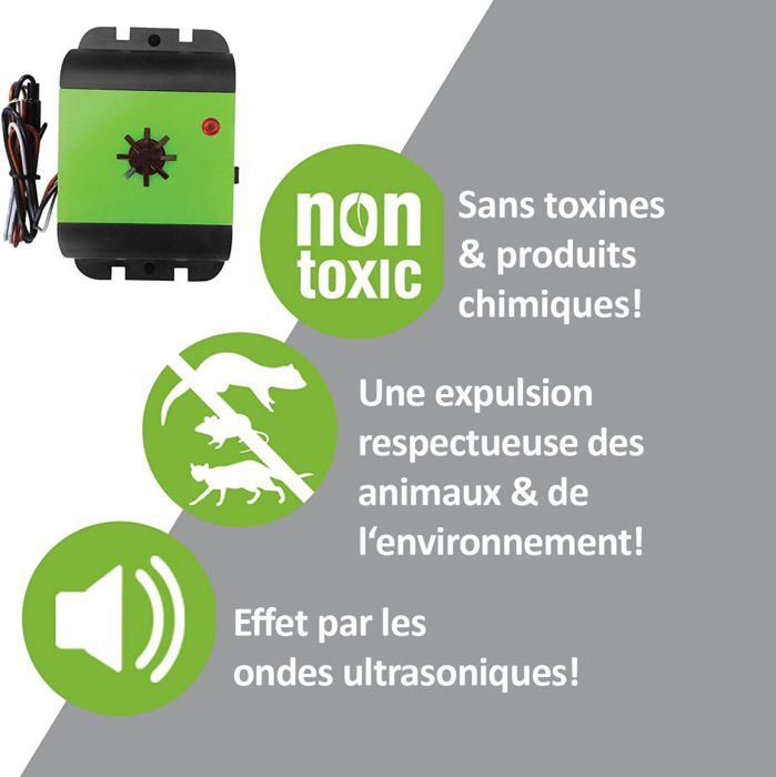 Ainsi, vous créez une zone sans animaux sans bruits gênants ni produits chimiques. La fréquence ultrasonique variable (8-56 kHz) assure un effet durable Le répulsif anti martre à Ultrason de est un répulsif à brancher sur la batterie de voiture. Dans le compartiment moteur, l'appareil perturbe les martres avec des ultrasons dans la plage de fréquence de 12 kHz Gardigo® Lot de 2 Répulsif Ultrason Anti-artre pour Auto | Repeller... Possibilités d'utilisation flexibles : que ce soit dans la voiture, à la maison, au camping ou dans le garage, le répulsif à ultrasons contre les souris offre une protection fiable contre les martres pour tous les besoins. FGJCJ Bande Anti fouine, 100c Ceinture Anti-artres pour Chats, Acier Mode de fonctionnement actif : lorsque la martre est activée, la LED rouge clignote trois fois, suivie d'un voyant blanc de 1 seconde avec trois signaux clignotants. En même temps, un son d'avertissement de 5 kHz retentit en rythme alternatif (0,5 seconde allumée/0,5 seconde éteinte) pour confirmer le fonctionnement acoustique. Appareil 12V Fréquence Variable Répulsif Contre Les Martres De Voiture,Avec Ultrasons Et Lumiere Flash Connexion Anti Martres Sur Batterie De Voiture 12 V Dans Le Compartiment Moteur Pour Voiture Grenier Jardin Etc 88730238 Répulsif Anti-martres Technologie ultrasonique ciblée : le répulsif anti-martres produit des fréquences inaudibles pour les humains et les animaux domestiques, qui agissent spécifiquement sur le système nerveux des rongeurs. Fréquence nominale: 12V / 25mA (Hz) Puissance nominale : 0,45 W. Contenu de la livraison : 1 répulsif anti-martres.