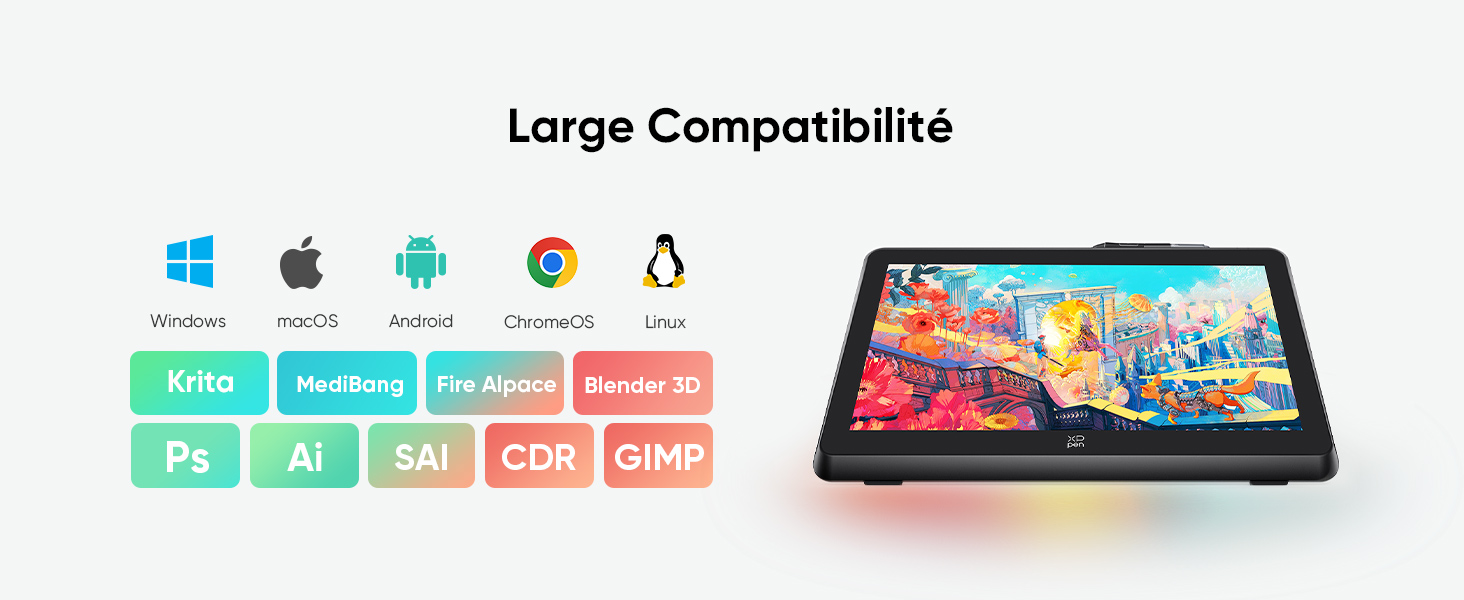 Xppen Artist 22 Monitor XPPen Artist 22 Plus Tablette Graphique Avec Écran Laminé 16k Niveaux De Pression 130% SRGB 16,7 Millions De Couleurs, Compatible Avec Windows MacOS, Chrome OS, Android Et Linux Magic Drawing Pad Compatibilité : Compatible avec les logiciels d’art numérique les plus populaires comme Photoshop, Illustrator, GIMP ou encore SAI. Vos projets professionnels méritent une tablette à leur hauteur. Écran tablette graphique XP-Pen Artist 22 Plus. Conçus pour Dessiner et peindre, Traitement de l'image, Animation 3D, Esquisser, Signer 130% sRGB native color space. Fully-laminated screen,16K pressure ... Windows 7 (or later), macOS 10.10 (or later), Chrome OS 88 (or later), Android (USB3 De plus, l’écran laminé intégral minimise la parallaxe, offrant un confort optimal pour le dessin. Vous pouvez travailler sur votre tablette quels que soient votre appareil et son système d’exploitation (Windows 11/10/8/7 (ou ultérieure), macOS 10., 10 (ou ultérieure), Chrome OS 88 (ou ultérieure), Android (USB3., 1 DP1., 2), Linux., ). XPPen Tablette Graphique, Deco 640 Tablette Graphique sans Écran, 16K Profondeur de couleur 8 bits, 16,7 millions de couleurs et 3 espaces colorimétriques interchangeables (sRGB、Adobe RGB、DCI-P3) - tous ces éléments vous offrent des couleurs extrêmement réalistes. Puce intelligente X3 Pro Le taux de réponse initial diminue à 90 ms*, 1,5 fois* plus rapide que jamais. Peut être pris à volonté & Pas facile à perdre Angle réglable en fonction de vos habitudes d'utilisation dans différents scénarios Couleurs éclatantes, précision inégalée : 130 % sRGB. 16K Niveaux de pression, première mondiale : Le tout nouveau stylet à X3 Pro puce intelligente, offre 16384 niveaux de pression, soit 100 % de plus que ses homologues. Minutieusement développée par le Laboratoire X-Innovation sous XPPen, cette combinaison de pointe est un énorme bond en avant dans la technologie CG pour libérer votre inspiration et laisser vos doigts voler sur des œuvres d’art.