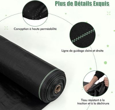 SOLUTION ÉCO-RESPONSABLE : Offrant une alternative durable aux herbicides et produits chimiques, notre bâche anti mauvaise herbe est une méthode verte et efficace pour prévenir la prolifération des mauvaises herbes La toile de paillage Outsunny, en format rouleau, élimine efficacement mauvaises herbes et champignons dans jardins et serres, facilitant l'irrigation et l'aération tout en protégeant des rayons solaires Protégez votre jardin des mauvaises herbes avec cette toile de paillage Outsunny. UTILISATION PRATIQUE : Léger et résistant, notre toile de paillage est simple à installer. INFORMATIONS DU TOILE DE PAILLAGE : Dimensions totales : 100L x 2P m Sa découpe est aisée, permettant d'ajuster la dimension nécessaire et de conserver le surplus facilement pour une utilisation ultérieure Ce filet de paillage est léger, facile à découper et à déplacer selon vos besoins Géotextiles bâche Jardin Toile Anti-Mauvaises Herbes paillage Toile de Paillage Contre Les PERMÉABILITÉ OPTIMALE : Fabriqué à partir de polypropylène dense et aéré, notre géotextile anti repousse assure une circulation efficace de l'eau et de l'air, tout en filtrant les rayons solaires et en bloquant la croissance des herbes indésirables La toile de paillage bloque les mauvaises herbes et protège vos cultures efficacement Parfait pour les plantations, ou comme couverture de protection pour les terrains de camping, zones de jeux, etc. Toile de Paillage,Anti-Mauvaises Herbes,70g-m² Film géotextile,Bâche... Bache De Jardin Anti Mauvaise Herbe Paillage Pour Plante,Toile De Paillage,Géotextile Toile Anti-Mauvaises Herbes En Non Tissé 170g Toile Paillage Idéal pour l'extérieur, les serres et les jardinières