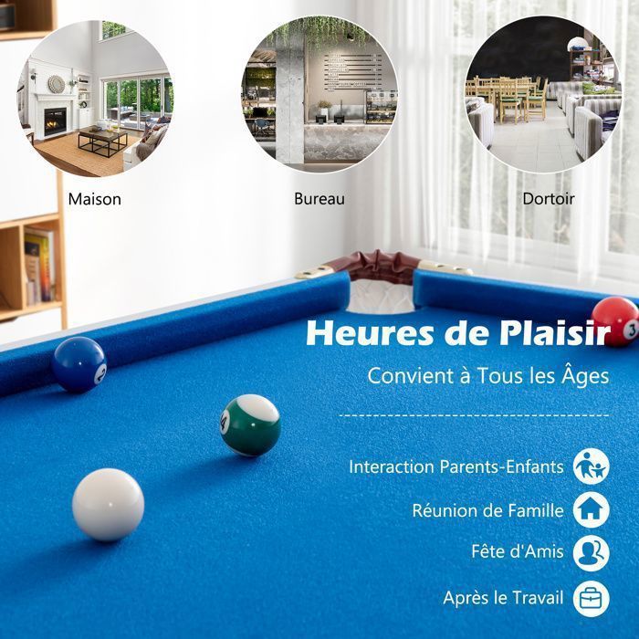 RESSENTEZ L'AUTHENTICITÉ DU BILLARD : La mini-table de billard offre une expérience réaliste grâce à sa surface en feutre lisse et plane, conçue pour éviter les déformations, réduire la friction et permettre des tirs précis. Pieds réglables pour renforcer la stabilité. Sans outils, il se réduit rapidement à une taille compacte. UN PLAISIR SANS LIMITES DE LIEU NI D'ÂGE : La table de billard est un excellent choix pour tous les âges, s'adaptant parfaitement aux maisons, bureaux ou chambres. STRUCTURE PLIABLE FACILE À MANIPULER : Le jeu de billard de table dispose d'une structure pliable innovante. Billard Pliable, Table De Billard Avec Accessoires, 193 X 109 X 81 Cm Noir Et Tapis Bleu Noir 20386936 STRUCTURE SOLIDE ET RÉSISTANTE : Des pieds métalliques résistants, équipés d'un support triangulaire et de barres transversales renforcées, font partie intégrante de la table de billard portable, augmentant ainsi sa stabilité et sa capacité de charge. De même, les pieds réglables garantissent que la table reste stable même sur des surfaces inégales, conservant ainsi toute sa fonctionnalité dans n'importe quel environnement Billard américain Magno 8ft à monnayeur - Jade Jeux Billard Maison Pliable 122 Cm Table Jeu Familial Pliable Table Billard Américain SPORTNOW Pliable - Kit Complet Avec Accessoires, 104x55,5x68cm Jeu Billard Maison Billard Américain Pliable 122cm Cette fonction spatiale facilite son rangement dans de petits espaces et son transport, tout en conservant l'attrait du billard de table. Convient à plusieurs personnes, aux familles, aux fêtes et aux jeux. Comparez les prix pour Billard pliable. Affichez les offres et comparez les marchands avec leDénicheur MDF durable et pieds métalliques offrant une résistance exceptionnelle Les joints de connexion se détachent facilement, permettant de plier les pieds Les instructions sont détaillées et l'installation est simple Spécifications techniques : Couleur : Bleu/Vert Matériau : MDF + Métal + Bois Dimensions déplié : 122 cm x 64 cm x 78 cm (L x l x H) Dimensions plié : 122 cm x 64 cm x 11,5 cm (L x l x H) Longueur des queues : 92 cm Poids net : 17,5 kg Pièces : 1 x table de billard pliable 1 x boule blanche 2 x queues 15 x boules de couleur 1 x triangle pour boules 1 x brosse 2 x craies de queue 1 x guide d'utilisation TOUT LE NÉCESSAIRE INCLUS DANS LE KIT : Les tables de billard pliables avec jeu d'accessoires comprennent un ensemble complet d'accessoires. De conception stable et solide pour une durabilité prolongée, il est équipé de pieds réglables qui garantissent une surface de jeu stable et sûre. Elle sert de point de rencontre idéal pour interagir entre parents et enfants, pour les réunions de famille, les fêtes entre amis ou simplement pour se détendre après le travail.