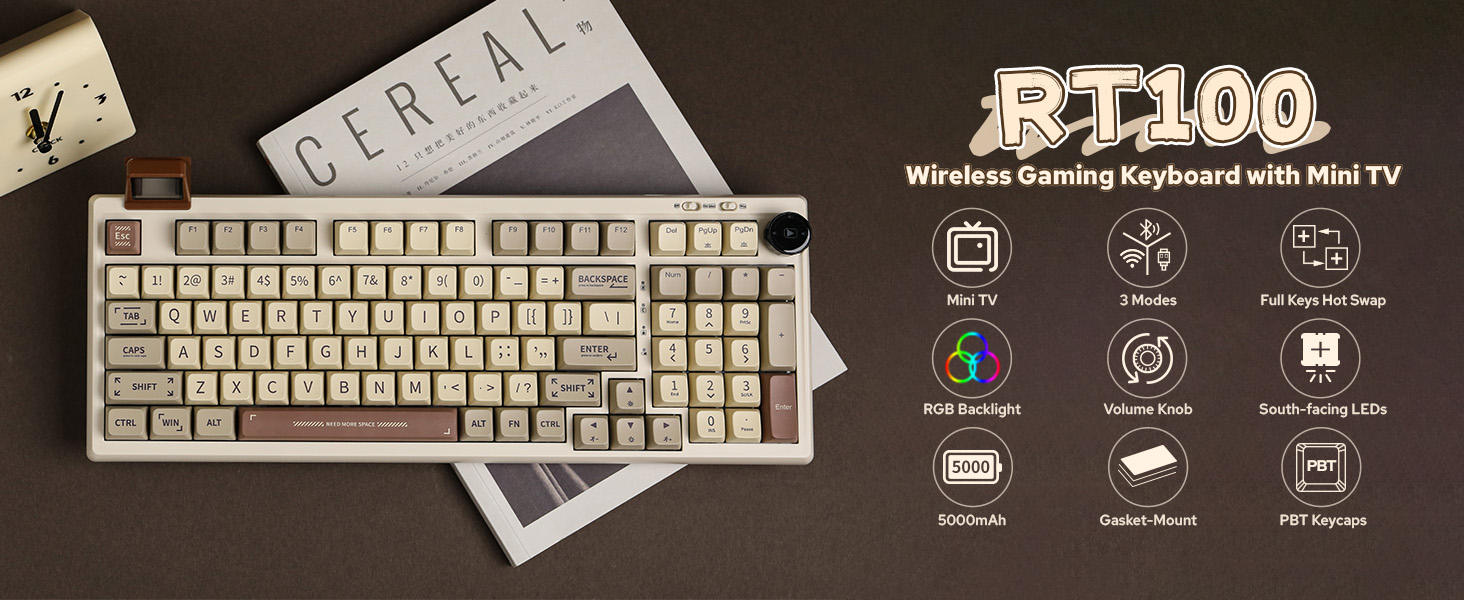 De plus, le mini écran est amovible, de sorte que le port devient un port caché pour le récepteur sans fil 2,4 Hz. Batterie grande capacité de 5000mAh Assure une longue session de frappe sans se soucier du manque d'énergie Trois modes de connectivité Connectez jusqu'à 5 appareils avec Fn+Q/W/E(Bluetooth)/Fn+R(2,4GHz) Alors que le clavier mécanique est la star essentielle de chaque joueur ou codeur,un design compact vous offrira une meilleure expérience dans un paquet plus petit,sans compromis dans sa fonction. 【Clavier mécanique à 97 touches】EPOMAKER RT100 est un clavier mécanique à montage joint avec couche sandwich Poron et mousse inférieure à rebond lent pour obtenir une expérience de frappe douce et fluide. EPOMAKER RT100 Clavier de Jeu Mécanique à 97 Touches BT5.0/2.4G/USB-C avec écran d'affichage Personnalisable, Prise Remplaçable à Chaud, Batterie 5000 mAh pour Win/Mac (Blanc rétro, Wisteria Linear) | Votre wishlist sur Avec 16 modes d'éclairage par défaut et la liberté de configurer les vôtres avec le conducteur Un stabilisateur pré-lubrifié et un tampon d'interrupteur sont ajoutés pour enrichir la performance. Bouton poussoir PBT Premium à 5 faces Le profil MDA est conçu pour aider à réduire la fatigue et la douleur Grâce à trois moyens de connexion, le RT100 peut être utilisé à des fins différentes selon si la commodité ou la stabilité est la priorité dans la tâche que vous effectuez. ABASANKE K6 Pro 96% 3 odes Clavier de Jeu écanique Hot Swap 4000Ah... Fonctions du Mini Display Écran intelligent innovant et personnalisable Le clavier EPOMAKER RT100 au style rétro est doté d'un écran LCD intelligent innovant et personnalisable. Le mini écran très agréable est très amusant à jouer, car il peut servir de montre intelligente avec date et heure, prévisions météorologiques, niveau de batterie du clavier ou autre chose que vous souhaitez avec les paramètres et la programmation. 【Triple modes de connexion, batterie de 5000 mAh】Le RT100 prend en charge la connexion filaire de type C et Bluetooth 5., 0/2,4 GHz. La qualité et la classe A de la prise Kailh pour son support du hot-swapping et pour sa bonne réputation au sein de la communauté des claviers EPOMAKER RT100 Clavier de Jeu Mécanique à 97 Touches BT5.0/2.4G/USB-C avec écran d'affichage Personnalisable, Prise Remplaçable à Chaud, Batterie 5000 mAh pour Windows/Mac (Flamingo Switch Test - Epomaker RT100 : Un clavier mécanique custom efficace 【LED orientées vers le sud】Le RT100 a également conçu le design pour toutes les lumières RVB pour faire face au sud, de sorte que celui qui fonctionne sera celui avec la meilleure vue de tous les motifs de lumière.