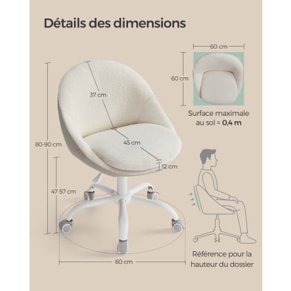 Vous pouvez vous asseoir confortablement pendant de longues heures. Réglage continu de la hauteur]Cette chaise de bureau beige sans accoudoirs offre un réglage de hauteur continu, s'adaptant à toutes les morphologies. La hauteur minimale convient parfaitement aux adolescents, et la molette de réglage est facile à utiliser Le dossier soutient parfaitement le dos, et le tissu respirant garantit un climat assis agréable même lors de longues journées – sans douleurs dorsales. Elle s'adapte au bureau à domicile, à la chambre d'étudiant, à l'atelier créatif, au salon de maquillage, à la chambre à coucher, au studio ou à l'appartement – et y apporte élégance et fonctionnalité Parfaite comme chaise de bureau enfant fille pour les chambres d'adolescents et de filles. Vous pouvez également la baisser pour la ranger sous le bureau, gainant ainsi votre intérieur 【Facile à assembler, polyvalente, cadeau attentionné】Cette chaise s'assemble super vite : 20 minutes seul suffisent. La chaise de bureau décontractée est parfaite pour les bureaux, les chambres, les salons, les salles d'eau et les tanières. 💎Durable : la chaise pivotante moderne est dotée d'une base et d'un cadre en métal robustes et durables pour une utilisation à long terme, et les roues pivotantes à 360 degrés offrent une commodité lorsque vous... Parfaite comme chaise de bureau confortable et chaise de bureau enfant Bureau de chaise pivotante en tissu avec accoudoirs et roues modernes Chaise De Bureau Pivotante Réglable En Hauteur, Chaise De Bureau Pivotante Reglable En Hauteur Chaise De Bureau En Velours Chaise De Maquillage A Roulettes Fauteuil En Velours Pour Chambrebureau Vert Et Or Idéale pour une coiffeuse. 【Design épuré et esthétique, adaptée à tous les espaces】Cette chaise de bureau fille séduit par sa couleur, sa forme, ses matériaux et son design moderne minimaliste – élégante et raffinée, elle s'intègre parfaitement à tout intérieur. Idéale pour un bureau, une coiffeuse, un salon ou un espace de télétravail. Son excellente qualité et son confort d'assise en font une chaise de bureau ado ou chaise de maquillage idéale 【Charge 150kg, stable et sécurisée】Cette chaise de bureau est fabriquée avec des matériaux aéronautiques (cadre, roulettes, rembourrage).