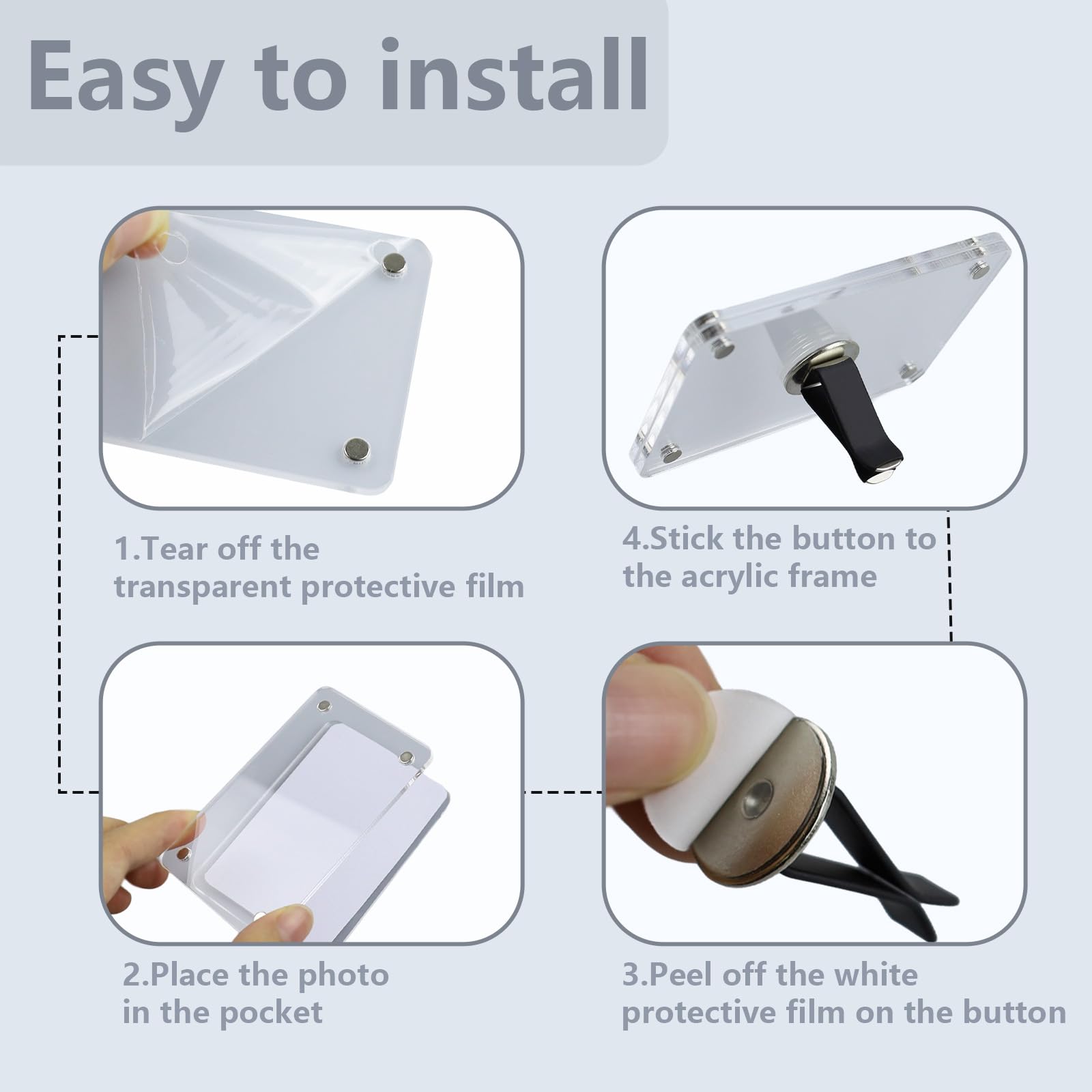 Cadre acrylique magnétique avec film protecteur – Les deux faces du cadre sont recouvertes d'un film protecteur. Remarque importante : Chaque cadre est doté d'un film protecteur des deux côtés pour éviter les rayures pendant le transport. Le lot de deux cadres photo magnétiques en acrylique NineSSJLY pour grille d'aération de voiture vous permet de personnaliser votre véhicule. Ces cadres en acrylique de haute qualité, dotés d'une fonction magnétique, sont parfaits pour les photos de 6 × 9 cm (2,36 × 3,54 pouces Cadres Photo en Acrylique 10 x 15 cm,Encadrement Photo Magnétique... Veuillez retirer le film avant utilisation pour une visualisation sans rayures. Lot De 2 Cadres Photo Magnétiques En Acrylique - 10 X 15 Cm - Cadre Décoration de voiture personnalisée – Utilisez le cadre photo comme pendentif personnalisé, pince photo décorative ou porte-notes pour votre véhicule. Lot de 2, utilisations polyvalentes – Idéal comme cadeau ou pour décorer votre voiture. Porte Photo Ventilation Auto 2 Cadres Photo De Voiture,cadres Photo Personnalisés Magnétiques Décoration Habitacle Personnalisée Veuillez retirer le film avant utilisation pour une vue dégagée de vos photos. Le lot de deux cadres photo magnétiques en acrylique NineSSJLY pour grille d'aération de voiture vous permet de personnaliser votre véhicule. Grâce aux supports à pinces fournis avec adhésif puissant, les cadres se fixent facilement à la grille d'aération, sans outils ni perçage.