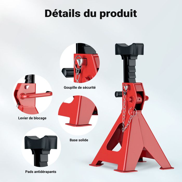 Jeu de deux chandelles à crémaillère 3 tonnes - Auto [Capacité de charge élevée] Chaque chandelle supporte une charge maximale de 6 tonnes, offrant une capacité totale de 12 tonnes pour la paire. Chandelle Leclerc VEVOE 1 Paire De Chandelles De Levage Capacité 6 Tonnes Chandelle De Chandelle Leclerc Prix Description : Les chandelles sont l'un des outils les plus importants dans un atelier. [Certification TÜV/GS] Équipé d'un mécanisme de verrouillage sécurisé et conforme aux normes TÜV/GS, garantissant une utilisation fiable dans tous les travaux de maintenance. [Adaptation à différents véhicules] Grâce à sa hauteur réglable, ce chevalet s'adapte facilement à la plupart des véhicules, idéal pour diverses réparations automobile (freinage, suspension, vidange, etc., ). Chandelles Certified en acier à haute résistance, 6 tonnes, paire... Les meilleures chandelles de levage auto ! Avis d'un Pro [Construction robuste en aciere] Fabriqué en acier renforcé, ce CDZHLTG chevalet de levage allie résistance et durabilité, conçu pour un usage intensif. [Réglage par cliquet et grande surface de base] Système de réglage par cliquet pour un ajustement rapide et précis de la hauteur (390-585 mm), avec une base élargie assurant stabilité et sécurité. Idéal pour la plupart des travaux d'entretien et de réparation sur les véhicules automobiles.