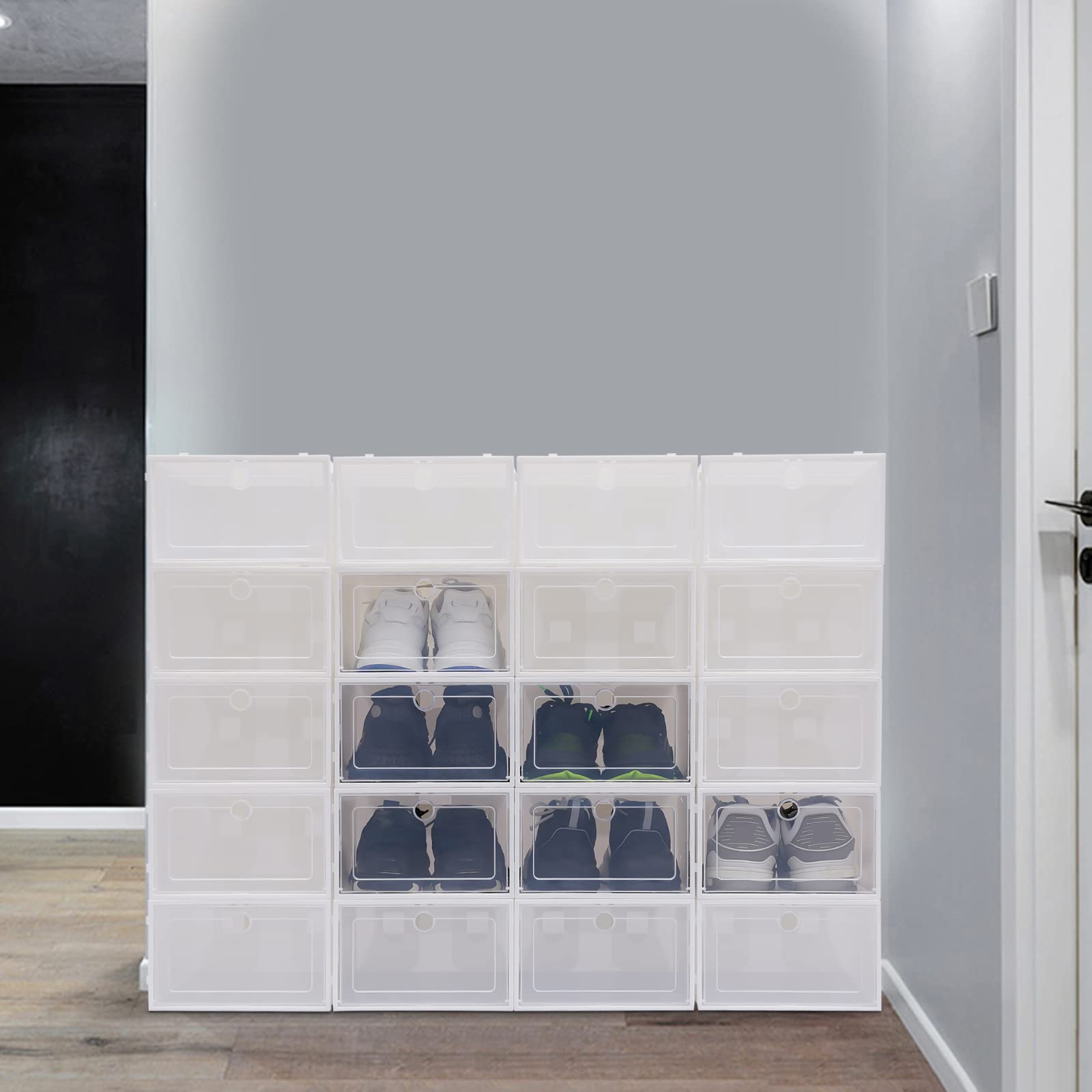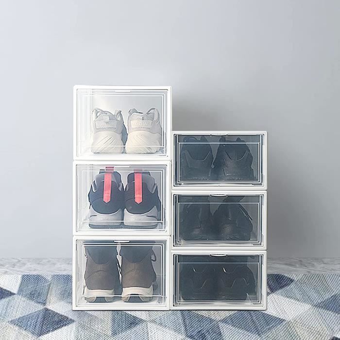 De cette façon, la boîte à chaussures peut être bien ventilée, de sorte que les chaussures ne peuvent pas moisir. Montage simple et empilabilité peu encombrante : Avec notre lot de 2 boîtes à chaussures, l'assemblage et l'empilage sont un jeu d'enfant. Les boîtes s'empilent solidement grâce aux points de connexion, vous permettant de gagner de la place Le couvercle transparent vous permet de trouver facilement et rapidement les chaussures. Grand espace : la taille de chaque boîte est de 33 x 23 x 14 cm, ce qui peut contenir une paire de chaussures de moins de 31 cm de long et 13 cm de haut. Ces deux matériaux sont non seulement imperméables, mais aussi avec une bonne capacité de charge. Contenu de la livraison : 24 boîtes à chaussures Matériau de haute qualité : chaque boîte à chaussures est fabriquée en polypropylène et ABS de haute qualité. Ces boîtes permettent de garder vos chaussures à l'abri de la poussière, de l'humidité et des insectes tout en les rendant facilement visibles, ce qui facilite... Lorsque vous les achetez, vous avez assez d'espace pour vos chaussures. Organisateur à chaussures empliable transparent utile | HOME Transparente OMGGYER Lot De 24 Boîtes à Chaussures Empilables Transparentes Avec Couvercle Et Trous D'aération - Peu Encombrantes - Boîte De Rangement Pliable Pour Chaussures Jusqu'à La Taille 45 - Blanc Boite Chaussure Dimensions de la boîte à chaussures individuelle : 33 x 23 x 14 cm / 13,0 x 9,1 x 5,5 pouces Hauteur de chaussure applicable : 13 cm Longueur de chaussure applicable : 31 cm Installation : Cette boîte à chaussures est très facile à installer, nous vous fournirons une vidéo d'installation détaillée. En plus des chaussures, vous pouvez également y ranger d'autres petites choses comme des livres, des magazines, des accessoires, des cosmétiques et ainsi de suite. Détails : Trou rond dans le couvercle : le couvercle avant de chaque boîte à chaussures est muni d'un petit trou au centre. Ce trou est conçu pour faciliter l'ouverture de la boîte à chaussures. En verrouillant les boutons-pression, les boîtes à chaussures supérieures et inférieures ou à gauche et à droite peuvent être solidement reliées entre elles.