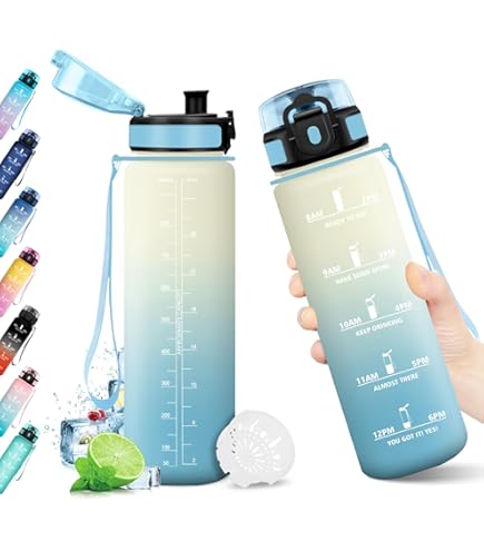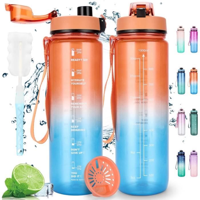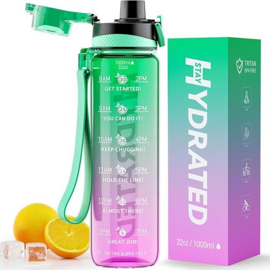 Gourde 1l, Gourde Sport, Anti Fuite, Bouteille Graduée pour 1 Journee, Facile à Nettoyer, Bouteille Reutilisable, avec Marqueur de Temps, pour Aptitude, Camping, Yoga, Sports, Voyage Fournit un moyen plus simple et plus pratique d'ouvrir le couvercle pour les garçons, les filles et les personnes de tous âges Gourde 2l Gourde, Gourde Enfant, Gourde 500ml Avec Slogan De Motivation, Gourde Gourde 1l Matériau Sûr et Durable : la gourde 1l est fabriquée en plastique de qualité alimentaire importé, non toxique et sans odeur, vous offrant une bonne expérience de consommation. Conception 100 % Anti-Fuite :le joint en silicone sur le couvercle empêche les fuites et le verrou de sécurité à encliquetage empêche le couvercle de s'ouvrir accidentellement, vous pouvez donc profiter de votre gourde graduée pour 1 journee sans vous soucier des fuites ou des dommages. La texture givrée de la bouteille d'eau vous permet de mieux la tenir et de l'empêcher de glisser, et vous aurez une bouteille d'eau robuste, durable et résistante aux chocs Gourde,Bouteille d'eau Portable, 1l, anti-fuite, pour Sport de plein... Gourde sport anti-fuite 1L - JOZSI – Graduée avec slogan Fonctionnement à une Main : la gourde sport adopte un bouchon à ressort anti-poussière, il vous suffit de tourner le verrou de sécurité vers le bas et d'appuyer doucement sur la boucle d'une seule main, et le couvercle s'ouvrira, vous permettant de boire de l'eau rapidement. Conception d'échelle de Temps : la gourde motivante avec des citations de motivation uniques et des repères de temps vous rappellera toujours de consommer la bonne quantité d'eau. La tasse à eau peut être utilisée à une température de -10°-80°, et vous pouvez profiter de l'eau dans cette plage de température