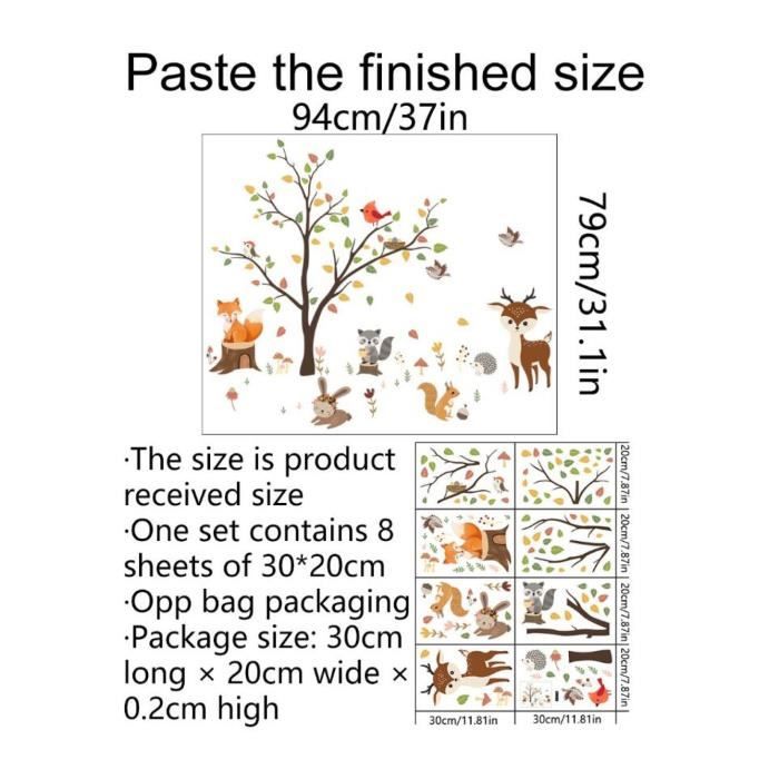 Ils sont parfaits pour les murs, fenêtres, et autres surfaces lisses. Vous n'avez pas besoin d'outils ou de produits spéciaux : il suffit de les décoller et de les coller là où vous le souhaitez. Ces autocollants sont parfaits pour créer une atmosphère apaisante et stimulante dans les chambres d'enfants, tout en ajoutant une touche de nature à la décoration. Applications Multiples : Utilisez ces autocollants pour décorer une variété de surfaces, y compris les murs, les portes, les fenêtres et les meubles. Fabriqués avec des matériaux écologiques, ces autocollants sont totalement sûrs pour vos enfants. Stickers Muraux Grand Arbre Animaux Forêt Arbre Autocollant Mural Hibou Ils sont conçus pour durer, résistants à l'humidité et à la décoloration Idéal pour les Espaces Enfants : Parfaits pour les chambres d'enfants, ces stickers muraux créent un environnement inspirant et apaisant avec des animaux mignons et des éléments de la forêt, favorisant l’imagination et l'éveil des petits Ces adhésifs décoratifs vous permettent de créer une ambiance chaleureuse et féerique dans votre chambre, votre salon ou la chambre de vos enfants. Loups, renards, écureuils, hiboux et autres animaux de la forêt s'invitent sur vos murs pour créer un univers enchanteur Stickers Arbres Cerf Renard Stickers Muraux Forêt Enchantée Pour Chambre D'Enfant Et Bébé Autocollants Foret Animaux Décoration Naturelle et Ludique : Ces stickers muraux créent une atmosphère enchantée dans la chambre de votre enfant, avec des motifs d'animaux de la jungle, des arbres de pin et des éléments forestiers. Ces autocollants peuvent être retirés sans laisser de traces ni abîmer vos surfaces. Vous aimez les animaux de la forêt tels que le chevreuil, le sanglier ou l'insaisissable renard ? Misez sur nos autocollants forêt pour une décoration originale et personnalisée Leur conception amovible et réutilisable vous permet de réorganiser la décoration de la chambre sans effort. Conception Sûre: Fabriqués avec des matériaux, ces autocollants sont sécuritaires pour les enfants et respectueux de l'environnement. Description du produit Les stickers muraux Arbre Pin et Animaux de Forêt sont l'élément décoratif idéal pour transformer la chambre de votre enfant en un véritable havre de paix naturel. Ces stickers muraux conviennent parfaitement pour les chambres, les salles de jeux, et même les espaces extérieurs protégés