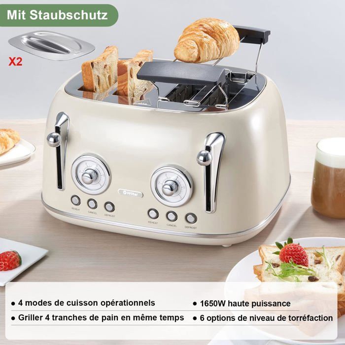 1 630 watts, votre pain et vos petits pains deviennent rapidement dorés, ce que vous pouvez contrôler avec l'indicateur de niveau de dorage pratique. Le grille-pain à 4 tranches de Korona couleur vert menthe est un bel objet au design rétro. Fonction Croustillant, fonction Décongélation, fonction Bagel, dorage uniforme grâce au centrage du pain Comme le pain croustillant et les petits pains aiment faire des miettes, vous disposez du ramasse-miettes amovible. Les points forts du grille-pain 4 tranches de Korona Le grille-pain 4 tranches de Korona assure des toasts croustillants et des petits pains chauds tout au long de la semaine. Vous pouvez ainsi nettoyer votre grille-pain sans grand effort. Si votre pain sort du congélateur, il vous suffit d'utiliser la fonction Décongélation/Réchauffage. En plus de 6 degrés de grillage différents, il y a un niveau de décongélation et de réchauffement ainsi qu'un bouton d'arrêt supplémentaire qui vous permet d'interrompre le processus de torréfaction à tout moment. Un dorage parfaitement uniforme. Tiroir ramasse-miettes - Un tiroir ramasse-miettes extractible recueille toutes les miettes qui tombent. Grille Pain 4 Fentes Retro Grille Pain Avec 2 Fentes Vintage Beige 155/1 - Grille Pain BUT Grille-pain Familial 1630 Watts Electroménager - Découvrez notre offre Korona Grille-pain rétro 4 fentes beige184. Livraison gratuite à partir de 25€* | Paiement sécurisé | 4x possible | Retour simple et rapide [Quatre tranches] - Ce grille-pain est le compagnon de petit-déjeuner idéal pour les familles Quatre fentes de grillage dorent simultanément quatre tranches de pain croustillantes pour votre plaisir ensemble. Cuisinart Grille-pain 4 tranches - Fentes larges, idéal pour le pain épais et les bagels - 6 niveaux de brunissage et décongélation - Fentes larges, Remontée maximale - Rose vintage Grille-pain automatique avec chauffe-viennoiseries amovible Niveau de dorage avec indicateur du degré de dorage réglable en continu Avec tiroir ramasse-miettes très pratique Grille-pain Avec Décongélation Rétro Korona - Fonction Décongélation, 1630W, Couleur Crème Grille-pain 4 Fentes Le centrage du pain aligne toujours parfaitement la tartine à griller. Sortez votre pain du congélateur et faites-le croustiller. Récupérez les restes de pain avec le ramasse-miettes - Puissance max., 1 630 watts Utilisez-le pour dorer, réchauffer, décongeler et faites de votre journée une véritable expérience gustative.