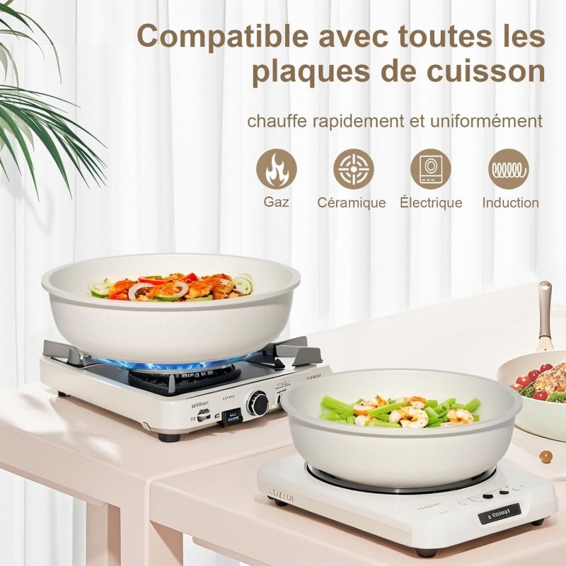 Lavage à la main recommandé – Pour prolonger la durée de vie du revêtement, évitez le lave-vaisselle et privilégiez un nettoyage doux à l’éponge. Menastyl Cuisson Lot de 3 poêles Dahlia sans PFAS - Revêtement céramique antiadhésif - 98% daluminium recyclé - Tous feux dont induction et lave-vaisselle - 6014235 dès 129,95 € - sur Optez pour la Batterie de cuisine Art & Cuisine AC1824, un ensemble complet de 18 pieces en aluminium avec revetement antiadhérent, conçu pour tous les types de feux, y compris l'induction Se nettoie aisément sous l’eau courante. Manche amovible sécurisé – Passez facilement de la cuisson à la table ou au four, puis retirez le manche pour un rangement gain de place. GOTHAM STEEL Collection naturelle : une cuisine plus saine est facile avec cet ensemble d'ustensiles de cuisine antiadhésifs. Les casseroles et poêles antiadhésives sont conçues pour être 2 fois plus durables, passent au lave-vaisselle et au four jusqu'à 260 °C. Les poignées dorées restent froides vous permettent de passer de la cuisinière au four. Mais cet ensemble ne se contente... Compatibilité tous feux – Y compris induction, gaz, vitrocéramique et électrique. Set complet 18 pièces beige – 2 casseroles Ø 18 cm et Ø 24 cm avec couvercles, 1 poêle Ø 28 cm, accessoires et manche amovible pour un rangement pratique. Batterie Cuisine Antiadhésive 18 Pièces Batterie De Cuisine 15 Pièces Antiadhésif En Granit Beige - Tous Feux Dont Induction Just Perfecto Jl-788 Manche Amovible Rangement Pratique