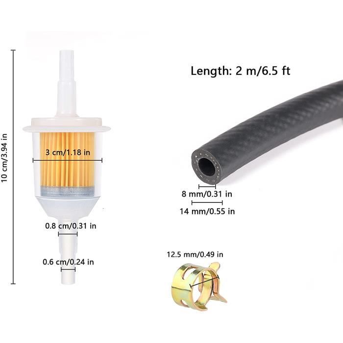 Filtre Essence RAFIYU Durite Essence Kit, 2m 5mm Tuyau D'essence + 4 Filtres U00e0 Carburant 5 Mm/8 Mm + 20 Colliers De Serrage, Conduite De Carburant Kit Pour Voitures Motos Scooters Filtre Essence Moto Colliers de serrage : montage facile et sûr grâce à une conception améliorée du couvercle et des vis Normes : DIN73379 / ISO 1307; Pression de service : 10 bar - Pression d'éclatement : 30 bar; Filtre : convient pour tuyaux de 6 mm/8 mm; Colliers de serrage... Colliers de serrage pour filtres à sable 3,028 m³/h - Bestway Montage facile et sûr grâce à une conception améliorée du couvercle et des vis. Fabriqué à partir de matériaux NBR Rubber / Nitrile de qualité supérieure, spécialement conçu pour les voitures diesel et pétrole Kit Carburant Tondeuse Kit Tuyau Essence 2m + 2 Filtres Carburant + 10 Colliers - Compatible Tondeuse, Moto, Voiture - Diamètre 5mm Kit Réparation Moteur Petit Appareil Pression de service : 10 bar / pression d'éclatement : 30 bar Pour le transport d'huile et de carburant dans le domaine automobile. Matériau : caoutchouc nitrile Normes: DIN 73379 / ISO 1307 Fabriqué à partir de matériaux NBR Rubber / Nitrile de qualité supérieure. Filtre à essence : - Longueur : 112 mm. Spécialement conçu pour les voitures diesel et pétrole. - 10 colliers de serrage, Normes: DIN73379 / ISO 1307 Design triangulaire qui empêche la déformation de la forme Contenu : - 1 tuyau de carburant de 4 m., - 2 filtres à essence. Élément conducteur électrique.