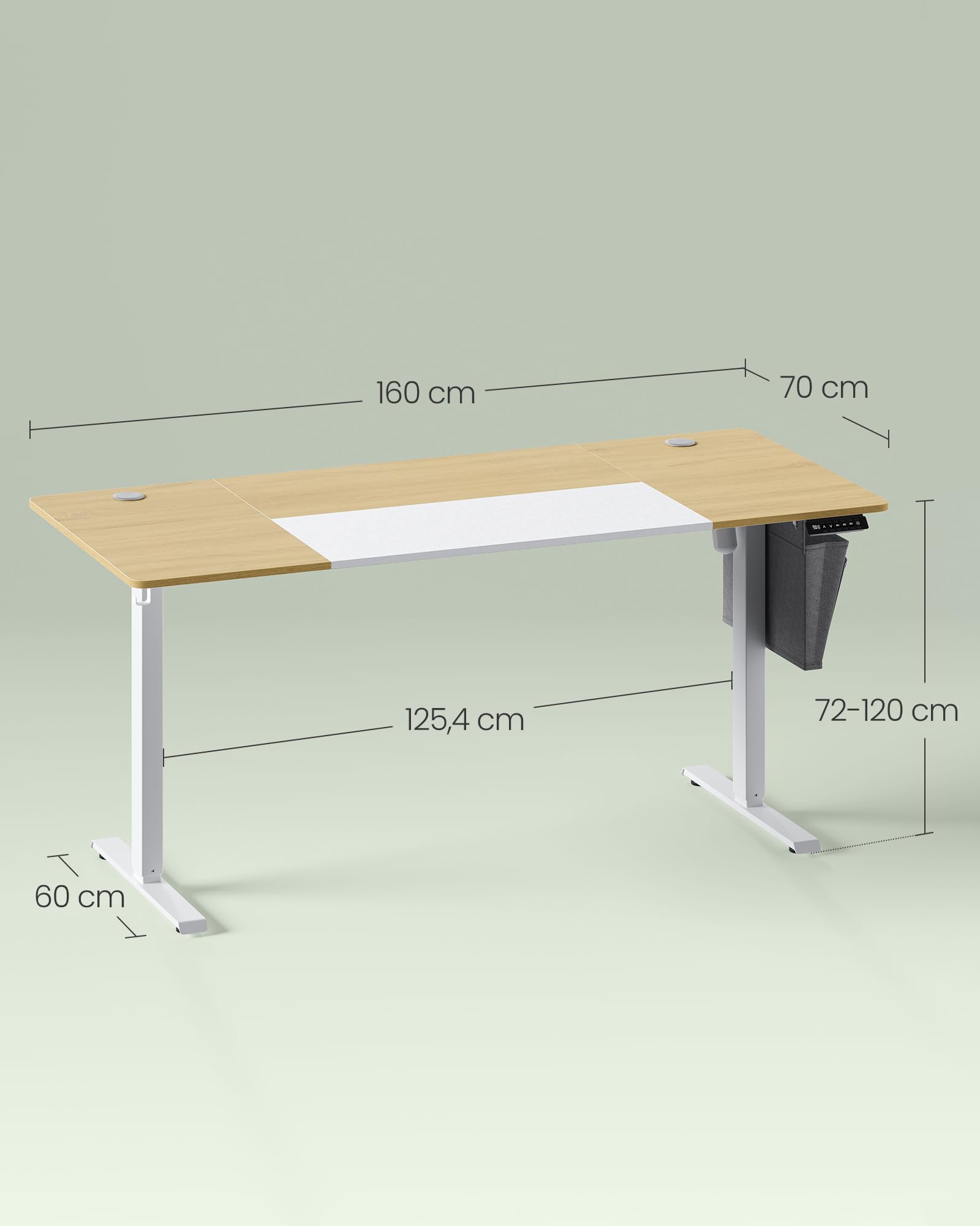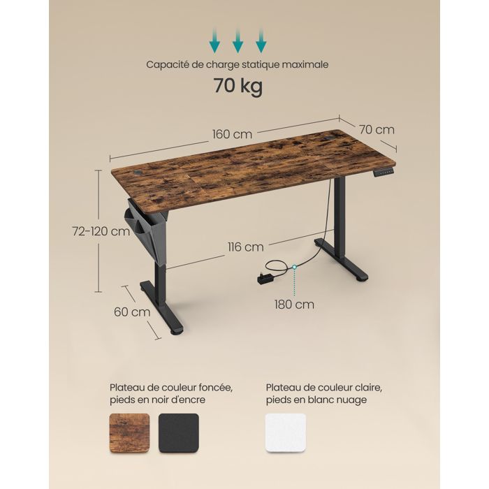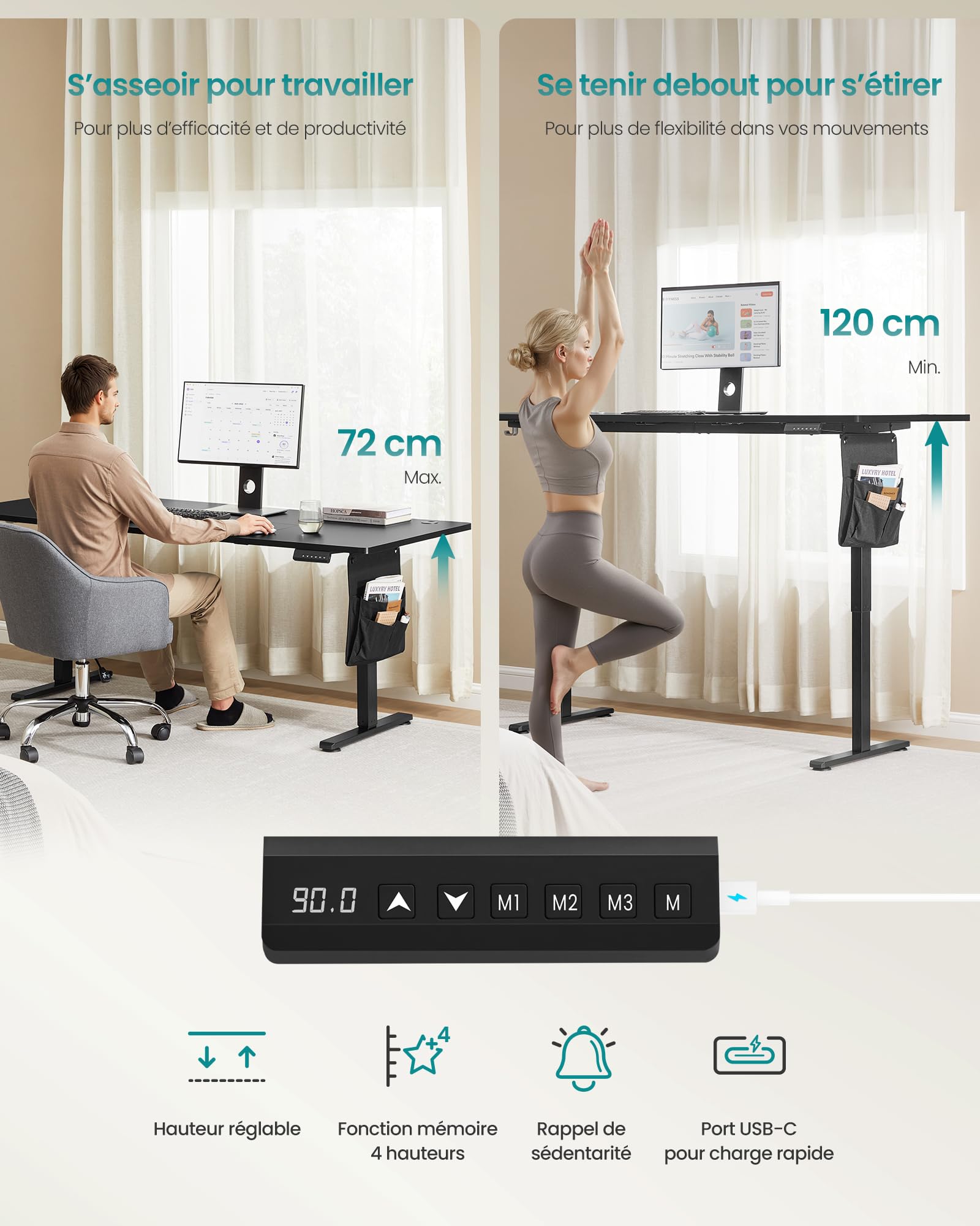 Le fonctionnement silencieux vous permet de rester concentré (< 48 dB) Le cadre en acier robuste et le moteur de qualité font monter et descendre le bureau rapidement et en douceur, avec un niveau sonore inférieur à 48 dB, sans vous déconcentrer de votre travail ni vous distraire. Dimensions : 180 x 80 x (72-120) cm (L x P x H) Stable et silencieux : Le cadre en acier de qualité et le moteur assurent un réglage uniforme même avec une charge de 70 kg. Créez un espace de travail adapté à vos besoins grâce à ce bureau électrique réglable Songmics Son grand plateau de 180 x 80 cm vous offre beaucoup d’espace pour être super productif. Enregistrez jusqu’à 4 hauteurs pour régler rapidement votre siège et travailler confortablement. Le port USB-C sur le contrôleur permet la recharge rapide des téléphones et des tablettes Élégant et pratique : Le plateau de table de différentes couleurs apporte une touche de style à votre espace, tandis que le sous-main améliore la glisse de la souris. Posture ergonomique : Le réglage en hauteur de 72 à 120 cm favorisant une posture saine. Bureau Assis debout Réglable en hauteur 180 x 80 cm avec Port... 169,99 €. Plus d'informations Plus infos La capacité de charge statique maximale du bureau est de 70 kg, veuillez ne pas dépasser cette limite. Le port USB-C permet de recharger facilement votre téléphone ou votre tablette La fonction mémoire avec 4 réglages vous permet d'enregistrer vos hauteurs préférées. Le cadre en acier robuste et le moteur de qualité font monter et descendre le bureau rapidement et en douceur, avec un niveau sonore inférieur à 48 dB, sans vous déconcentrer de votre travail ni vous distraire Faites passer tous vos câbles à travers les ouvertures pour éviter les enchevêtrements et maintenir un espace de travail ordonné. Précautions de SONGMICS : Ne placez pas la table directement contre un mur, afin de ne pas rayer le mur pendant le réglage. Capacité de charge statique maximale : 70 kg Tout en ordre : 2 ouvertures passe-câbles, une pochette en tissu pour ranger vos petits objets et un grand crochet pour suspendre un sac ou un casque Bureau Gaming SONGMICS Bureau Assis Debout Électrique, Table Réglable En Hauteur, Mémoire 4 Hauteurs, Cadre Table Basse Relevable Ce bureau réglable en hauteur est votre partenaire de travail idéal ! Assemblage intuitif : L'assemblage est simple grâce aux instructions détaillées et aux pièces numérotées, vous permettant d'économiser du temps et de l'énergie Avec un niveau sonore maximal de 48 dB, ce bureau assure un environnement de travail calme Remarque : Le plateau est composé de quatre parties distinctes