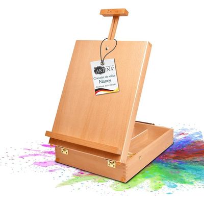 Le grand angle inférieur en bois maintient fermement les photos, toiles, livres, blocs de coloriage et dossiers de travail. Le plan de travail est en bois stratifié robuste qui est également lasuré. La station de travail convainc non seulement lors de la peinture, mais aussi comme chevalet pour la décoration de vitrine, les événements, les foires et les présentations. C'est pourquoi nous pouvons vous proposer des articles de qualité à un prix abordable. Étant donné que la station de travail est particulièrement facile à utiliser, elle est également adaptée aux enfants, aux écoles et aux écoles. Promo Chevalet De Table En Hêtre chez Rougier&Plé La station de travail atteint une hauteur maximale de 34,5 cm. La surface de travail a les dimensions 47 x 35 cm et l'angle inférieur en bois est d'environ 2,5 cm de haut. Type A2 . La surface de travail peut être inclinée et fixée à l'horizontale ou selon 5 angles différents, afin de toujours trouver l'angle de travail adapté à toutes les techniques de peinture. Le réglage horizontal permet même de réaliser toutes les techniques humides, y compris l'aquarelle. Le grand angle inférieur en bois (d'environ 2,5 cm de haut) maintient les tableaux, les... Pupitre A Dessin Paintersisters® Chevalet De Table Planche à Dessin + Station De Travail Taille A3-33x45 Cm, Bois De Hêtre, Pour Peindre + Faire Des Croquis, Acrylique, Aquarelle, Crayon Ou Fusain Planche La surface de travail est adaptée à toutes les techniques de peinture, le réglage horizontal permet même toutes les techniques humides y compris la peinture à l'aquarelle. Cela vous permet de nettoyer facilement la surface. Chevalet de table pour tableau bois de hêtre - Bonne affaire La station de travail dispose de quatre pieds en caoutchouc pour une bonne stabilité. Plusieurs stations de travail peuvent être empilées facilement. Vous trouverez notre gamme complète de produits d'artiste de qualité supérieure chez paintersisters-neuss Veuillez noter : les blocs de dessin représentés sur les photos servent à titre de comparaison de taille et ne sont pas inclus dans la livraison