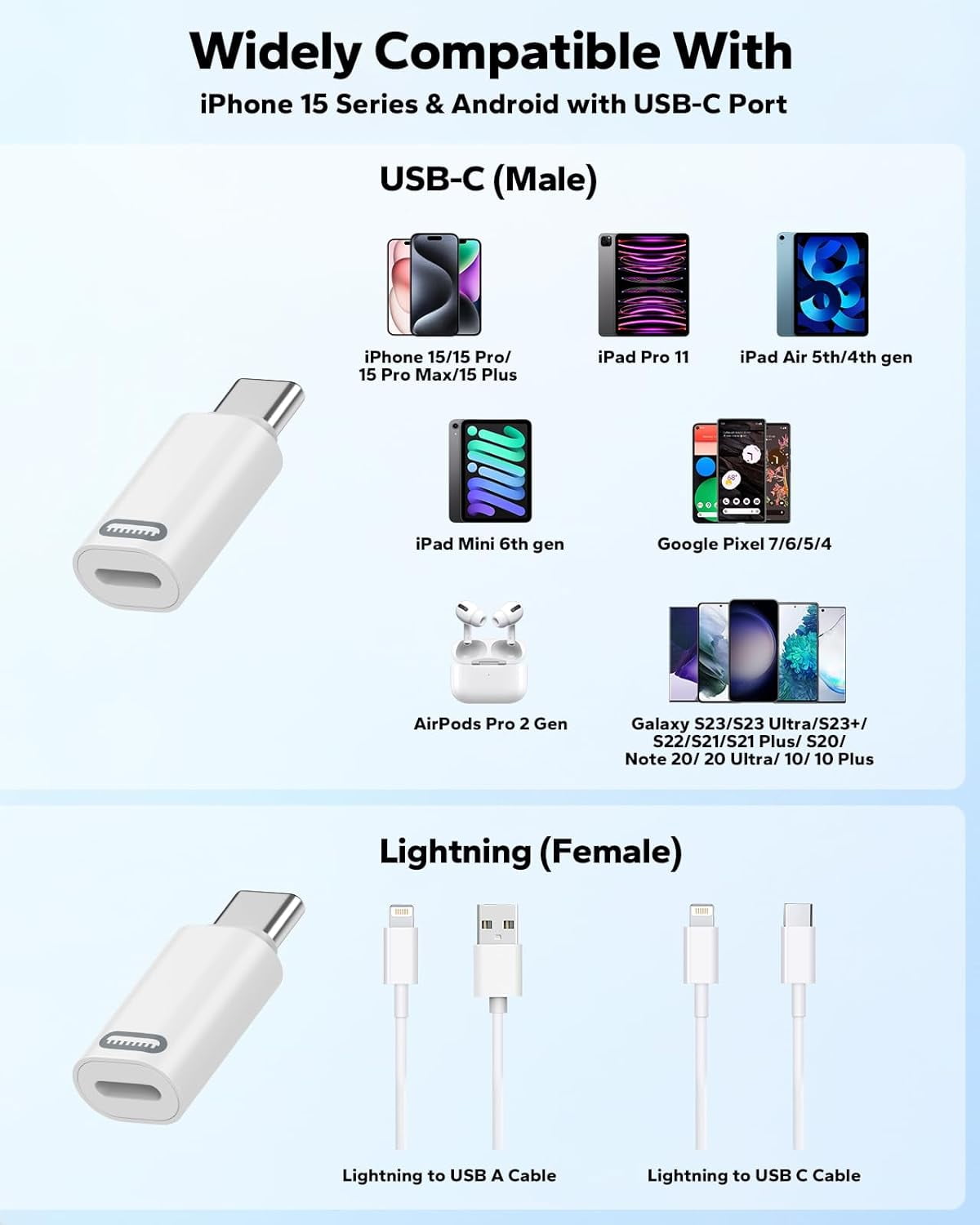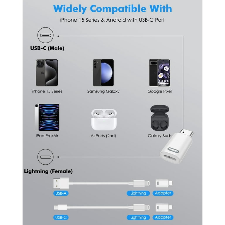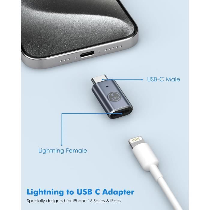 Anti-perte et légèreté Ce adaptateur iPhone 15 16 présente un design minimaliste, chaque adaptateur usb c lightning iPhone 15 16 est livré avec une dragonne en silicone anti-perte ; le design compact de cet adaptateur USB-C permet de le transporter facilement dans votre sac, sac à main ou sacoche d'ordinateur portable. Les Excellentes Performances de l'adaptateur Lightning vers USB C Sûr et durable -L'adaptateur Lightning vers USB C est fabriqué en alliage d'aluminium de haute qualité, avec des puces intelligentes à l'intérieur, avec une protection contre la surcharge, une protection contre le courant stable, qui peut charger votre iPhone 15/16 rapidement et en toute sécurité. [Compatibilité Universelle] Le adaptateur Apple usb c est une solution idéale pour connecter des appareils USB C au câble Lightning. Cet adaptateur lightning usb c ne supporte pas la fonction OTG/Vidéo/Audio;l'adaptateur ne prend pas en charge tous les écouteurs,Apple pencil 1re,la souris,clavier,clé USB,lecteur de cartes,l'imprimante,microphone,convertisseur HDMI,caméra,etc. Cet Adaptateur n'est pas Compatible avec les -Ne prend pas en charge les fonctions vidéo et audio OTG ; -Ne prend pas en charge les écouteurs, l'Apple Pencil (1ère génération), la souris, le clavier ; -Ne prend pas en charge la clé USB, le lecteur de cartes, l'imprimante, le microphone, l'appareil photo, le convertisseur HDMI, le concentrateur. Veuillez noter que cet adaptateur iPhone 15 16 ne prend pas en charge les fonctions OTG et Audio. Chargement Rapide PD et Transfert de Données Apple USB C... Lot de 2 adaptateurs Lightning femelle vers USB C, adaptateur Cet adaptateur Lightning a subi plus de 15 000 tests de débranchement pour assurer qu'il ne se cassera pas. [Ce que vous obtenez] Vous recevrez un adaptateur lightning usb c x 2, Si vous rencontrez des problèmes, nous sommes toujours là pour vous. Cet adaptateur usb c Apple est pour iPhone 16/16 Pro/16 Pro Max/16 Plus,15/15 Pro/15 Pro Max/15 Plus,iPad Pro 11,iPad Air 5e/4e Gén,iPad Mini 6e Gén;Cet adaptateur usb c est pour Galaxy Z Flip 5/Z Fold 5,Galaxy S25/S24/S23/S23 Ultra/S23+/S22/S21/S20/Note 20/20 Ultra/10/10 Plus; adaptateur usbc est pour Pixel 8/7/6/5/5/4,MacBook Pro/Air,et autres appareils usb-c. Nous vous recommandons de l'utiliser en combinaison avec un câble prenant en charge la charge rapide PD (câble USB C vers Lightning). Adaptateur Lightning Vers Usb C Transfert Données Adaptateur Pour IPhone 16 15 2x Adaptateur Lightning Vers USB-C - Charge Et Transfert Données Pour IPhone 16/15, Galaxy S24, IPad Usb C Lightning Connecteur Lightning Femelle USB C Mâle adaptateur Lightning vers USB C 2 pièces, pour iPhone 16 15/Pro Max, Samsung S24/S23, iPad Pro/Air, Macbook ... Air, Galaxy S24, pour Charge, Pas pour Audio/OTG Le Adaptateur Lightning vers USB C Compatibilité Universelle -Pour iPhone 16/ iPhone 16 Plus/ iPhone 16 Pro/ iPhone 16 Pro Max/ iPhone 16E -Pour iPhone 15/ iPhone 15 Plus/ iPhone 15 Pro/ iPhone 15 Pro Max -Pour iPad Air (5ème génération) - Modèle A2588, A2589, A2591 -Pour iPad Air (4ème génération) - Modèle A2316, A2324, A2325, A2072 -Pour iPad Mini (6ème génération) - Modèle A2567, A2568 -Pour iPad Pro 12., 9 pouces (6ème génération) -Pour iPad Pro 12., 9 pouces (5ème génération) - Modèle A2378, A2461, A2379 -Pour iPad Pro 12., 9 pouces (4ème génération) - Modèle A2229, A2069, A2232 -Pour iPad Pro 12., 9 pouces (3ème génération) - Modèle A1876, A2014, A1895 -Pour Pad Pro 11 pouces (4ème/3ème/2ème/1ème génération) ;AirPods Pro (2ème génération) -Pour Mac-Book Air 15 pouces (M2pro, 2023), Mac-Book Air (M2, 2022), Mac-Book Pro(2020/2019/2018/2017/2016) 13., 3'', Mac-Book Air 2020/2019/2018 -Pour Galaxy S25 ultra/S25+/S25/S24/S23/S23+/S23 Ultra/S22/S22+/S22 Ultra -Pour Galaxy S21/S20/S21+/S20+/S10+/S10e/S10/S9+/S9/S8+/S8/Note 20 Ultra/20/10+/10/9/8 -Pour Galaxy Z Fold5/Z flip5/Z Fold4/Z flip4/Z Fold3/Z flip3 -Pour Pixel 3/4/5/6/6a/7/7a/8/8pro/ Nexus 6P etc. La connexion d'un câble USB A à Lightning ne permet qu'une charge normale. Vous pouvez charger rapidement jusqu'à 60W pour certains MacBook, jusqu'à 36W pour certains Pads et jusqu'à 27W pour les iPhone 16/15., Avec cet adaptateur usb c lightning,vous pouvez charger rapidement vos appareils USB-C via un câble Lightning. -Veuillez utiliser l'adaptateur iPhone usb c en combinaison avec un câble qui prend en charge la charge rapide PD (câble USB C vers Lightning). Plug and Play -Grâce à cet adaptateur, vous pouvez recharger votre iPhone 16/15 Series, Galaxy, MacBook, Pad ou appareil Android doté d'un port USB-C à tout moment et en tout lieu avec un simple câble lightning. [Conception Légère et Anti-perte] Cet adaptateur usbc iPhone est doté d'une boucle antiperte en silicone d'une seule pièce qui s'attache facilement à vos câbles;Le design léger et portable vous permet de charger des appareils USB-C n'importe où, n'importe quand avec le câble Lightning, éliminant ainsi le souci de transporter des câbles supplémentaires.