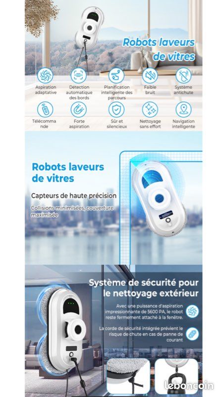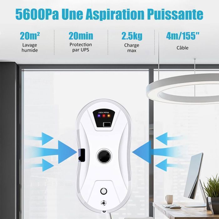C'est à la fois simple et sûr. 🎛️ Télécommande Facile – Ce nettoyeur de vitres est fourni avec une télécommande qui vous permet de démarrer, de mettre en pause ou de changer de mode à distance. Navigation intelligente & détection des bords - Grâce à son algorithme intelligent intégré, le robot planifie automatiquement son itinéraire. La technologie de détection des bords identifie les cadres de fenêtres pour éviter les chutes ou les zones oubliées 5800Pa Puissance D'aspiration, Réglage Intelligent – Le robot nettoyeur vitre dispose d'une puissance d'aspiration de 5800Pa, lui permettant d'adhérer fermement... La technologie de détection des bords identifie les cadres des fenêtres pour éviter les chutes ou les zones oubliées. Test Complet du Robot Nettoyeur de Vitre : découvrez son Même sur de grandes baies vitrées, il couvre chaque recoin pour un nettoyage complet. 🧽 10 Chiffons en Microfibre Lavables et Réutilisables – Les lingettes haute densité sont conçues pour éliminer efficacement la poussière, les taches et les traces sans rayer le verre. Lave Vitre Automatique Schiuma Robot Nettoyeur De Vitres, Robot Laveur De Vitre Automatique Chiffons Microfibre Inclus Il vous suffit d'appuyer sur un bouton depuis votre canapé pour terminer le nettoyage : fini les efforts physiques intenses et les risques de chute ! 💨 5800Pa Puissance D’aspiration, Réglage Intelligent – Le robot nettoyeur vitre dispose d’une puissance d’aspiration de 5800Pa, lui permettant d’adhérer fermement aux baies vitrées, miroirs ou carreaux. Il détecte automatiquement le niveau de saleté et ajuste sa puissance pour un nettoyage efficace.