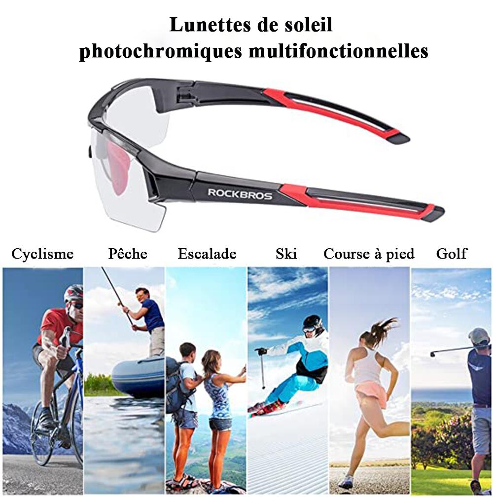 Construction stable : conçues pour résister aux contraintes de la course, ces lunettes de vélo combinent un cadre léger à haute résistance avec des verres robustes résistants aux chocs et un revêtement anti-rayures. Matériau du produit : PC Contenu : 1 paire de lunettes de cyclisme photochromiques. Photochromiques Les verres photochromiques réagissent à la quantité d'UV à laquelle est exposé le verre, ils s'assombrissent au soleil et s'éclaircissent avec une luminosité plus faible Revêtement de protection UV400 bloquant 99,99 % des rayons UVA et UVB nocifs, qui peut éliminer l'éblouissement et réduire la fatigue oculaire en rendant le... Compatibilité polyvalente : ces lunettes de vélo photochromiques combinent une protection pratique contre le vent et la poussière avec un design unisexe intemporel qui est parfait pour toute activité de plein air tout en restant à la mode. Lunettes Cyclisme Photochromiques Kapvoe K70 - Protection UV400, Matériau TR90 - Transparentes à Foncées - Pour Sport Outdoor Insert Correcteur Vue Elles offrent confort et style à tous les utilisateurs et s'adaptent à toutes les occasions, que ce soit pour le cyclisme ou d'autres activités de plein air. La combinaison de fonctionnalité et de look moderne en fait un compagnon idéal pour les modes de vie dynamiques et les applications polyvalentes. Lunettes Velo Lunettes De Vélo Photochromiques Pour Homme Et Femme - Lunettes De Lunettes Sport Unisexe Protection Vent Charnières métalliques réglables : la combinaison de charnières réglables et de plaquettes nasales crée une sensation de pression équilibrée qui s'adapte à toutes les formes de visage et garantit un ajustement stable lors des randonnées à vélo et des activités sportives Les verres photochromiques assurent une vision optimale dans différentes situations d'éclairage et font de ces lunettes un accessoire indispensable pour toute activité de plein air. Caractéristiques du produit : Nom du produit : lunettes de cyclisme photochromiques.