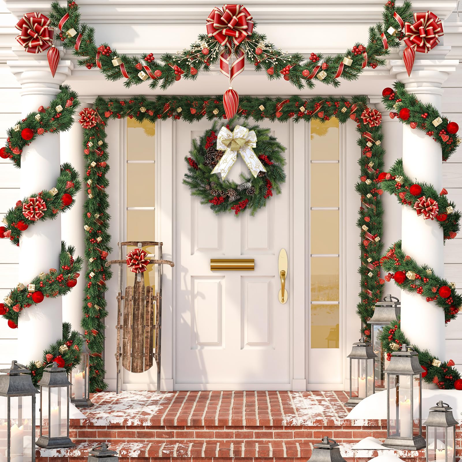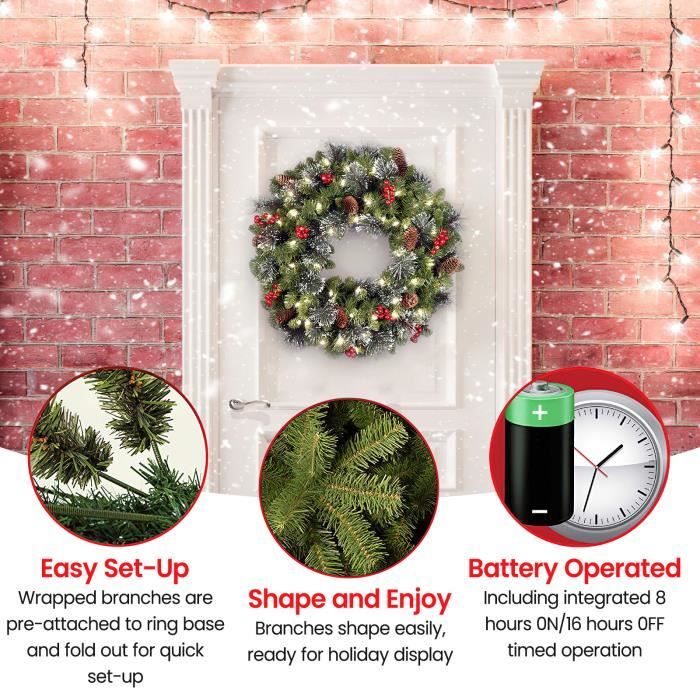 Conception pré-éclairée et fonction minuterie : La couronne de Noël pré-éclairée est conçue avec 35 lumières LED blanc chaud, ajoutant une ambiance chaleureuse et accueillante à votre maison. Apparence luxueuse et vive : La couronne de Noël artificielle comprend 2 types de feuilles, qui sont 25 aiguilles de pin doré et 115 feuilles verdoyantes en PVC. GOPLUS Couronne Noël Porte Lumineuse Artificielle 60 CM, Decoration Noel Entrée avec lumières LED Blanc Chaud, Aiguilles et Pommes de Pin, Baies D'un diamètre de 40 cm, elle combine pommes de pin, boules et fleurs de Noël pour un rendu réaliste et chaleureux. Les LED intégrées créent une ambiance magique... Et les fausses feuilles sont également résistantes aux fissures et à la décoloration, garantissant une utilisation à long terme. Couronne de Noël artificielle avec guirlande d'escalier, fenêtre, porte Application polyvalente : Cette couronne de Noël artificielle pré-éclairée de 60 cm convient à diverses occasions, apportant joie et bonheur à chaque coin de rue. Vous pouvez l'accrocher à la cheminée, au mur, à la fenêtre ou à la porte d'entrée, ajoutant une touche d'élégance à n'importe quel espace. Couronne Noël Goplus Lot De 4 Guirlandes De Noël Pré-éclairées Avec Lumières LED Décoration Porte Fenêtre Cheminée Noël De plus, il est orné de 12 boules décoratives dorées, de 6 grappes de baies dorées, de 6 feuilles vives et de 6 grandes pommes de pin doré, créant un affichage vraiment à couper le souffle. Elle est livrée avec 25 aiguilles de pin dorées et 115 feuilles de PVC verdoyantes, de 12 boules dorées, de 6 grappes de baies dorées, de 6 feuilles vives et de 6 grosses pommes de pin dorée, de 35 lumières LED brillantes qui émettent une lueur chaleureuse, créant une ambiance magique. BONS POINTS: 25 aiguilles de pin poudrées d'or et 115 feuilles PVC scintillantes Avec 12 boules dorées, 6 grappes de baies, 6 feuilles dorées et 6 grandes pommes de pin saupoudrées d'or Lumières LED blanc chaud qui réchauffent l'ambiance nocturne Fonction minuterie : 6 heures d'éclairage suivies d'un arrêt automatique après 18 heures Design sans fil, ne nécessite aucune prise électrique Nouveau matériau PVC ignifuge, inodore, anti-allergène et résistant au décollement Idéal pour suspendre sur la cheminée, la fenêtre, la porte d'entrée ou le mur INFOS SPÉCIFIQUES: Couleur : vert + doré Matériau : PVC, métal Diamètre : 60 cm Nombre d'aiguilles de pin : 25 Nombre de feuilles PVC : 115 Nombre de boules décoratives dorées : 12 Grappes de baies dorées : 6 Nombre de feuilles : 6 Nombre de pommes de pin : 6 Nombre de lumières LED : 35 Poids net : 1,5 kg CE QUI VOUS RECEVREZ: 1 x couronne de Noël pré-éclairée