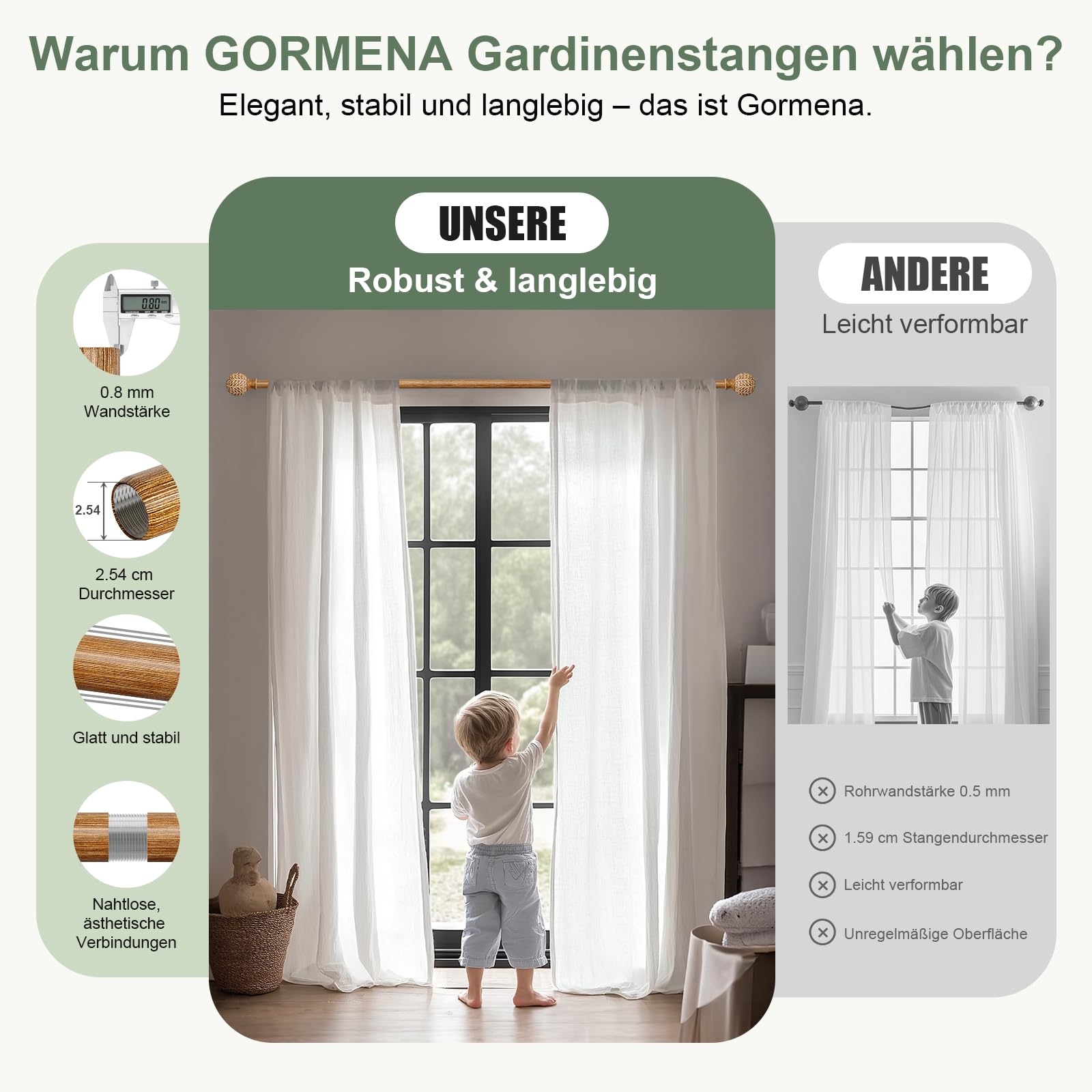 DEFYNEE Tringle à Rideaux Noire, 80-218 cm Extensible, Tringle Rideau 25 mm de Diamètre en Métal Résistant, Ensemble avec Supports Facile à Installer, pour Chambre et Salon : : Cuisine et MaisonÀ propos de cet article Solide et Stable Montage facile et ajustement de la longueur : comprend toutes les pièces de fixation et les instructions (français non garanti) : pièces de tringle fixes, barres télescopiques, embouts, supports métalliques, chevilles, vis et connecteurs. Tringle Avec Embouts Décoratifs Feuilles Tringle Rideau 80-218cm Tringle à Rideaux Extensible Argentée 80-218cm - Style Industriel Avec Embouts Torsadés Support Tringle Rideaux Sans Percage Tringle Rideau 80-218 Cm Aspect Bois Embouts décoratifs en grain de bois : les embouts en résine imitation bois peints à la main avec un motif de feuille élégant donnent à votre décoration de fenêtre un look moderne, rustique ou classique. Qualité et service : chaque tringle à rideau est testée au quotidien pour garantir sa durabilité et son fonctionnement. Notre service client amical est disponible 24h/24 et 7j/7 pour répondre rapidement aux questions et vous aider à choisir. Description Besoin d'une tringle à rideaux adaptable ? DEFYNEE a la solution ! Longueur réglable de 80 à 218cm (disponible en d'autres tailles). En acier de qualité avec finition lisse noire élégante. Diamètre 25mm, supporte jusqu'à 15kg de rideaux - même les plus lourds ! Design minimaliste qui s'intègre à tous les styles de déco. Installation facile avec tout le matériel fourni... Tringle Rideau 350 Cm Tringle A Rideau Double VEVOR Barre A Rideau Stable et portable : fabriquée en métal de qualité supérieure avec un diamètre de 25 mm et une épaisseur de paroi de 0,8 mm, cette tringle à rideau stable peut supporter jusqu'à 13,6 kg sans se plier. Le système d'emboîtement modulaire permet d'ajouter ou de retirer facilement des pièces de tige pour atteindre la longueur souhaitée. Convient pour la chambre à coucher, le salon, la salle à manger, la cuisine, le bureau et plus encore.