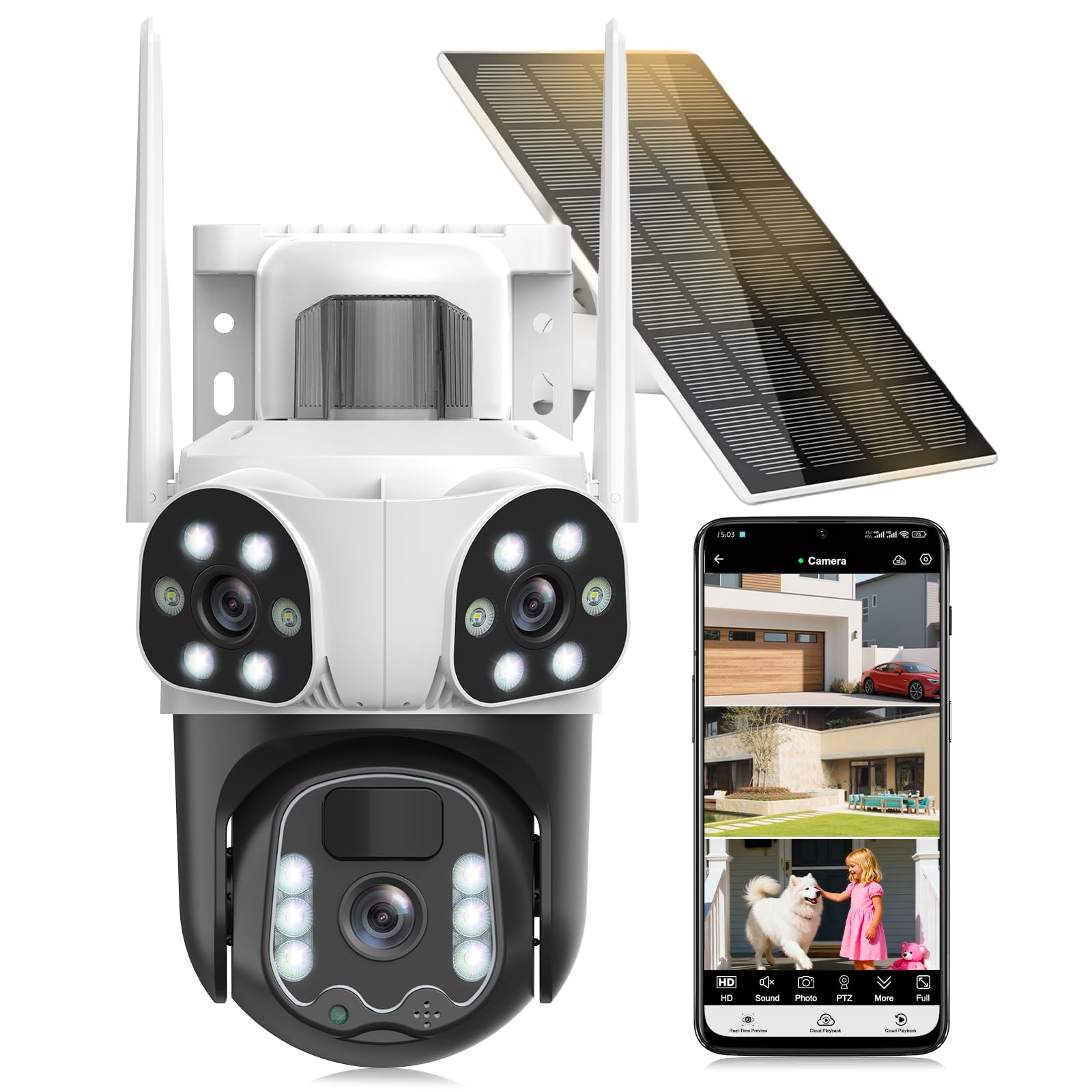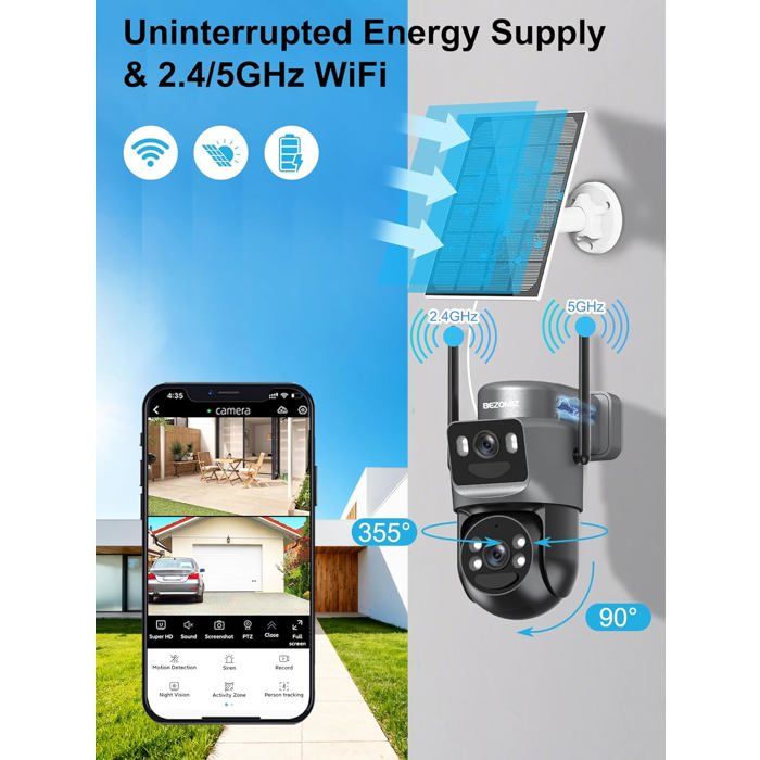 60 secondes après la disparition de la cible, l'appareil photo externe revient automatiquement à l'écran d'origine. Suloron 2K 4MP Caméra de Surveillance Solaire Extérieure Compatible WiFi 2,4GHz et 5GHz, Caméra PTZ Extérieure à 360°, Détecteur de Mouvement PIR, Vision Nocturne Couleur, Audio Bidirectionnel IP66 1 Audio Bidirectionnel 2 Vision nocturne couleur 3 Zone Personnalisée Si vous avez des questions sur nos produits, n'hésitez pas à nous contacter. 【service client professionnel】 garantie de remboursement de 60 jours BEZOMIZ, garantie de 2 ans. 【IP66 & Carte Micro SD/Stockage en Nuage】Camera solaire exterieur wifi sans fil est certifié étanche IP66 et peut être utilisé à l'extérieur par tous les temps. Camera solaire prend en charge une carte mémoire SD jusqu'à 256Go(à l'exclusion de), la fonction unique de cryptage des données de BEZOMIZ et un essai gratuit de stockage dans le cloud de 3 jours pour protéger votre sécurité sous tous les aspects. EN STOCK : Caméra de surveillance 8mp pas cher. Grand choix, promos permanentes et livraison rapide partout en France. Paiement sécurisé Prend en charge le Wi-Fi double fréquence 2,4 et 5 GHz, fournissant des signaux plus forts et des transmissions plus rapides. Camera Surveillance Wifi Exterieure Sans Fil Caméra Surveillance Détection Humaine PIR Suivi Automatique Caméra Solaire Wifi Sans Fil Caméra Surveillance 4K Extérieur Solaire - WiFi 2.4G/5GHz - PTZ 360° - Vision Nuit Couleur Caméra De Surveillance Extérieur Camera Exterieur Sans Fil Les événements sont enregistrés sur une carte Micro SD jusqu'à 256 go (non incluse) et dans le cloud avec des données cryptées et sécurisées. De plus, grâce aux fonctions panoramique à 355° et inclinaison à 90°, vous pouvez voir la situation autour de votre maison grâce à l'application O-KAM Pro. 【 Nocturne en Couleur & Audio Bidirectionnel】 la caméra extérieur offre 3modes de vision nocturne avec une distance allant jusqu'à 30m, image en couleur, vous permettant de voir plus loin et plus clairement. En outre, vous pouvez également parler à la personne surveillée en temps réel par la caméra surveillance extérieure. 【Double Objectif & Double écran 2 en 1】La caméra surveillance wifi extérieure possède 2 objectifs, un objectif fixe (4MP) et un objectif rotatif (4MP), qui peuvent tous être réglés librement en termes d'angle.