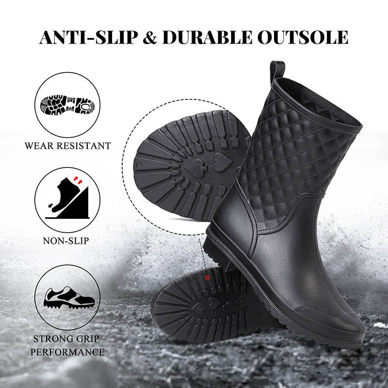 Nos bottes mi-hautes en caoutchouc pour femme offrent le compromis idéal entre protection et confort. Bottes De Pluie Femme Bottes De Pluie Pour Femme En Caoutchouc Impermu00e9able U00e0 Talon Compensu00e9 - Chaussures Aquatiques Pour Femme - Pointure 39,5 - Style Western Classique - Bloc Mi-mollet B-Noir, A-beige Ces bottes en caoutchouc pour femme offrent une protection semi-optimale contre les flaques d'eau et la pluie, tout en restant modernes et adaptées à un usage quotidien. Les bottes mi-hautes en caoutchouc protègent efficacement contre les flaques d'eau et les éclaboussures sans restreindre la liberté de mouvement. Les bottes en caoutchouc imperméables gardent vos pieds au sec. Particulièrement pratique pour une utilisation quotidienne Particulièrement pratique : tige large pour femme avec mollets plus forts. Attention : comme les chaussures utilisent des tailles chinoises, qui sont un peu plus petites que les tailles européennes, nous vous enverrons automatiquement une taille plus grande lors de l'expédition. Faciles à nettoyer et à sécher rapidement, elles vous accompagnent de manière fiable à chaque saison de pluie Pourquoi nos bottes mi-hautes en caoutchouc ? Hauteur de tige parfaite – Protection fiable contre les éclaboussures d'eau sans paraître trop haut ou inconfortable Imperméable & robuste – Caoutchouc de haute qualité pour garder vos pieds au sec Doublure respirante – Pour un confort optimal même en cas d'utilisation prolongée Flexible & léger – Matériau adaptable pour un maximum de confort Variété tendance pour tous les styles Classique-élégant : bottes noires mi-hautes en caoutchouc pour un look intemporel Convient aux festivals : paillettes Aspect ou métallique Accents pour des occasions spéciales - Aspect bottines : avec talon discret pour une touche féminine - Ajustement optimal et confort - Nos bottes mi-hautes en caoutchouc pour femme sont disponibles dans les tailles 36 à 41 et offrent suffisamment d'espace pour chaque pied grâce à leur construction en caoutchouc souple. Que ce soit pour une balade en ville, une promenade ou un festival, ces bottes mi-hautes en caoutchouc pour femme sont polyvalentes. VEVOR Bottes de pont en caoutchouc pour femmes a la cheville, bottes de pluie antiderapantes impermeables, chaussures de boue isolees de jardinage, legeres et durables, pour agriculture, taille 8 US Découvrez nos offres Bottes de pluie femme en caoutchouc : large sélection de produits au meilleur prix | Livraison gratuite à partir de 10€* | Entreprise française | Paiement 4x possible Semelle profilée antidérapante pour une marche sûre sur sol humide.