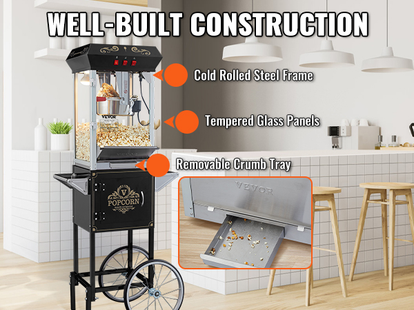 Popcorn Commercial Chariot 850w VEVOR Machine à Pop Corn 850 W, Appareil à Pop-corn De Comptoir Électrique, Bol De 227 G Pour 48 Tasses Par Lot, En Verre Trempé, Avec 4 Cuillères, Style Cinéma, Facile à Nettoyer, Fête Magasin, Noir Machine Pop-corn Commerciale Les accessoires complets le rendent prêt à l'emploi dès sa sortie de la boîte, ce qui rend son utilisation un jeu d'enfant. Puissance (W), 850 W. Équipements, Interrupteur marche/arrêt, Fermeture magnétique, Fenêtres panoramiques, Mélangeur. Fonctions, Maintien au chaud Idéal pour les soldes, promo, Black-Week, ou Black Friday ! Vous êtes sur le bon comparateur de prix si vous cherchez où acheter VEVOR Machine à Pop-corn avec Chariot Électrique 850 W 227 g 48 Tasses... au meilleur prix en France au rayon Machines à Pop-corn Conception conviviale : une fois que le plateau chauffant commence à se remplir, ouvrez simplement le couvercle à charnière en dessous et le pop-corn est là, prêt à être retiré ! Il est temps de savourer lot après lot de pop-corn frais ! Vevor Popcorn Machine VEVOR Machine à Pop-corn Commerciale, 227 Ml, 850 W, Machine Assembly Instructions Accessoires géniaux : cette grande machine à pop-corn est livrée avec une cuillère à pop-corn pour remplir les tasses à pop-corn, ainsi que deux cuillères pour mesurer le maïs et l'huile. Cette machine à popcorn de 227 ml permet de préparer des lots de popcorn frais. Structure durable, facile à nettoyer : cette machine est composée d'un cadre en plaque laminée à froid et de panneaux en verre trempé, conçus pour une utilisation fréquente. Les graphiques imprimés sur le dessus peuvent également attirer les regards affamés. La porte avec un loquet magnétique permet un accès rapide et améliore la présentation du pop-corn à l'intérieur. La collecte et l'élimination des grains tombés n'ont jamais été aussi simples ! Le plateau à miettes amovible maintient l'intérieur propre, évitant la dispersion des grains. Rendement élevé et performances puissantes : cette machine à pop-corn commerciale avec chariot dispose d'une puissance de 850 W et d'une capacité de 227 g, capable de produire 48 tasses de pop-corn (environ 10886 g) par lot, répondant ainsi aux besoins des dépanneurs très fréquentés.