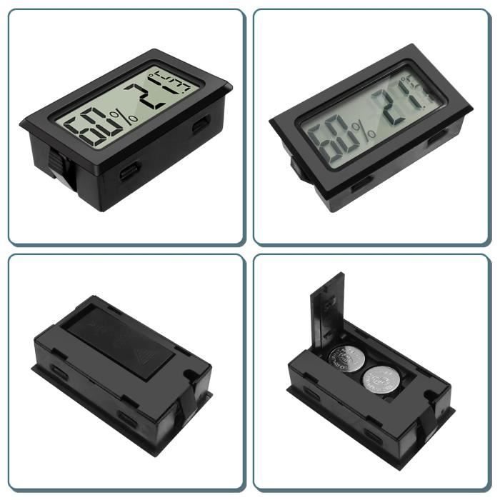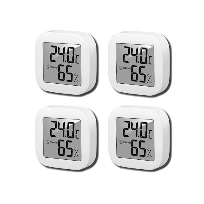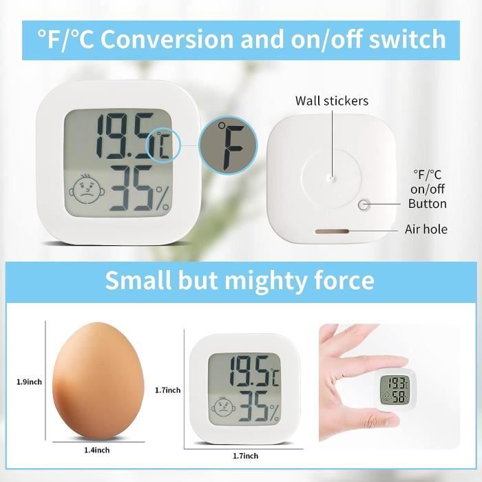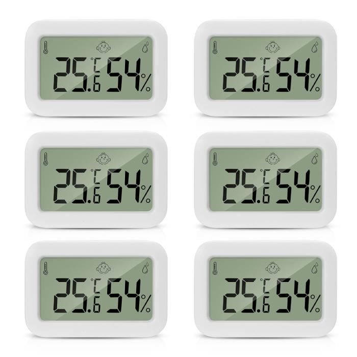 Design compact et installation flexible Avec leurs dimensions réduites (4,3 x 4,3 x 1,3 cm) et leur poids plume (21 g), ces thermomètres hygromètres peuvent être installés de plusieurs façons. Mesures fiables et rapides La plage de température s’étend de -50 °C à +70 °C avec une précision de ±1,0 °C et une résolution de 0,1 °C. L’humidité relative est mesurée entre 10 % et 99 % HR avec une précision de ±5 %. INDICATEUR DE CONFORT – Icônes visuelles indiquant le confort : un visage souriant entre 40 % et 70 % HR et un symbole mécontent si hors de cette plage UTILISATION POLYVALENTE – Thermomètre humidité chambre bébé convient pour de nombreux environnements : chambres de bébé, salons, bureaux, serres, caves à vin, greniers, garde-robes ou entrepôts. Hygromètre Chambre Bébé 6 Pcs Thermomètres Hygromètres Intérieur Digital à Haute Capteur Température Humidité Fiables, faciles à lire et à installer, ils constituent un outil indispensable pour préserver le confort et la santé de votre environnement domestique. Aide à maintenir une atmosphère intérieure saine et confortable Pour simplifier encore l’interprétation, un petit indicateur visuel s’affiche : un visage souriant lorsque l’humidité se situe entre 40 % et 70 %, et un symbole mécontent si elle sort de cette plage. MESURE DE PRÉCISION – Température mesurée de -50 °C à +70 °C avec une exactitude de ±1,0 °C et résolution de 0,1 °C. Utilisation polyvalente : ce thermomètre-hygromètre d'intérieur est idéal pour les serres, les jardins, les étuis de guitare, les incubateurs, les couveuses, les bureaux, les caves, les réfrigérateurs, les placards et tout autre endroit nécessitant une surveillance de la température et de l'humidité Gardez le contrôle de votre environnement intérieur grâce à ce lot de 6 thermomètres hygromètres numériques compacts et précis. Cela permet de savoir immédiatement si l’environnement est confortable ou non. LECTURE CLAIRE ET RAPIDE – Grand écran LCD affichant simultanément la température et l’humidité avec chiffres bien lisibles, visibles même à distance. Affichage lisible et indicateur de confort Chaque appareil thermomètre intérieur d’un écran LCD, facile à lire même à distance. Acheter 6 Pièces Mini Thermomètre Hygromètre Intérieur, Haute Précision Digita... pas cher dans le rayon Stations-météo et thermomètres sur : les meilleurs sites classés par prix, stock, et frais de livraison. Achetez ce produit en comparant les prix. Comparateur de prix en France Mini Digital LCD Thermomètre Hygromètre Température Humidité -50~70 Idéal pour de nombreux usages Que ce soit pour assurer un climat confortable dans la chambre d’un bébé, vérifier l’air d’une serre, conserver vos bouteilles de vin dans les meilleures conditions ou contrôler l’humidité d’une cave, ce lot de 6 hygromètres numériques répond à tous vos besoins.