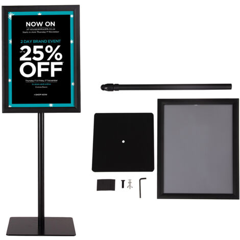 Cadre en alliage d'aluminium durable et léger, panneau PS, film PVC transparent, panneau d'affichage à rotation libre, système de clic pour installation rapide, hauteur réglable, facile à assembler et entretenir Porte-affiche - Le porte-affiche réglable d'Aluanz est idéal pour présenter des informations, des menus, des promotions, des étiquettes de prix ou d'autres instructions au format A3., Pour tout espace - Du bureau au showroom, du magasin au cinéma ou au stand d’exposition : le porte-affiche Aluanz s’adapte parfaitement à chaque environnement. Porte Menu Restaurant Réglable Newzealkids Porte Affiche A3 Sur Pied Présentoir A3 Support Pour Porte Affiche A4 Un excellent support pour communiquer avec les passants - idéal pour présenter votre menu, une affiche ou toute autre information. La base en métal assure une excellente stabilité, même dans les lieux très fréquentés. Hauteur réglable de 70 à 125 cm pour une visibilité optimale. Nous proposons différents designs de porte-affiche : pied fin ou épais, droit ou courbé, rectangulaire ou ovale. Conçus en aluminium ou en acier nos produits sont de couleurs gris clair, noir ou gris foncé pour correspondre à tous les aménagements intérieurs 2 Présentoirs Sur Pied Porte Affiche A3 Sur Pied Hauteur Et Angle Reglable 785 123cm En Acier Inoxydable Noir 91790837 Caractéristiques du présentoir : Format affiche A3 (42 x 29,7 cm), cadre clic avec film de protection pour l’affiche Hauteur réglable Couleur : noir Montage facile Hauteur : 70 à 125 cm Peut être utilisé en orientation portrait ou paysage. Design - Conçu pour être pratique et stable. Le pied rond en métal noir assure une stabilité supplémentaire.