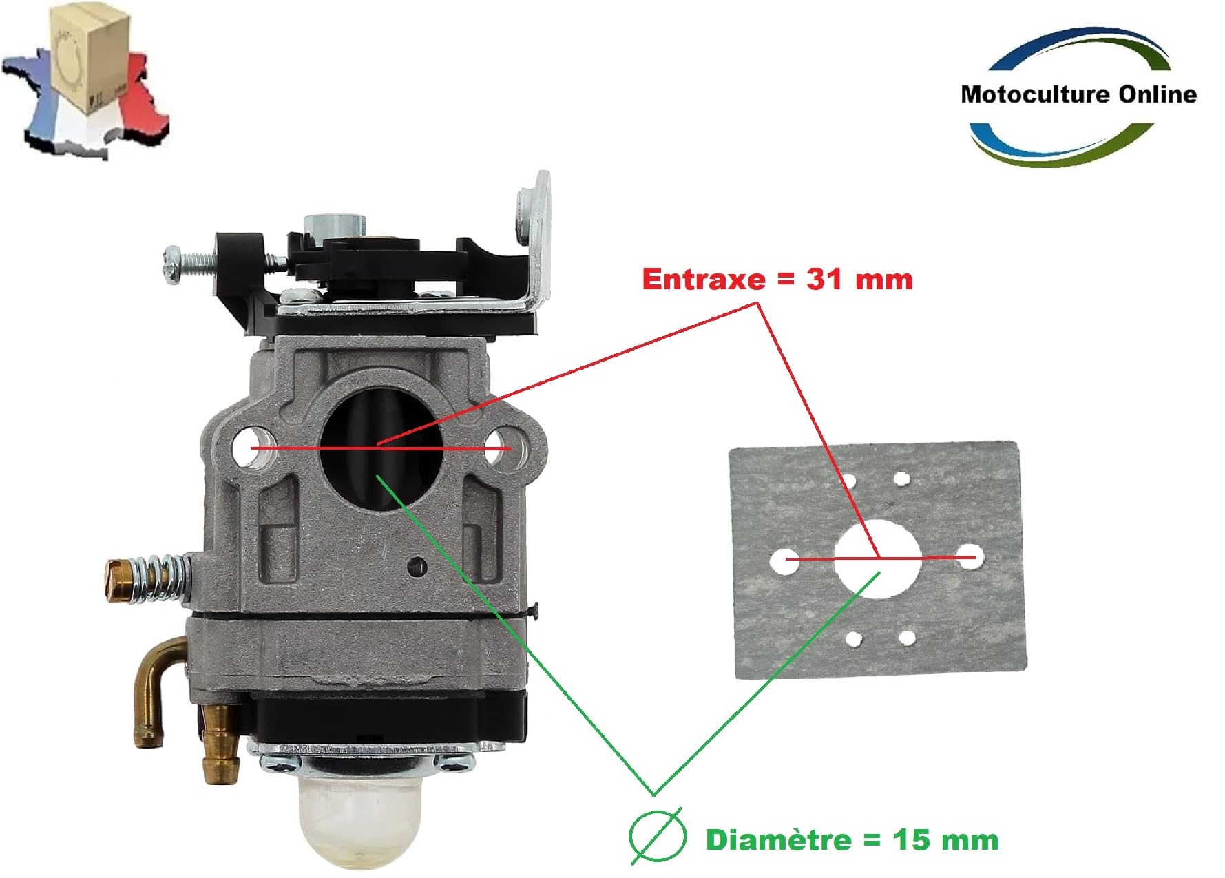 Nombreuses autres pièces détachées sur notre site : www., motoculture-online., fr Entraxe des trous de fixation : 31 mm . IMPORTANT : Merci de bien vérifier votre modèle avant commande ( Toutes les dimensions sur photos ) , vous recevrez exactement le carburateur de la photo . Carburateur Pour Debroussailleuse Pièce Détachée - Constructeur - Carburateur + Joint Entraxe Fixation 31mm Pièce détachée d'origine constructeur: 1x Carburateur Joint pour débroussailleuse Tarière ou Multifonctions 5 en 1 Entraxe des trous de fixation Carburateur moteur KOHLER 3285322S - pièce Pièce Origine Constructeur Carburateur pour débroussailleuse MTD 1035 K moteur Kawasaki