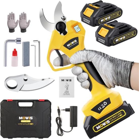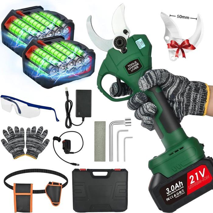 1 Moteur sans Balais 2 Écran LCD 3 Batterie 1,5 Ah Achetez Secateur Electrique sans Fil, 30mm Secateur Electrique Professionnel avec 2 Batteries et Écran LCD, 650W Moteur sans Balais, Lame SK5, Sécateur Électrique pour Jardinage, Vigne, Arbre Fruitier (Rouge) : Sécateurs et ciseaux Le diamètre de coupe maximal est de 30 mm, et la coupe est rapide et fluide, sans endommager les branches. 【Moteur sans Balais Performant】Équipé d'un puissant moteur sans balais à aimant permanent. Vous pouvez tailler des vignes, des cerisiers, des pommiers, des oliviers, etc. Secateur De Jardin Sécateur électrique Professionnel Sécateur électrique Sans Fil Diamètre De Coupe De 30mm 2 Taille-haie électrique Batterie 21V 【Équipé d'un Écran LED et de Réglages de Sécurité】Pour un sécateur électrique, efficacité et sécurité sont essentielles. 【Équipé de deux Batteries】Équipé de deux batteries lithium-ion rechargeables de 21 V/1 500 mAh, chacune offre une autonomie de 30 à 40 minutes et un temps de charge de 1 à 2 heures. Veuillez la charger avant la première utilisation., ) Une fois la batterie complètement chargée et l'interrupteur allumé, appuyez deux fois rapidement sur la gâchette pour démarrer l'appareil afin d'éviter toute erreur de manipulation et tout risque pour la sécurité. Sécateur Électrique Professionnel 30 mm Le produit est équipé d'un écran pratique qui indique la charge de la batterie et le nombre de coupes. Secateur Electrique avec Écran 30