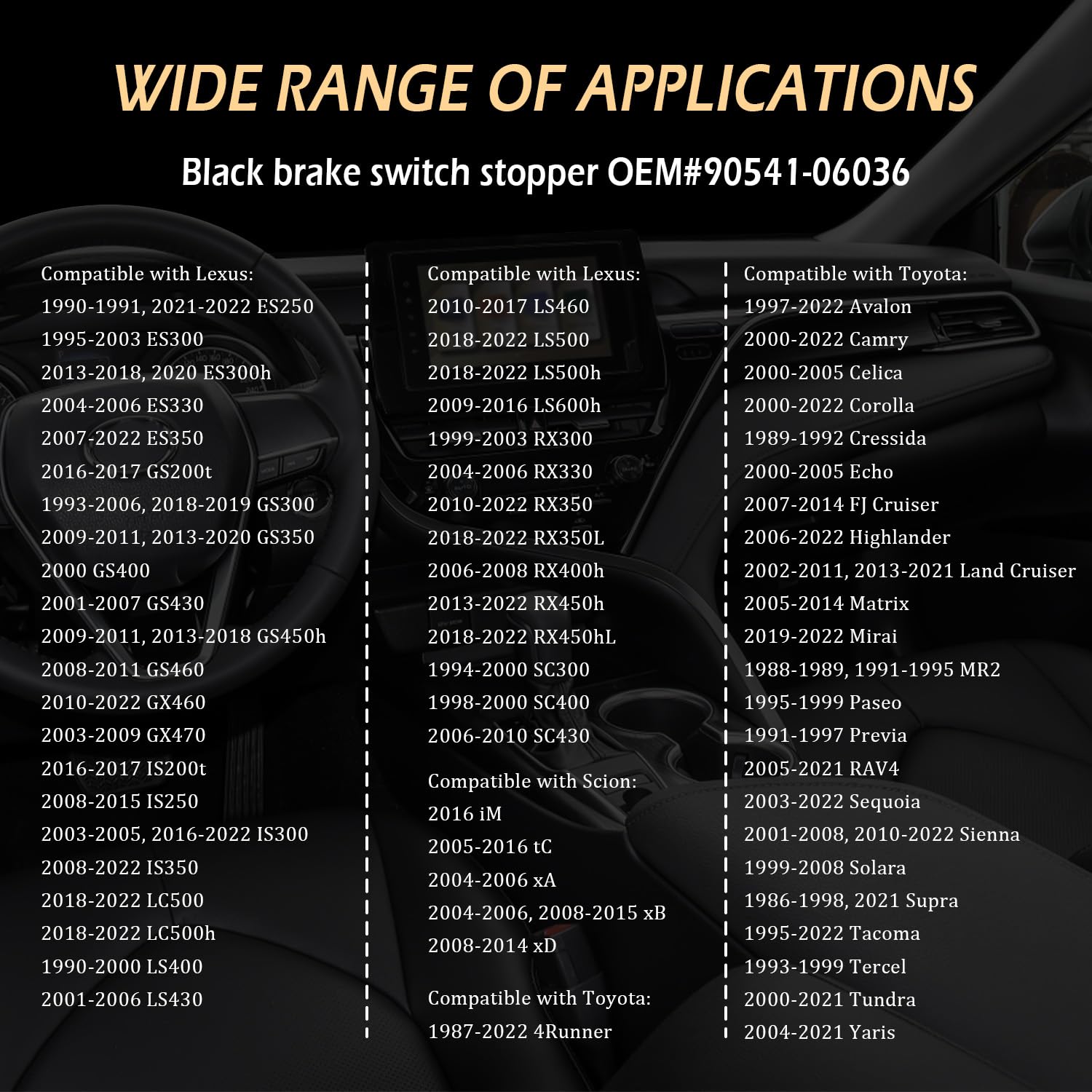 La taille mini est très facile à ranger et à sauvegarder dans la voiture, sans prendre trop de place Véhicule compatible Plaquette d'arrêt de pédale de frein noire OEM #90541-06036 Compatible avec Lexus 1990-1991, 2021-2022 ES250 ES300 1995-2003., ES300h 2013-2018, 2020., ES330 2004-2006., ES350 2007-2022 GS200t 2016-2017., GS300 1993-2006, 2018-2019., GS350 2009-2011, 2013-2020., 2000 GS400 GS430 2001-2007., GS450h 2009-2011, 2013-2018., GS460 2008-2011., GX460 2010-2022 GX470 2003-2009., IS200t 2016-2017., IS250 2008-2015 IS300 2003-2005, 2016-2022 IS350 2008-2022 LC500 2018-2022 LC500h 2018-2022 LS400 1990-2000., LS430 2001-2006., LS460 2010-2017., LS500 2018-2022 LS500h 2018-2022 LS600h 2009-2016., RX300 1999-2003., RX330 2004-2006., RX350 2010-2022 RX350L 2018-2022 RX400h 2006-2008., RX450h 2013-2022 RX450hL 2018-2022 SC300 1994-2000., SC400 1998-2000., SC430 2006-2010., Compatible avec Scion iM 2016 2005-2016 tC., 2004-2006 xA., 2004-2006, 2008-2015 xB., 2008-2014 xD., Compatible avec Toyota. Attributs de la plaquette d'arrêt de pédale de frein Couleurs : noir et blanc., Poids : 11,3 g. Répond à vos différents besoins d'utilisation. Excellent matériau : nous choisissons le caoutchouc de qualité supérieure comme matière première pour ces butées d'interrupteur de feu stop, visant à vous fournir une garantie de qualité solide, résistante à l'usure, durable et non cassante. Accessoire Auto Pédale De Frein Lot De 8 Patins D'arrêt De Pédale De Frein De Voiture OEM # 90541 Bouchon Interrupteur Frein Pour plus de modèles, veuillez consulter la page de détails La surface du bouchon de l'interrupteur de frein est lisse et agréable au toucher. Fonction : résout le problème de l'éclairage continu du feu stop de voiture. Il suffit d'insérer l'extrémité de la plaque d'arrêt au-dessus de la pédale d'embrayage pour que les feux de freinage fonctionnent correctement Ezprotekt Lot de 8 patins de meubles réutilisables pour moquette, 12,7... Ne perdez pas beaucoup de temps et d'argent Fixez les feux stop, utilisez simplement ces petits accessoires de voiture. Guide de l'acheteur : bouchon de commutateur de frein noir OEM #90541-06036, bouchon de commutateur de frein blanc OEM #46505-SA5-000., Veuillez vérifier la pièce d'origine, le modèle, l'année et la marque de la voiture avant de passer commande pour éviter les erreurs d'achat. Ces patins d'arrêt de pédale de frein super pratiques vous aideront à résoudre ce problème. Matériau : caoutchouc de qualité supérieure. Couvercle de pédale de frein Subaru en caoutchouc, paire de patins résistants pour un confort de conduite optimal Teksome Butée de bouton de feu stop, plaquette d'arrêt de pédale de frein - Remplacement des plaquettes de pédale de frein automatique Modèles compatibles : compatible avec Lexus 1990-1991, 2021-2022 ES250, 1995-2003 ES300, 2013-2018, 2020 ES300h, 2004-2006 ES330, 2007-2022 ES355., 0, 2019 6-2017 GS200t, 1993-2006, 2018-2019 GS300, 2009-2011, 2013-2020 GS350, etc.