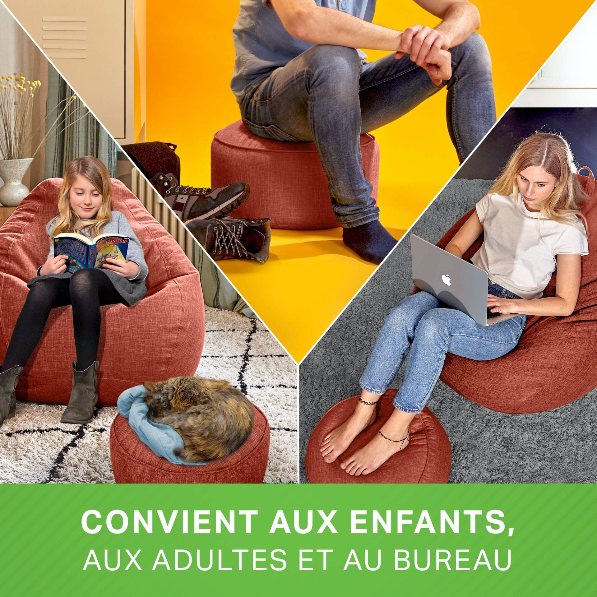 aptitude à la vie quotidienne Chacun dispose d'une housse amovible et lavable en lin de qualité supérieure ainsi que d'un insert rechargeable avec remplissage de perles EPS made in Germany. UNE COMBI PARFAITE : Pour un confort ultime et une convivialité pure : le garnissage flexible du pouf en billes d'EPS s'adapte parfaitement à ton corps dans toutes les positions et reflète ta chaleur corporelle - pour une répartition idéale de la pression, un maintien stable, une position assise confortable et ergonomique et une température de bien-être absolu. Voici les avantages dont tu peux te réjouir Si la housse du pouf se salit, il te suffit de la séparer de l'insert et de la mettre dans la machine à laver à 30°C. Green Bean© Pouf D'intérieur - 45 X 25 Cm - Garnissage En Perles Le remplissage est très simple. s'adapte à la posture et à la forme du corps Nos stars: les billes EPS allemandes Les billes de polystyrène sont ce qui caractérise nos poufs: elles offrent la fermeté nécessaire, mais cèdent aussi facilement et s'adaptent parfaitement à ton corps. Housse extérieure amovible et lavable. Choisis parmi plusieurs couleurs de bon goût - le Bean Bag se combine avec tous les styles d'intérieur. coutures solides et fermetures indéchirables Le fait que nos perles EPS soient produites en Allemagne nous permet de garantir le respect de toutes les normes de qualité. En cas de besoin, elles s'enlèvent grâce à la fermeture éclair intégrée et se lavent sans problème à 30° C dans la machine à laver. C'est le moment de se mettre à l'aise! Pouf Intérieur Confortable Green Bean© Set De 2 Pouf D'Intérieur + Tabouret Avec Remplissage De Perles EPS - Repose-Pieds Coussin De Pieds Sol Repos Siège Lounge Chair Chaise Fauteuil Relaxation Bean Bag Jaune Housse Lavable Coton Polyester POUF + Tabouret : Set de luxe pour Intérieur composé d'un pouf de taille L (80 x 90 x 50 cm) ou XXL (100 x 120 x 50 cm) et d'un repose-pieds assorti (25 x 45 cm). en 60% coton et 40% polyester , lavable et rechargeable DANS LE CONFORT : Se vautrer dans le pouf, mettre les pieds en l'air et se détendre : c'est possible avec le pouf et le repose-pieds - pour passer des moments agréables en famille ou entre amis, devant la télé, en lisant ou tout simplement en se relaxant. Et lorsque des visiteurs s'annoncent, le pouf sert tout simplement de tabouret. Des contrôles fréquents permettent de s'assurer que le matériau de remplissage ne contient pas de substances nocives pour la santé. Dimensions du pouf : 80 x 90 x 50 cm (taille L), 100 x 120 x 50 cm (taille XXL). Disponible en beige/sable, rouge, bleu foncé, gris argenté & gris foncé. Avec dossier et anse Le Bean Bag est le siège idéal pour les enfants, les adolescents et les adultes. Green Bean© Set de 2 Pouf d'Intérieur XXL Tabouret avec Remplissage de Perles EPS - Repose-Pieds Coussin de Pieds Sol Repos Siège Lounge Chair Chaise Fauteuil Relaxation Bean Bag Gris Foncé Asphalte Mais cela ne devrait pas être nécessaire trop souvent, car la housse extérieure repousse la saleté et l'eau. Présentation du produit Set de 2 Pouf Tabourets - Green Bean© - Turquoise - Robustes et lavables - Enfants & Adultes Le set de 2 pouf tabourets Green Bean© est un duo imbattable pour un confort ultime. Les housses sont résistantes et lavables en machine. Le remplissage en perles EPS s'adapte à toutes les positions pour une position assise confortable et ergonomique. Convient pour l...