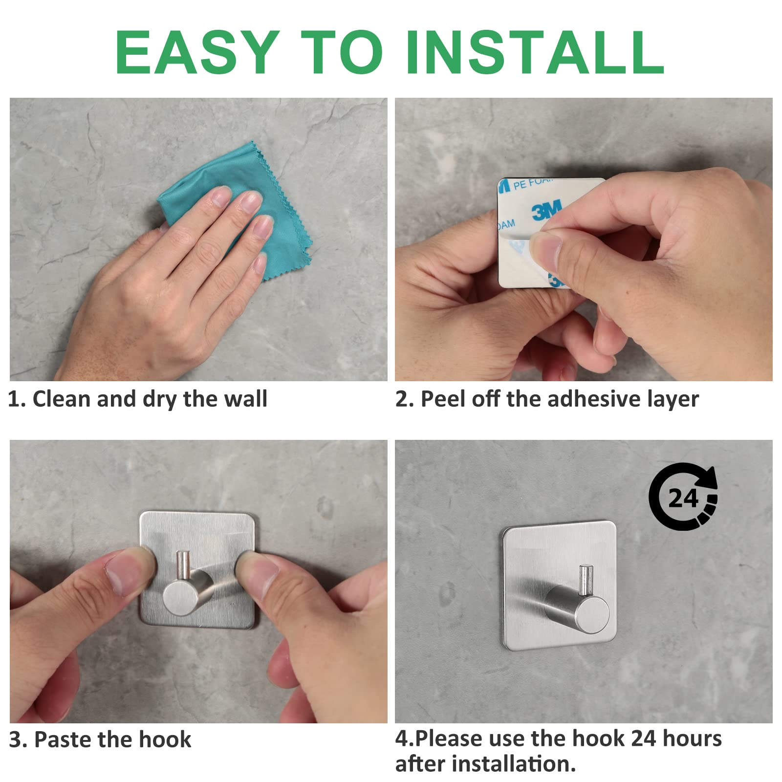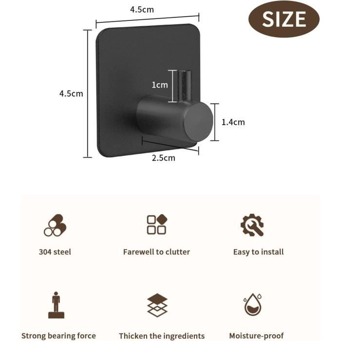 N'endommage pas le mur ou le verre. Les clients trouvent que les crochets sont idéaux pour fixer des serviettes de salle de bain ou des torchons sur un mur. Ils sont également satisfaits de la facilité d'installation et de leur côté pratique Fabriqué en acier inoxydable SUS 304 de haute qualité Antirouille, étanche et facile à nettoyer L'adhésif 3M offre une forte adhérence et protège contre l'eau Forte capacité de charge pour répondre à vos besoins quotidiens Peu encombrant, durable et facile à utiliser Chaque chose à sa place. 【Polyvalence Pratique】Les crochets mural conviennent aux surfaces lisses telles que le carrelage, le bois, le marbre, le verre, etc. Si vous avez des questions après l'achat de notre crochet adhésif, n'hésitez pas à nous contacter. Universellement applicables dans la salle de bain, la cuisine, la chambre, le bureau, etc. Dimensions: Environ 4,5 x 4,5 x 3,0 cm / pièce , Poids: 53g/pièce , Couleur: Noire , Paquet : 4 pièces , Conseils Amicaux 1., Les crochets adhesif doivent être utilisés sur des surfaces lisses., 2., Le crochet adhésif ne laisse aucun résidu. Crochet Autocollant Adhesif Acier Inox, 4 Pièces Crochet Adhésif 3M 【Qualité Solide】L'adhésive 3M de crochet adhesif dispose de la meilleure adhérence, 100% résistante à l'eau et peut accrocher des serviettes de bain, peignoirs, vêtements, chapeaux, sacs, clés, etc. Caractéristiques Matériau: Acier inox SUS 304 【Matériaux de Haute Qualité】Crochet adhesif est en SUS 304 acier inox et la surface est en technologie de tréfilage multicouche, qui résiste aux rayures. Matériau : nos crochets adhésifs sont fabriqués en aluminium sablé de haute qualité, qui est résistant à la corrosion, à la rouille et aux rayures, assurant une haute résistance et durabilité pour une utilisation en intérieur et en extérieur Porte Serviette Adhésif BOXLUNT Crochet Adhesif Mural 4 Pièces, Acier Crochet Adhésif 3M Il vous suffit de chauffer le crochet avec le sèche-cheveux, puis de le retirer avec un couteau., 3., Veuillez ne pas suspendre de produits en surpoids, coûteux ou fragiles., 4., Veuillez utiliser le crochet 24 heures après l'installation.